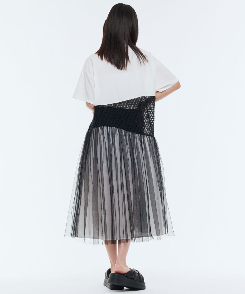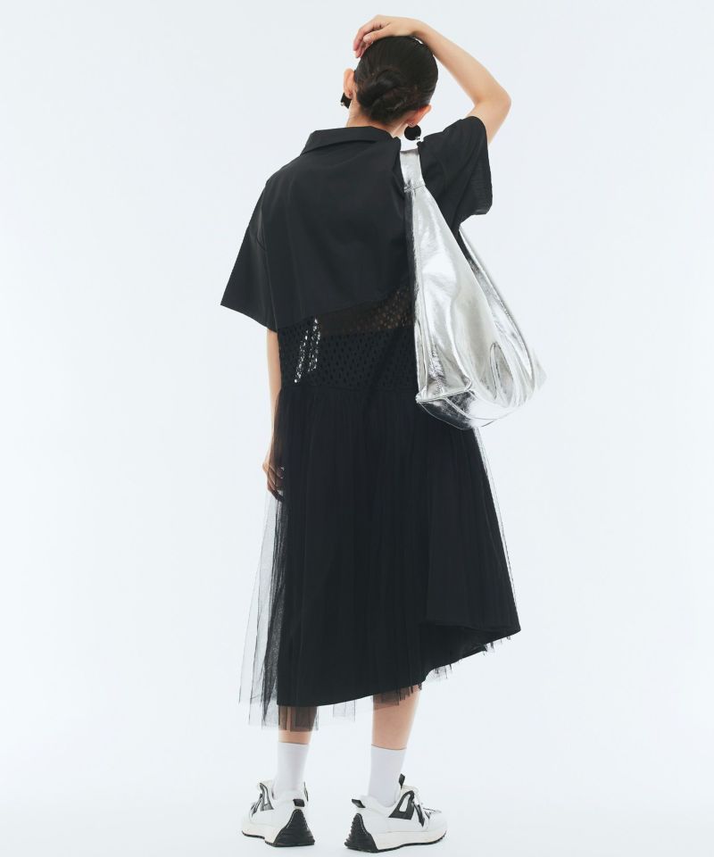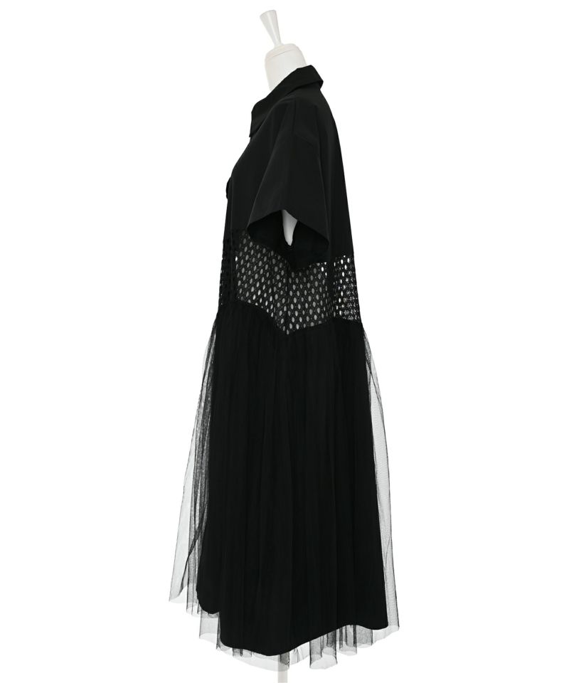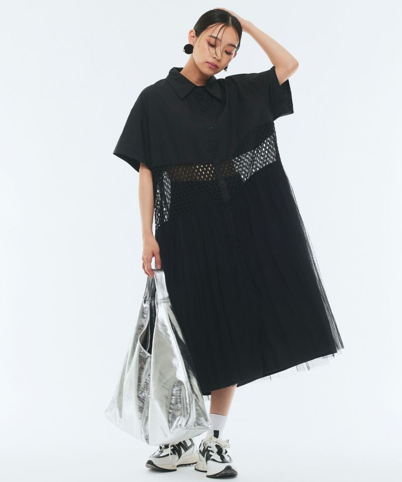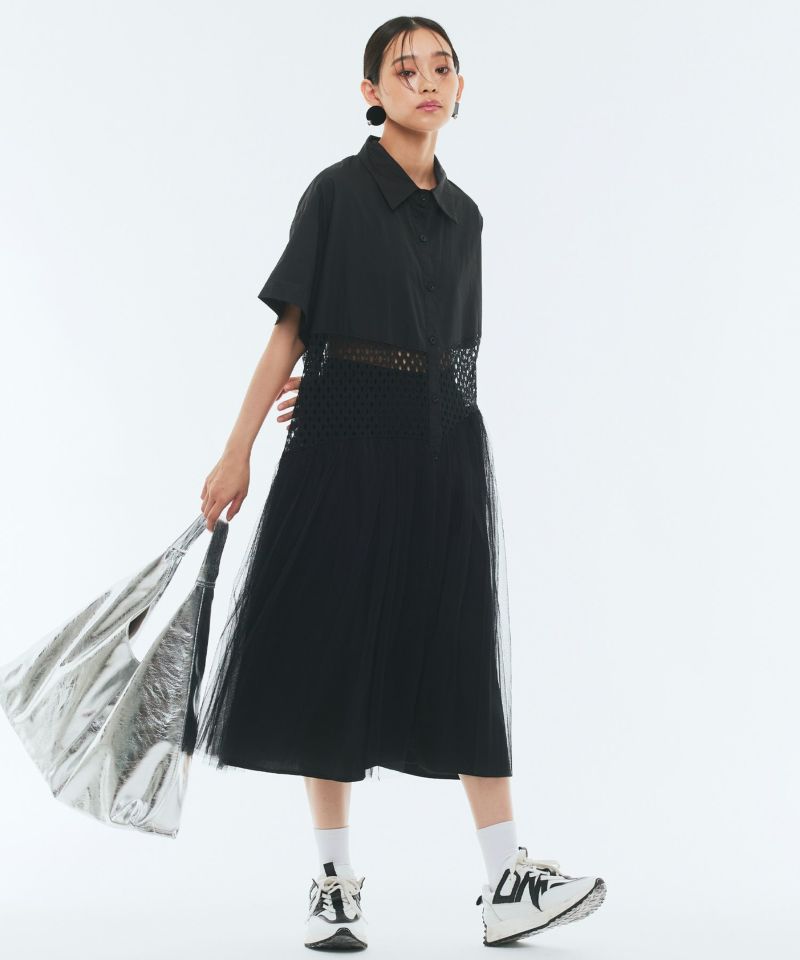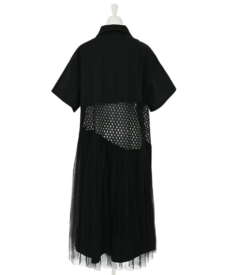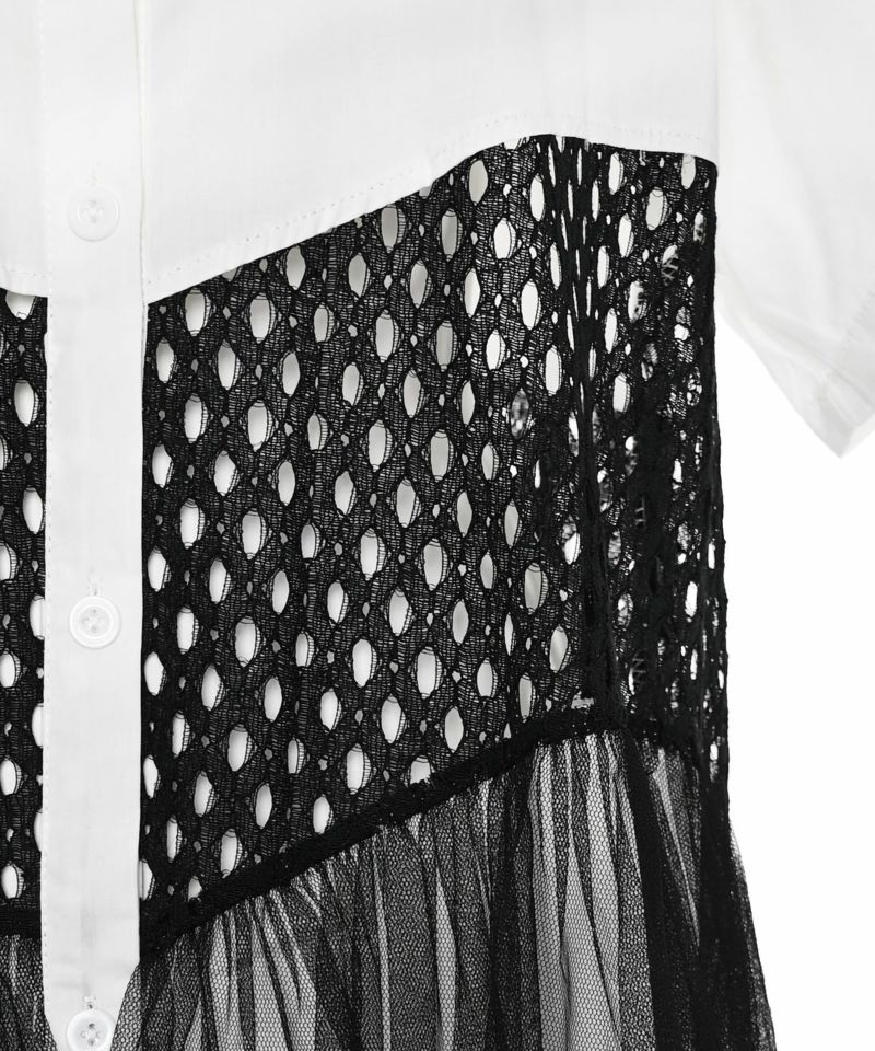 ロングシャツにメッシュ素材とチュール素材をドッキングさせた一枚でスタイリングが完成するモードな雰囲気のデザインワンピース。ゆったりとしたシルエットに、メッシュデザインが抜け感をプラス。スタイルアップ効果のあるハイウエスト切り替えで、ボタンを開けると羽織りとしても着用可能なアイテム。肌見せが苦手な方やインナーの切り替えが気になる方は、タイトなワンピース等がオススメです。カラー物をインナーに取り入れるとお洒落上級者に。【model】H160 B80 H85/H163 B78 H84
