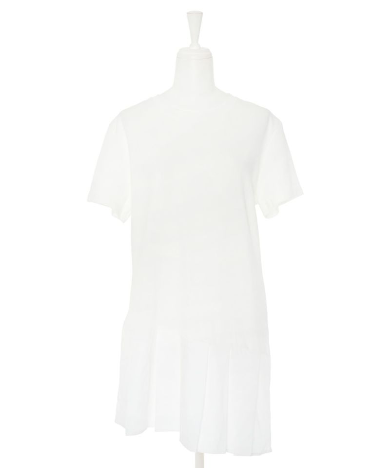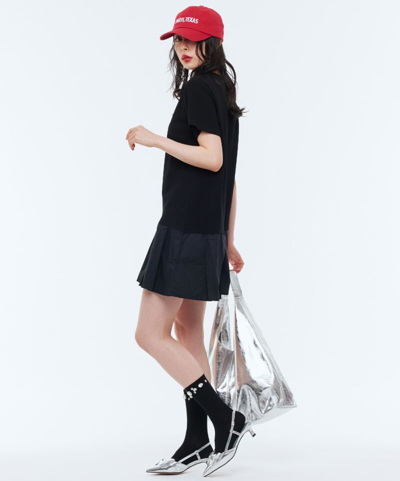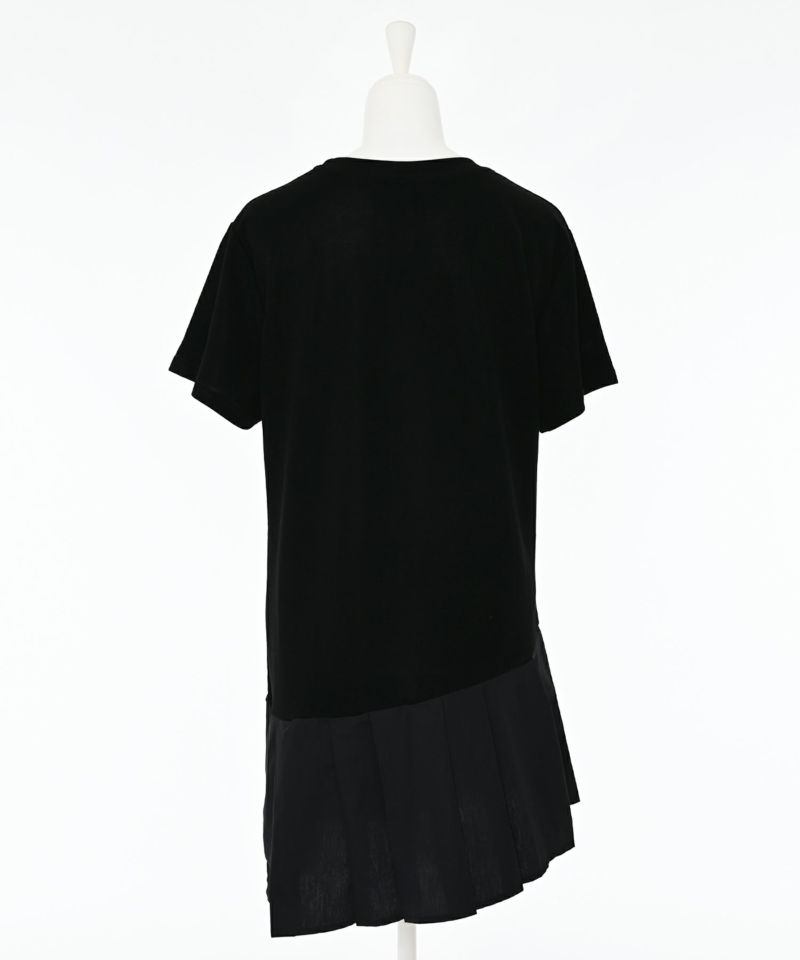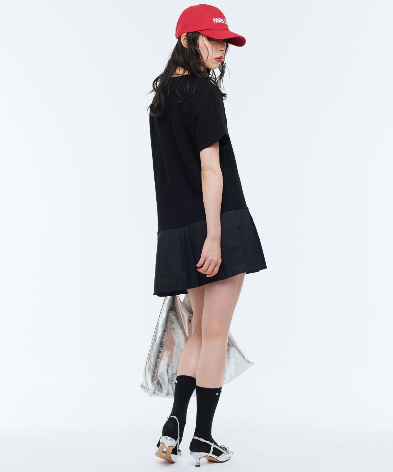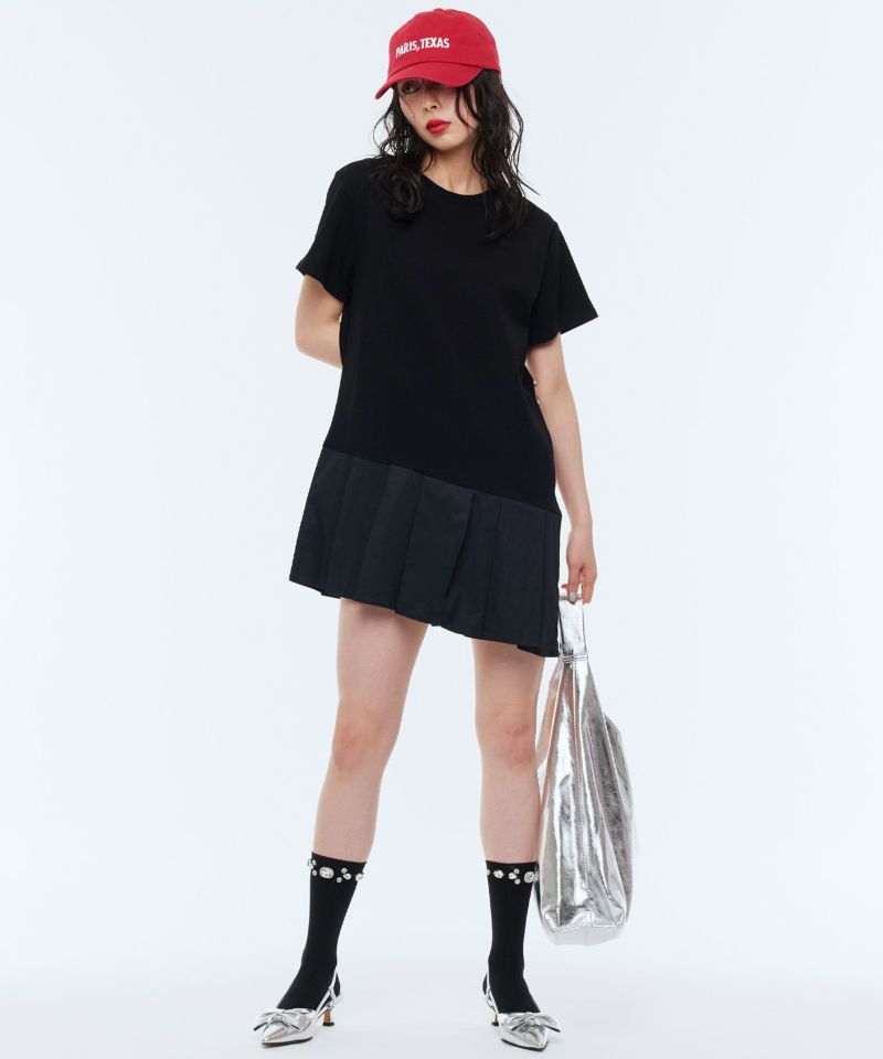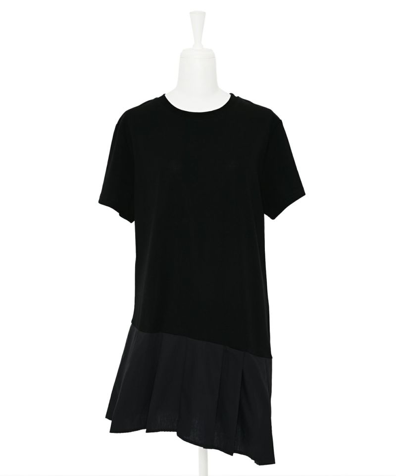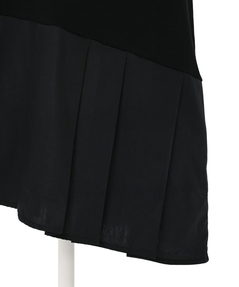 異素材MIXのプリーツアシンメトリーワンピース。身頃とプリーツの切り替えデザインがお洒落。一枚でスタイリングが叶う万能アイテム。つけ襟やビスチェ等をレイヤードするのもオススメ。 モデル身長:165㎝