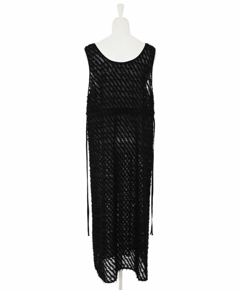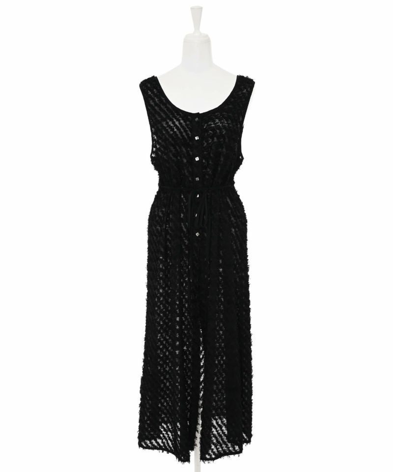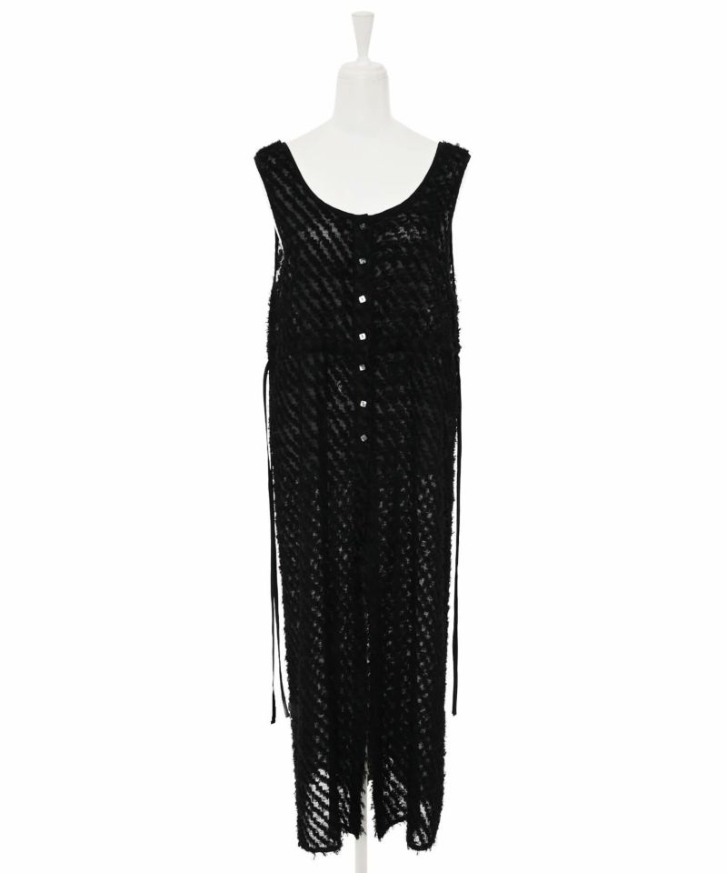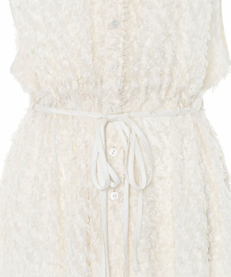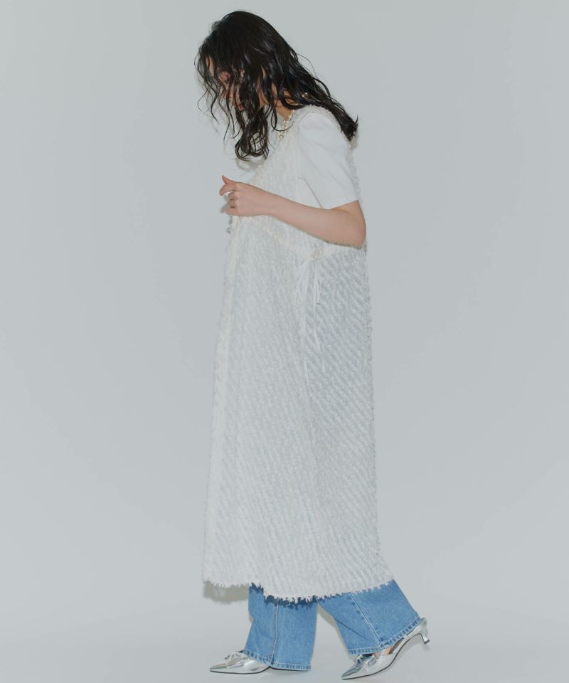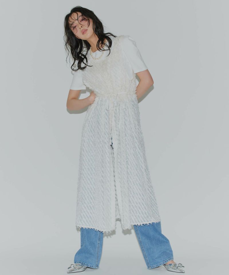 前後2WAY仕様でワンピース着用&ボタン開けてジレとして着用できる着回し力抜群のアイテム。シーズンライクな透け感のある素材にフリンジデザインを採用。一枚ではもちろん、普段のコーディネートにプラスするだけでトレンド感アップの万能アイテムに。ウエストリボン付き。【model】H165 B78 H83