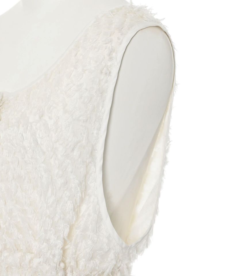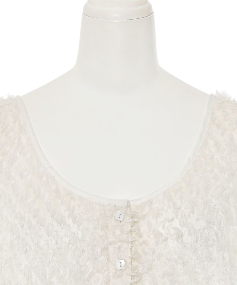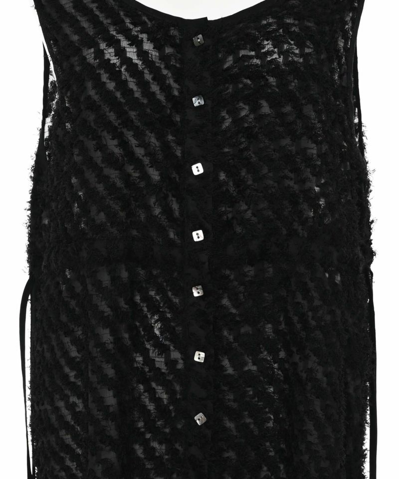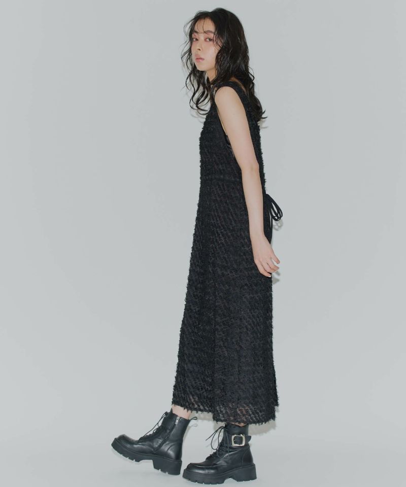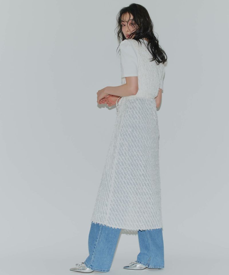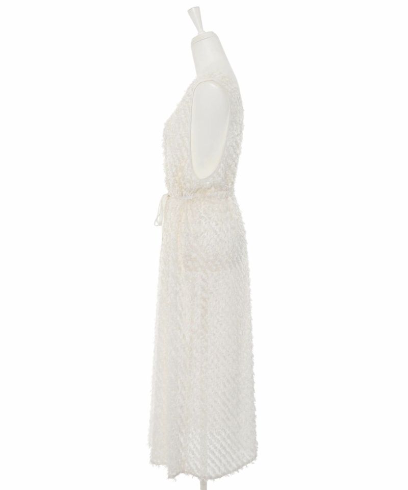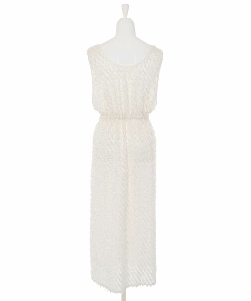 前後2WAY仕様でワンピース着用&ボタン開けてジレとして着用できる着回し力抜群のアイテム。シーズンライクな透け感のある素材にフリンジデザインを採用。一枚ではもちろん、普段のコーディネートにプラスするだけでトレンド感アップの万能アイテムに。ウエストリボン付き。【model】H165 B78 H83