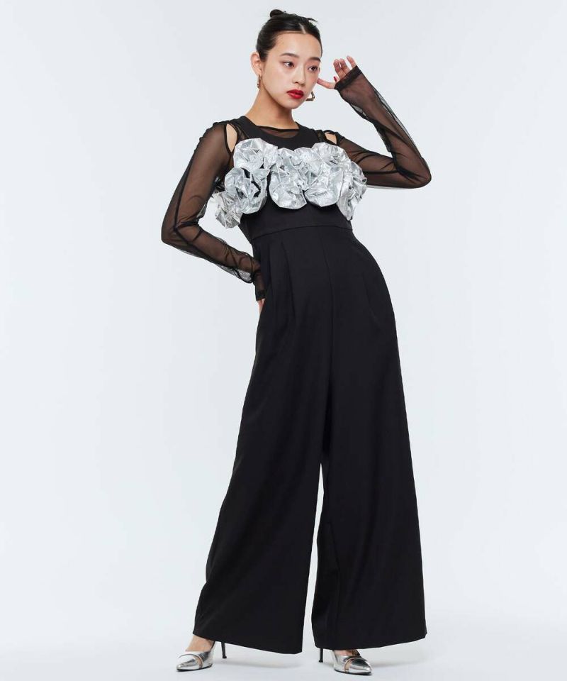 メタリック素材を使用したビスチェ&ショルダーカットデザインのシアートップス&オールインワンが3点セットになったアイテム。それぞれ単体使いも可能なので、着回し力抜群◎