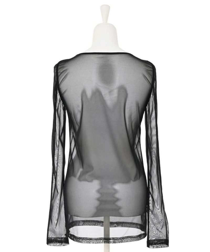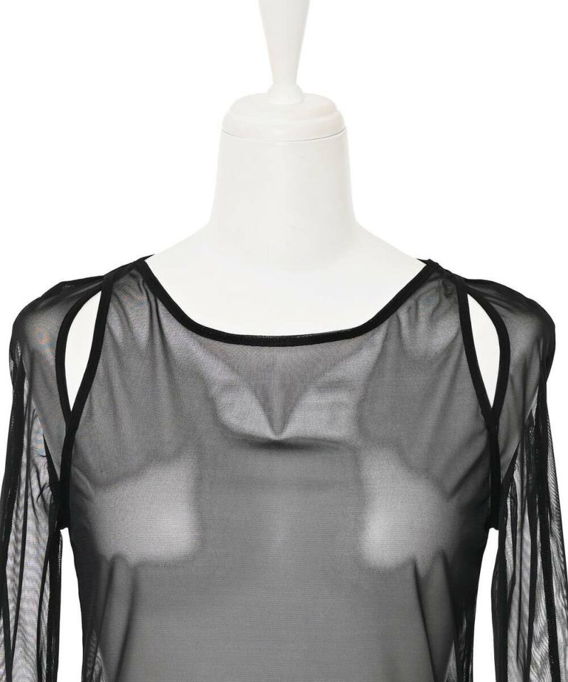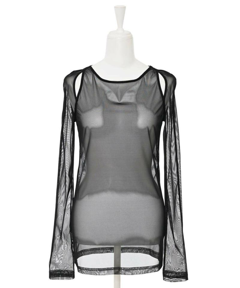 【シアートップス】:ショルダーカットされたシンプルなアイテム。レイヤードスタイルには欠かせない一点。