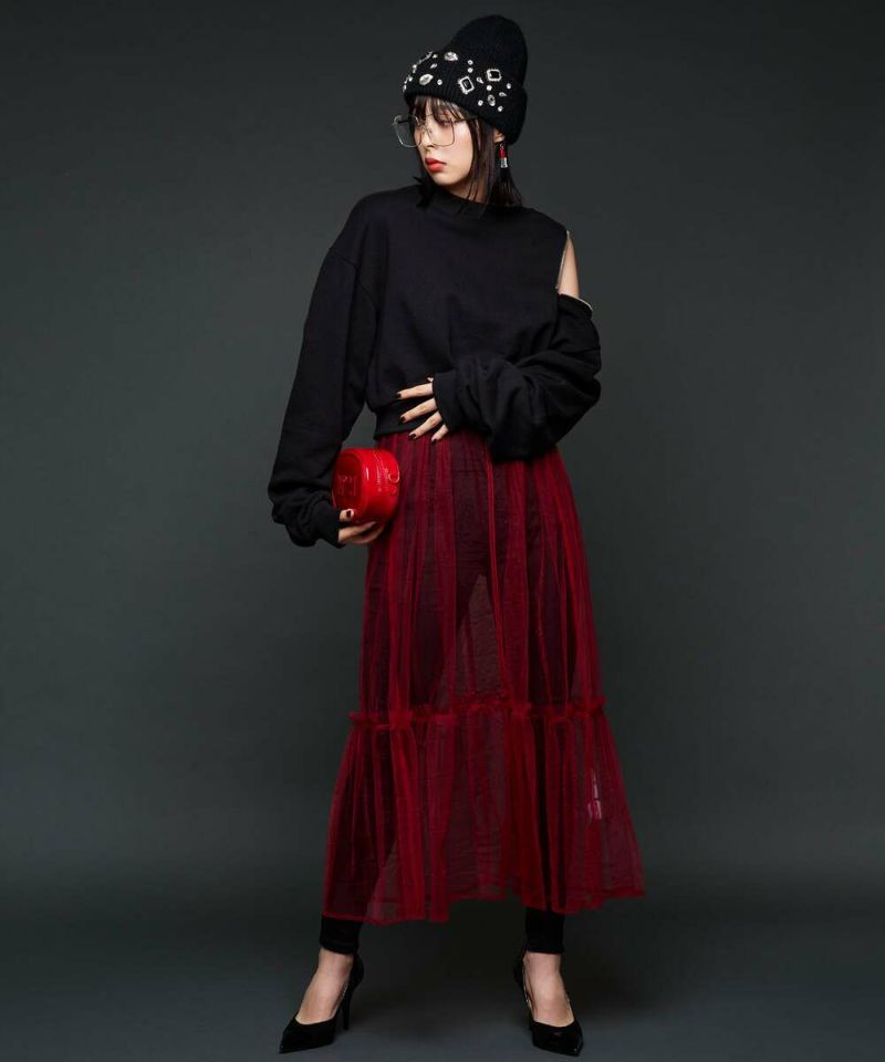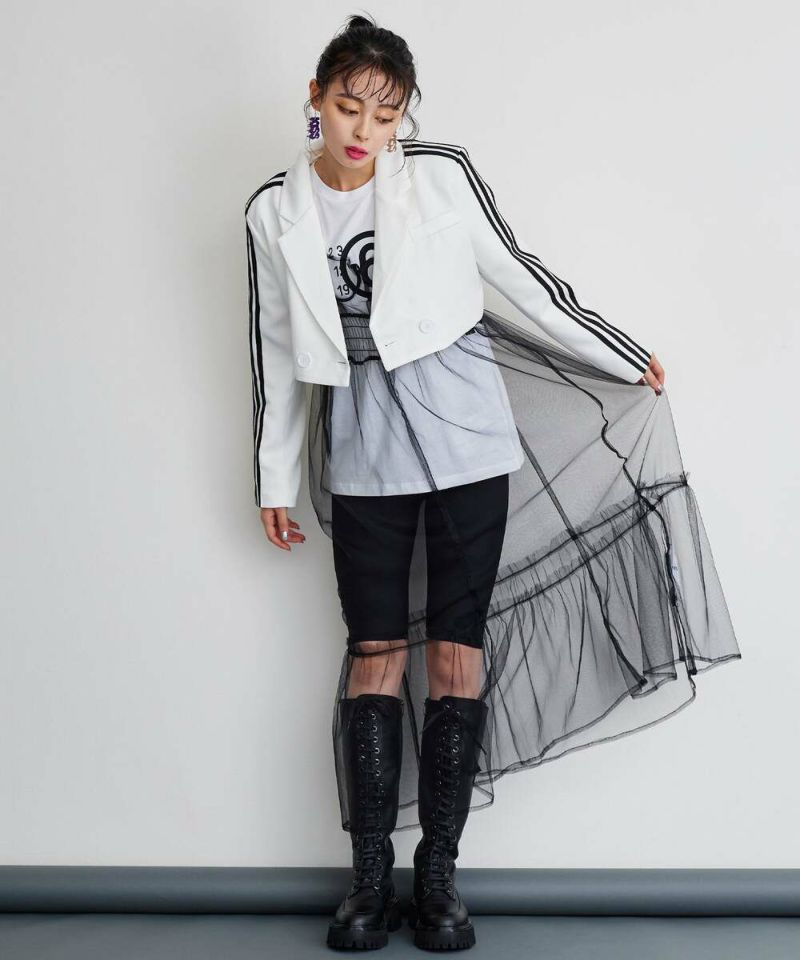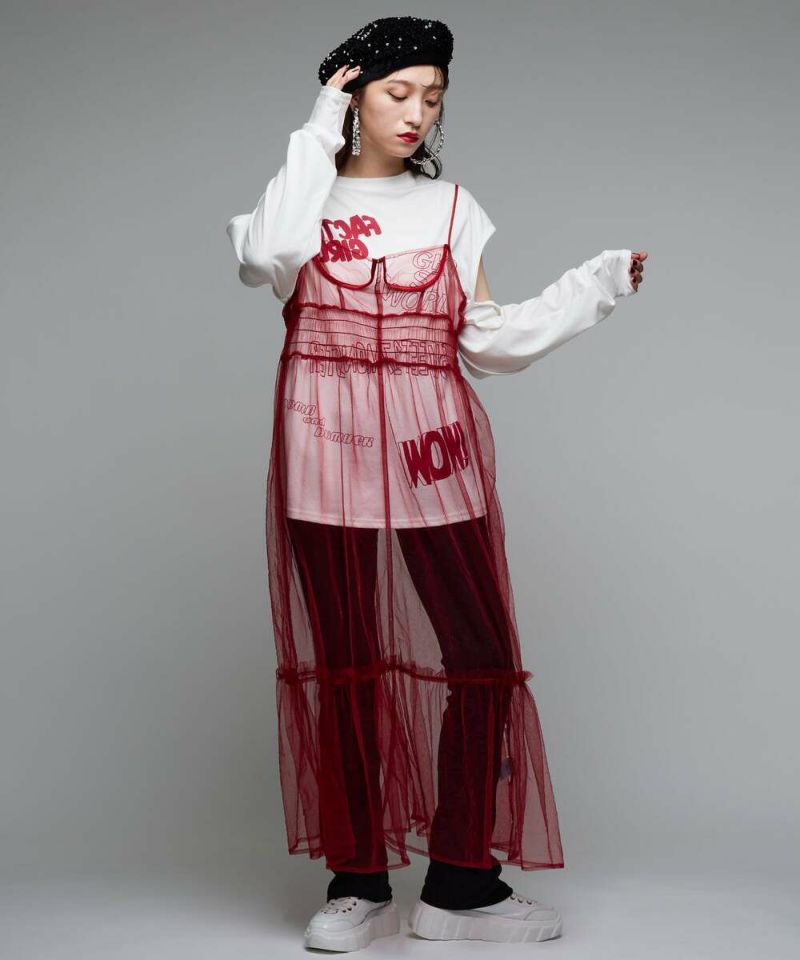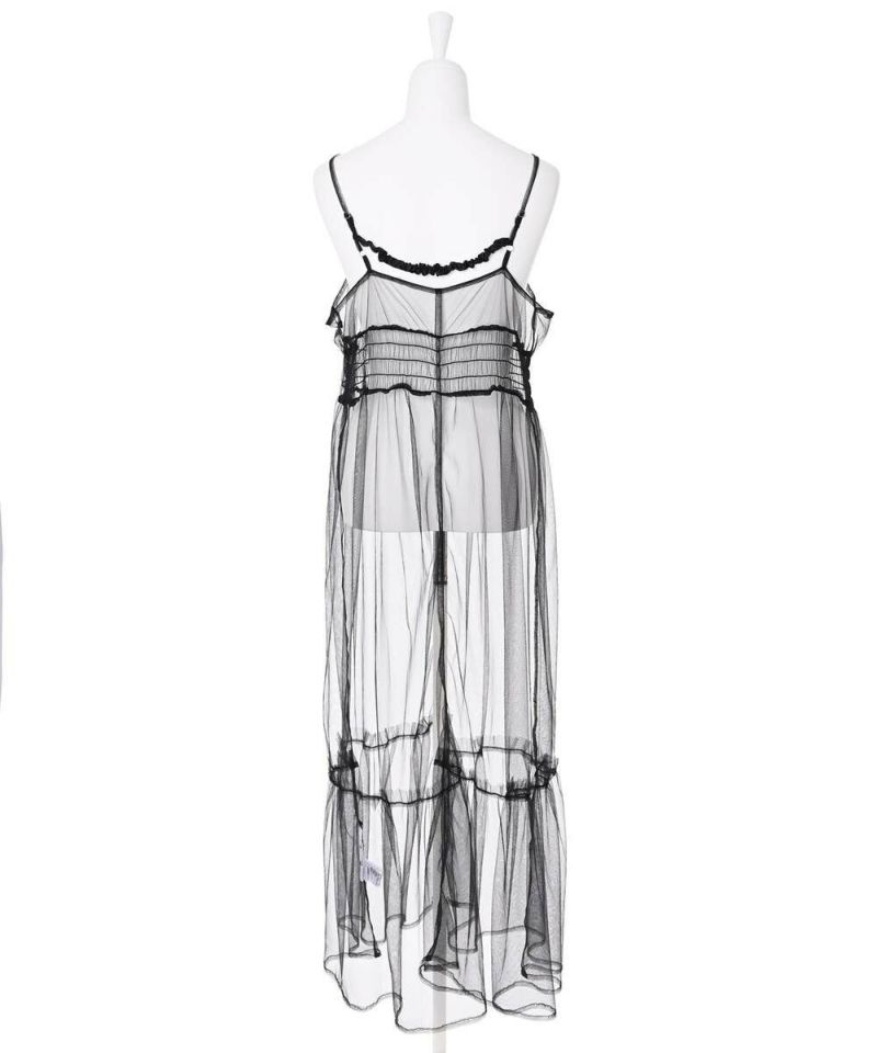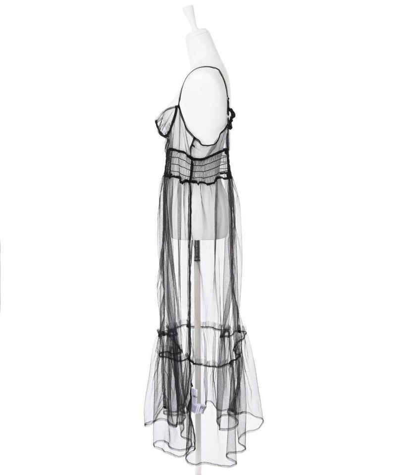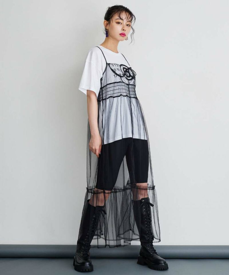 ビスチェ風ディティールと裾に施されたギャザーがドレッシーさ溢れるチュールドレス。普段のコーディネートにプラスするだけで特別感のあるスタイリングに。肩紐で長さ調整が可能。【model】H160 B80 H85/H165 B78 H83