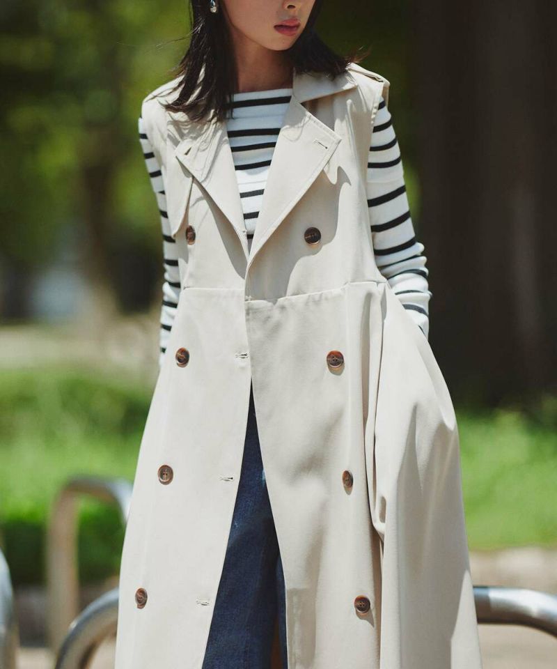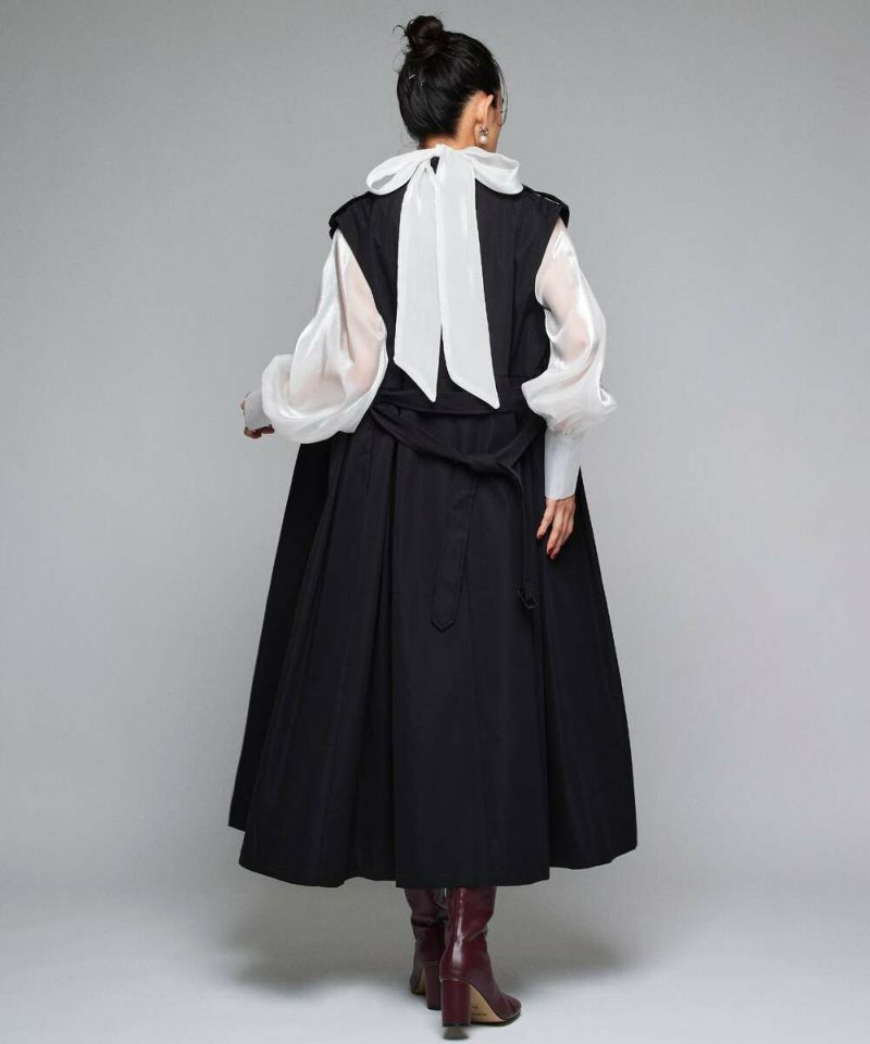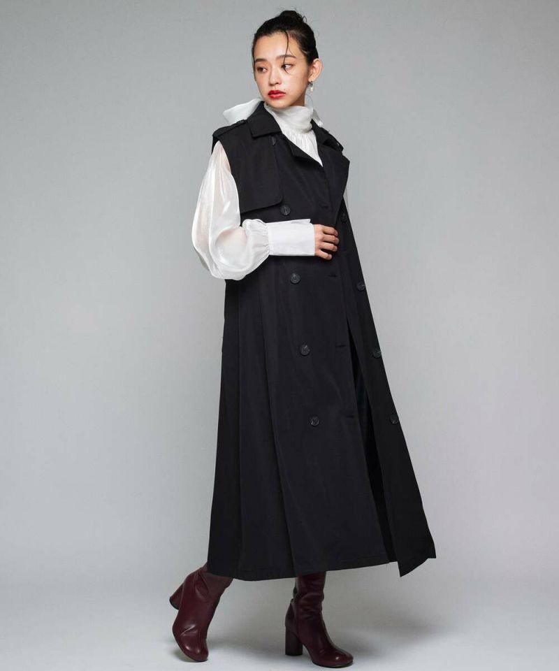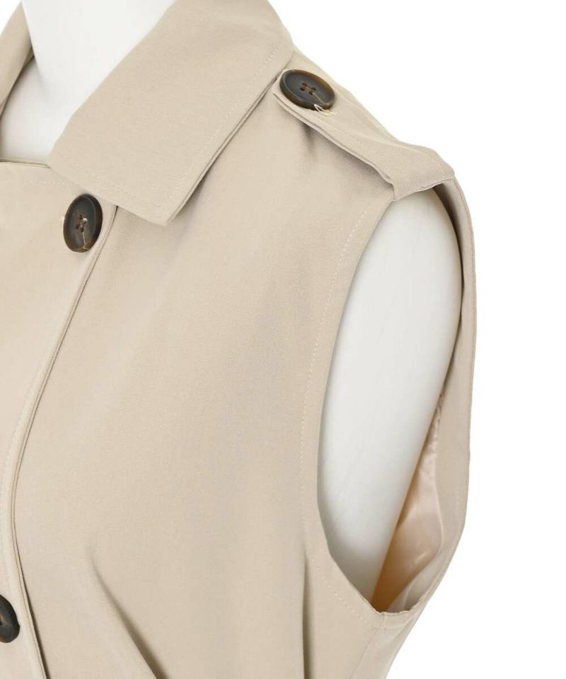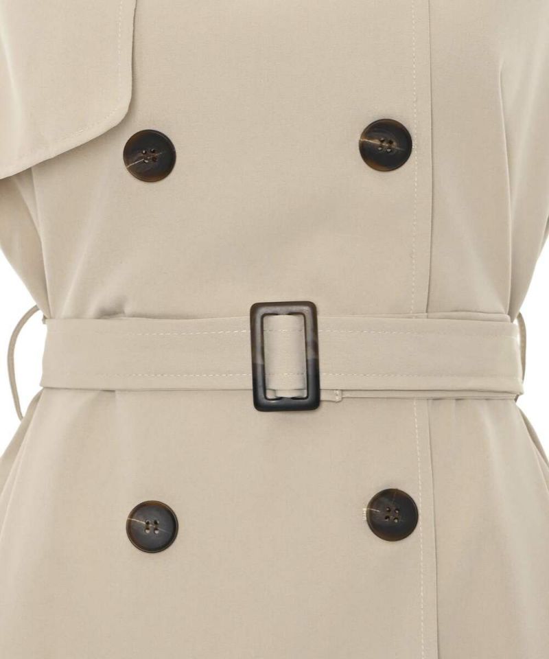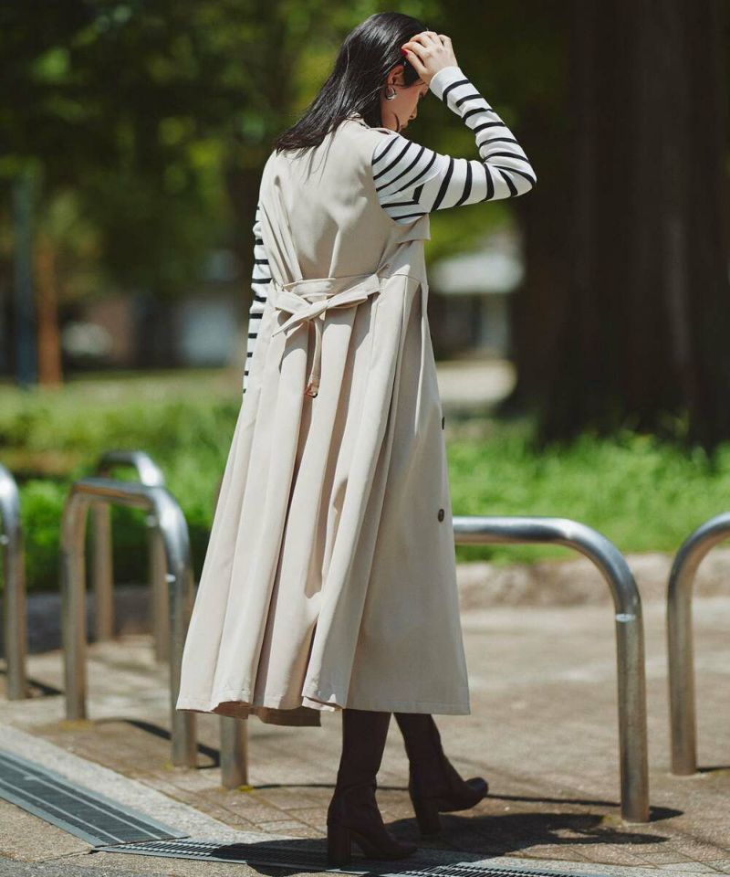 トレンチコートのディテールを施したロングジレ。テーラードの襟や、ベルトデザインが旬のトラッドな雰囲気をプラス。 前を閉めてワンピース風に着用すると、Iラインシルエットが体型カバー&縦長効果を促進。普段のスタイリングに羽織るだけで、トレンドライクな印象に仕上がるアイテム。【model】:H165 B78 H83 / H163 B78 H84