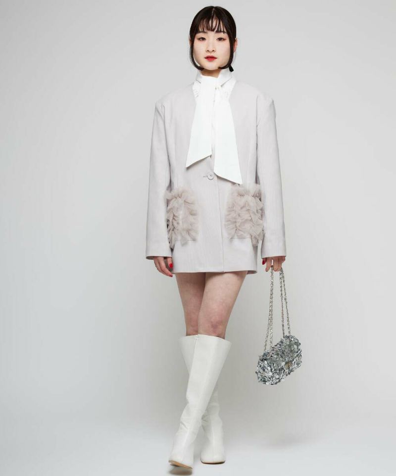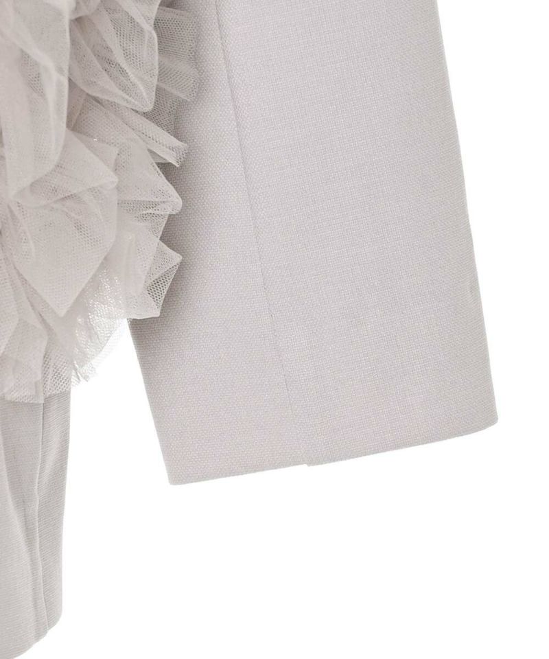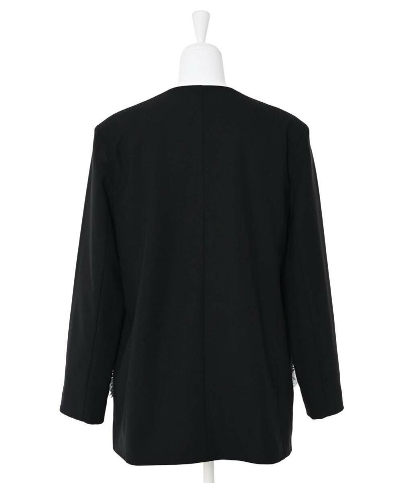 スタイリッシュなスタイリングが叶うノーカラージャケット。フォーマル、オケージョンシーンにも活躍する綺麗めなシルエットに、ポケットのチュールフリルがフェミニンな印象をプラス。ボウタイブラウス等と合わせるのがオススメ。肩パッド入りで型崩れしにくく、初夏まで着用できるサラッとした薄手の素材感。モデル身長:156cm