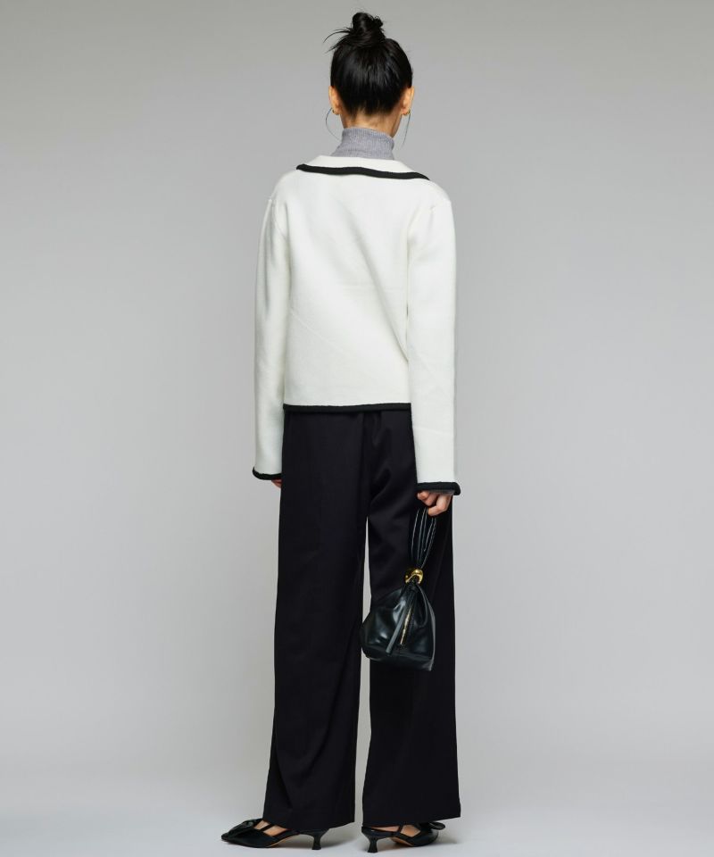 大きめの襟が特徴で、顔周りを華やかに見せてくれるデザイン。襟元から前立て、裾や袖口にかけて施された配色ラインが、シンプルながらも印象的なアクセントに。フロントにはゴールド調の光沢のあるボタンをあしらい、さりげなく高級感をプラスしています。やや短めの丈感で腰位置を高く見せ、スカートにもパンツにも合わせやすいシルエット。程よく身体に沿うシルエットが女性らしいバランスを引き立てつつ、ニットならではの柔らかな着心地も魅力です。