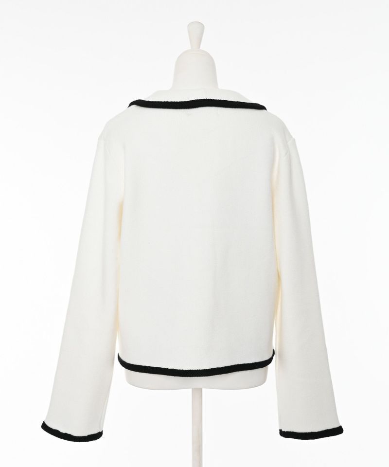 配色ラインと大きめの襟が目を惹くクラシカルなニットジャケット。コンパクトな丈感と華やかなボタン使いで、上品さとトレンド感を兼ね備えた一枚です。