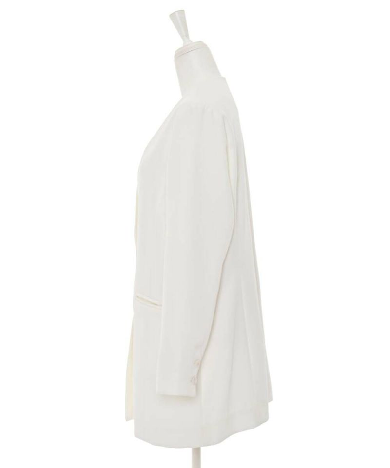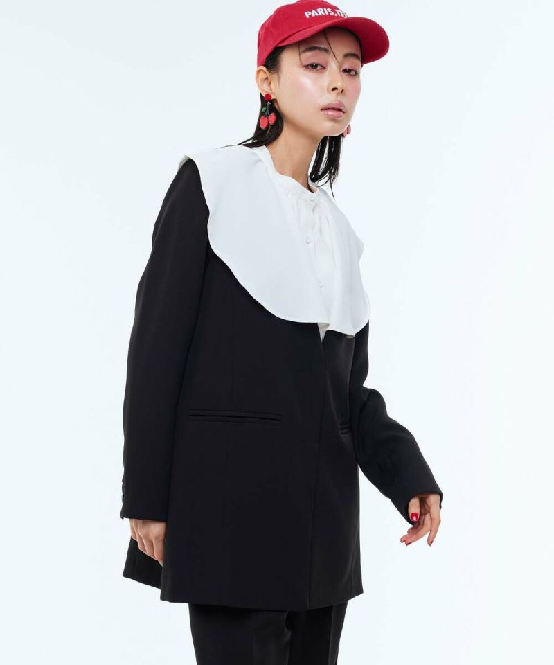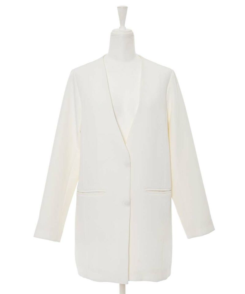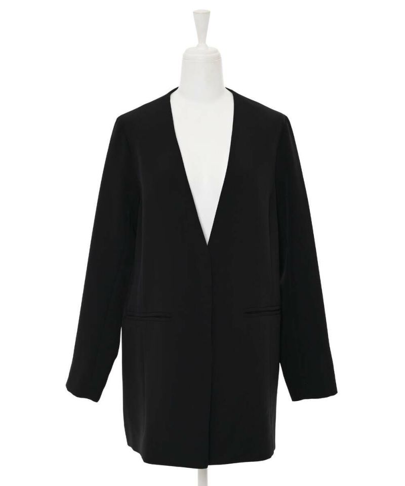 インナーを選ばず活躍するノーカラータイプのジャケット。飽きのこないシンプルなデザインは、キレイめからカジュアル・フォーマルまで、どんなシーンにも対応。程良いゆとりがありつつも、シルエットはスッキリとした印象に。ワイドパンツとのセットアップスタイルがオススメです。【モデル】:H165 B78 H83 / H163 B78 H84