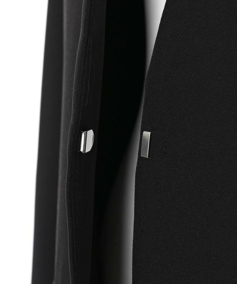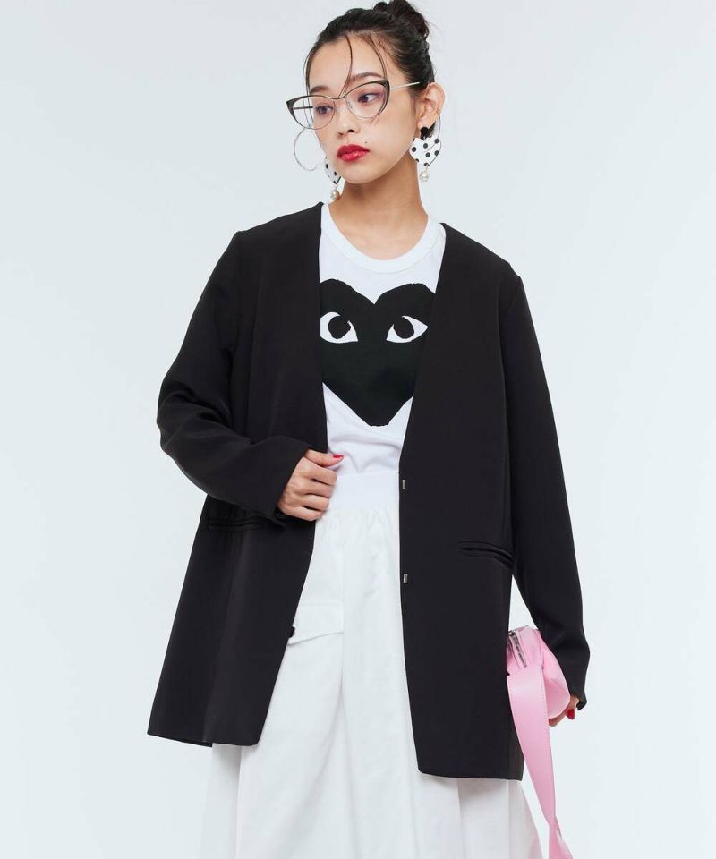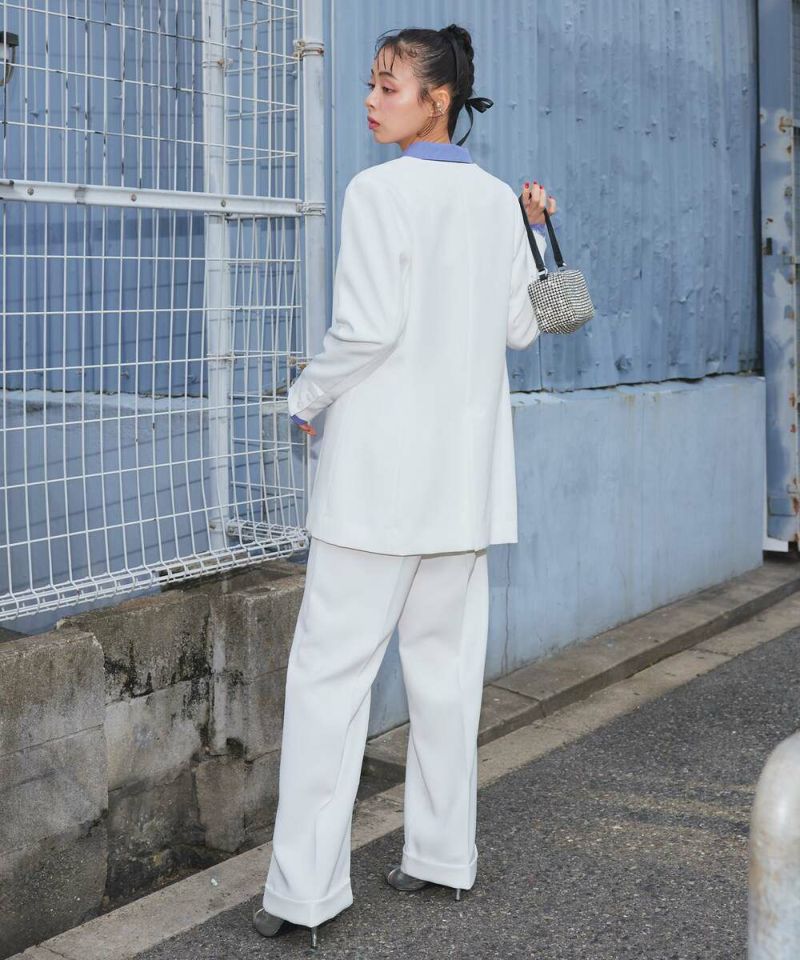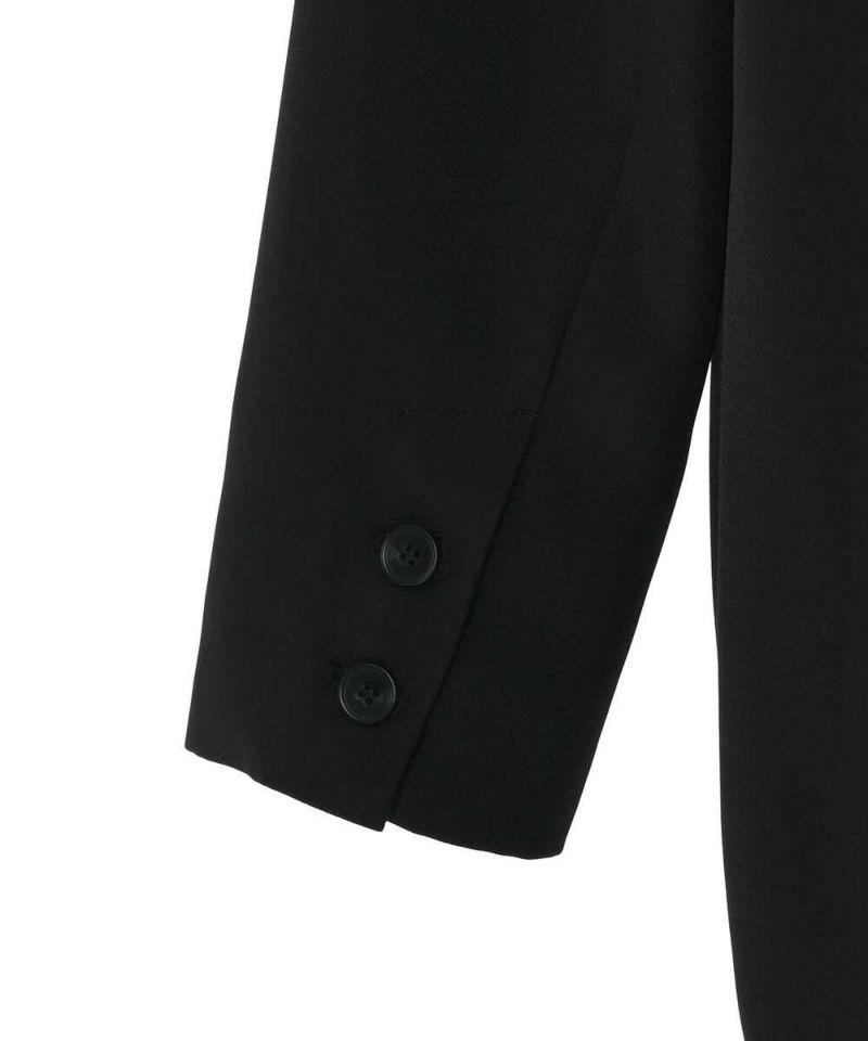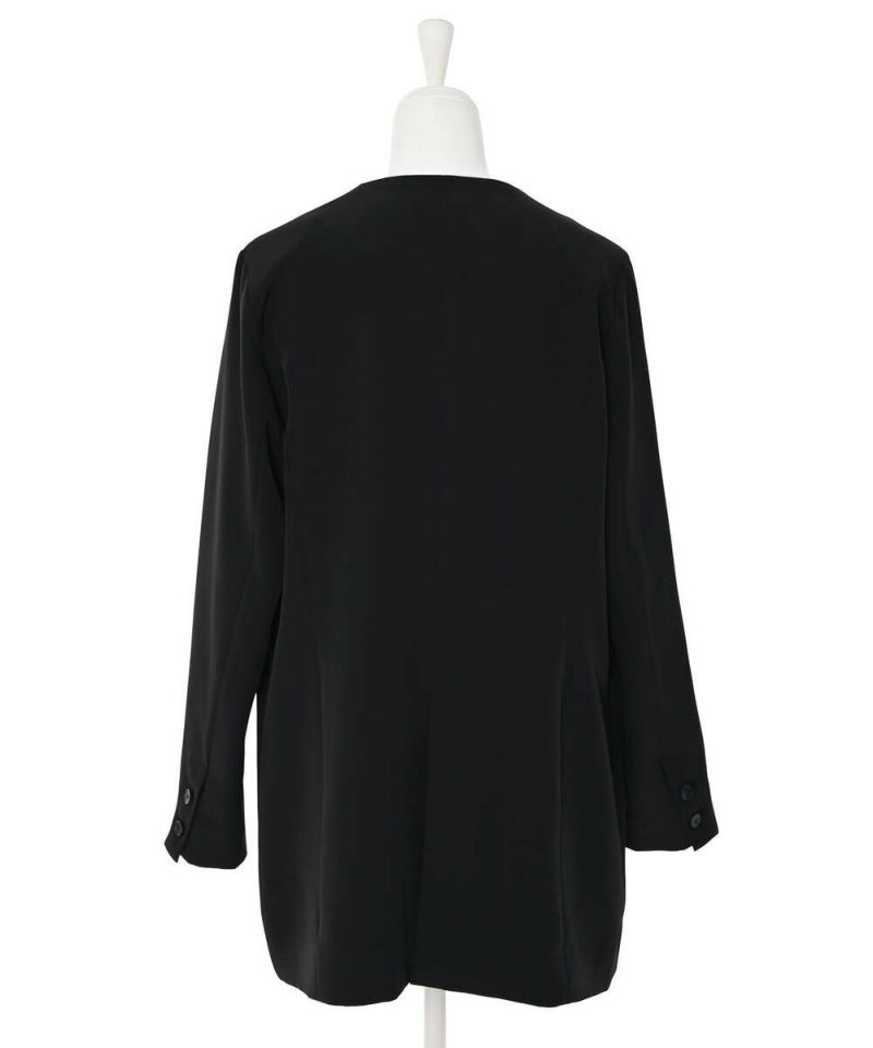 インナーを選ばず活躍するノーカラータイプのジャケット。飽きのこないシンプルなデザインは、キレイめからカジュアル・フォーマルまで、どんなシーンにも対応。程良いゆとりがありつつも、シルエットはスッキリとした印象に。ワイドパンツとのセットアップスタイルがオススメです。【モデル】:H165 B78 H83 / H163 B78 H84