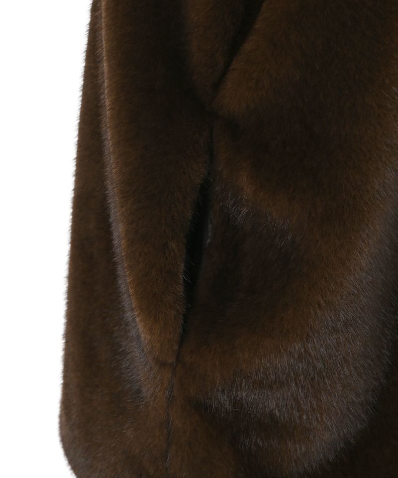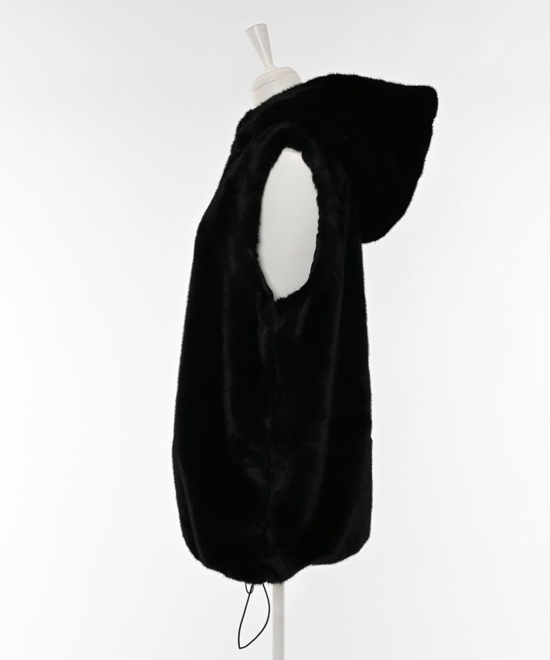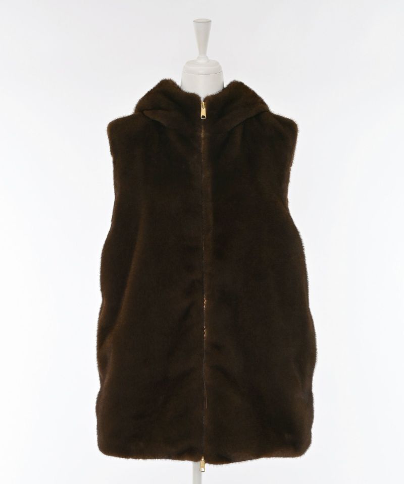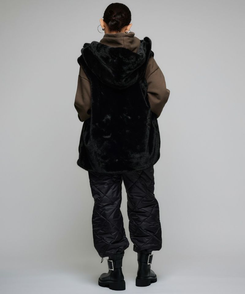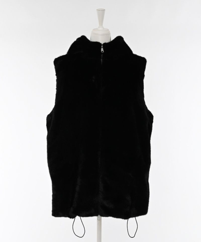 ボリュームのある上品で高級感あふれるエコファーベスト。ブラックにはシルバーカラーをブラウンにはゴールドカラーが配色されたダブルジップデザインがさりげないポイント。顔まわりを包み込むような大きめフードが小顔効果も叶えます。ゆとりのあるサイズ感でアームホールも広めに作られているのでインナーを選ばず着用でき、ハイネック仕様にもなるので防寒性もばっちりです。裾にはドロストコードを採用・深めのポケット付きで実用性も◎