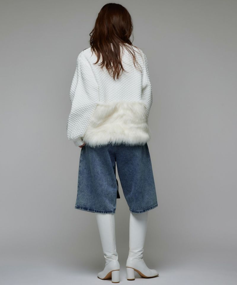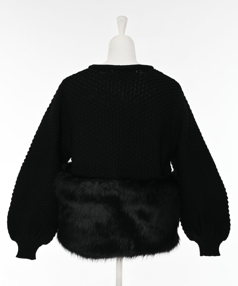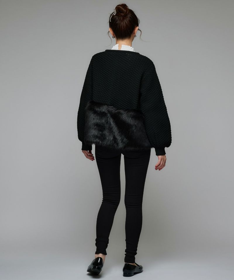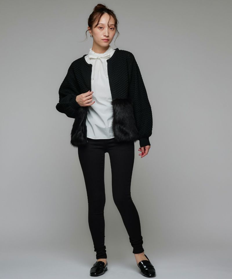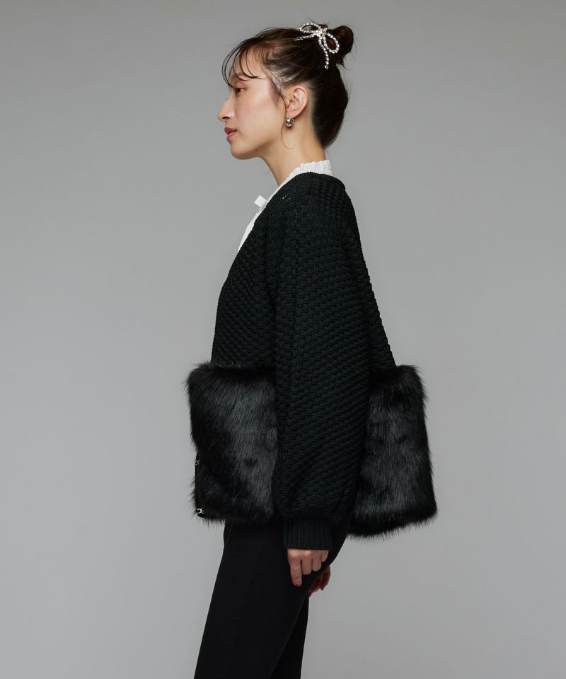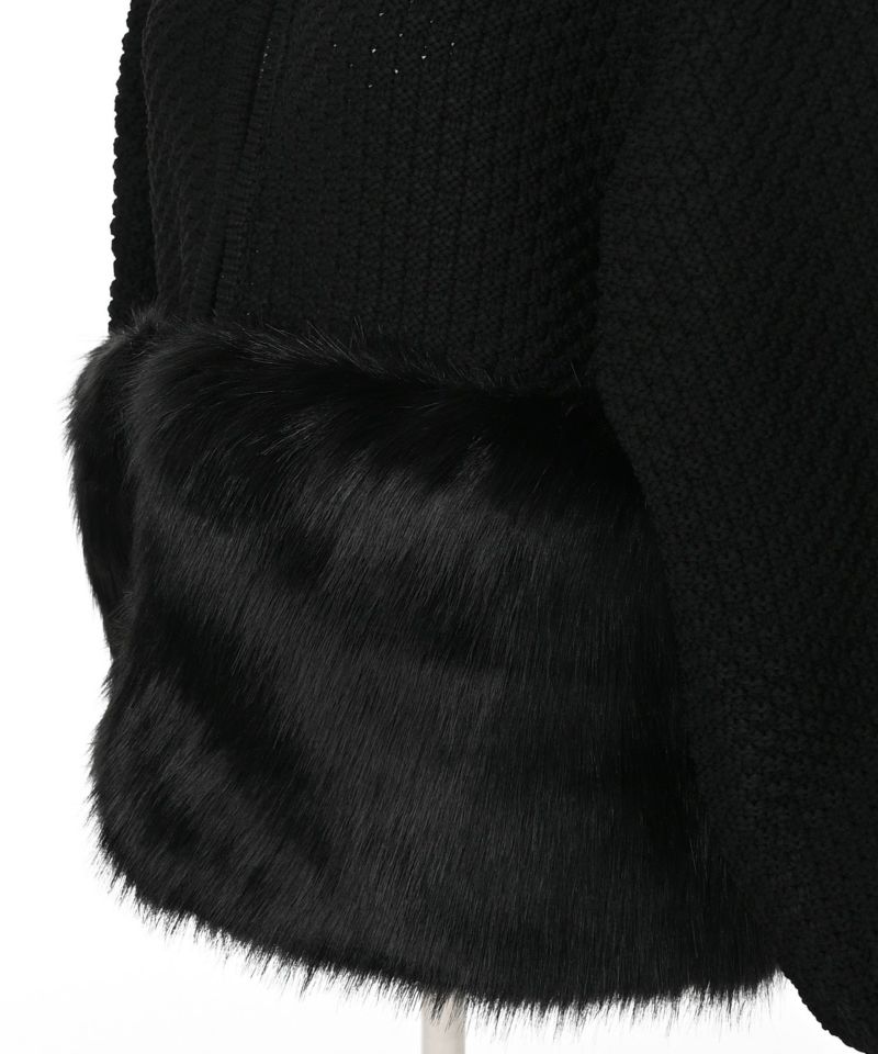 カーディガン部分は、程よくハリのあるしっかりとしたニット素材。フェイクファーは毛足が長く、さらりとした光沢が上品な印象を与えます。全体をポリエステル素材で仕立て、軽やかな着心地と滑らかな肌触りを両立。着るたびに心地良さを感じられる一枚です。