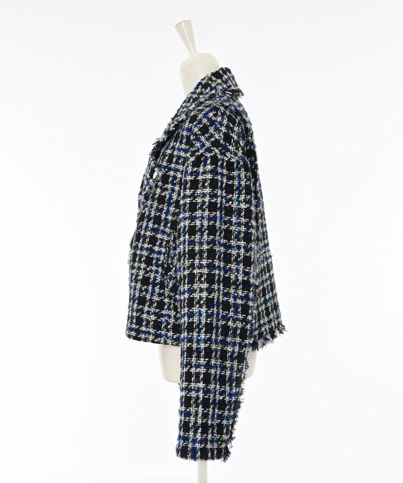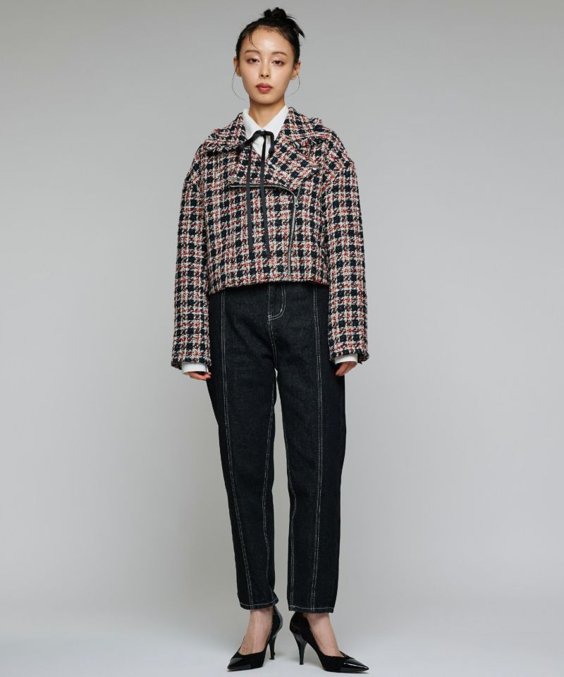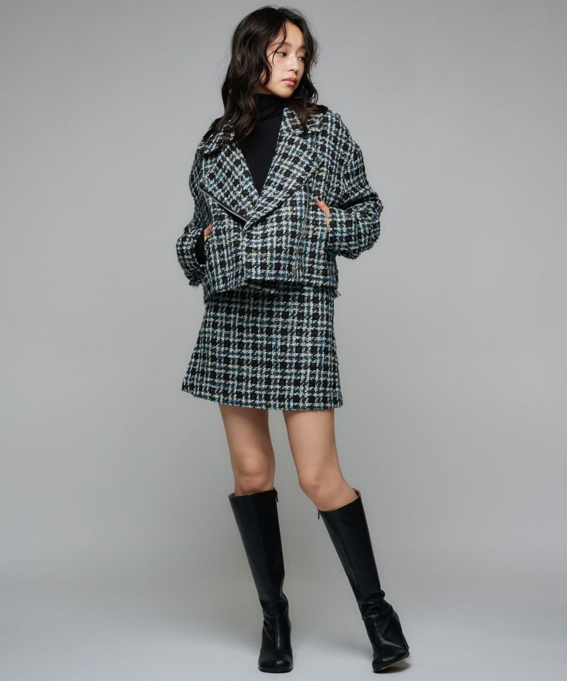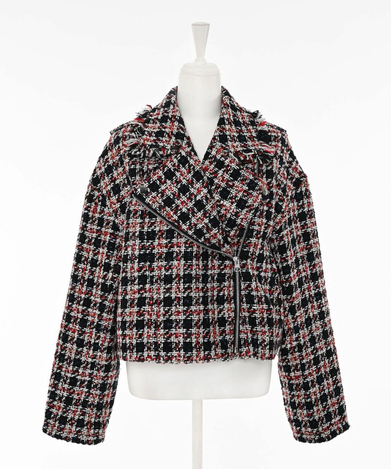 キラキラとした糸を織り込んだ、シーズンムード漂うツイードライダースジャケット。ライダースのエッジを残しつつ、ツイード素材で女性らしさを引き立てる一着です。