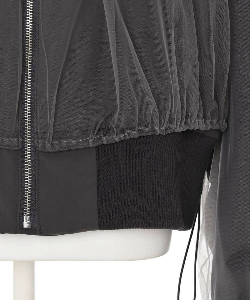 【MIDVEIN】“ストリートとモードを軸とし派生していく 遊び心のあるデザインをリアルクローズに” をコンセプトに“ ニューカジュアル ”を提案しているブランド。軽い着心地なのに防寒性も高いお洒落な優秀MA-1に、チュールがドッキングされたデザイン。ドロストコードがスポーティーな印象を、チュールでフェミニンさをプラス。ボトムを選ばない丈感とシンプルなデザインで着回し力◎【model】H156H163 B78 H84/H160 B80 H85