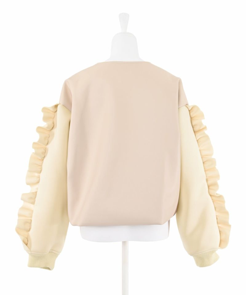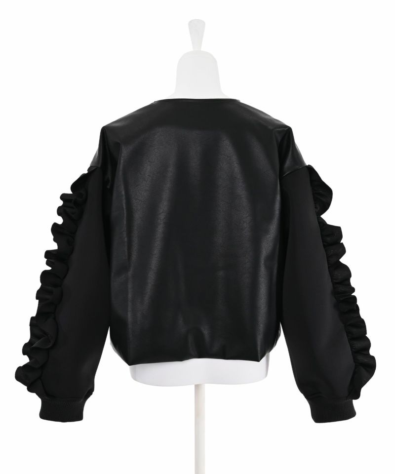 フリルデザインとレザーのコントラストがポイントのショートブルゾン。袖はボンディング素材でフリルのボリュームに対し、ライトな着心地。ノーカラーデザインでワードローブに取り入れやすい一枚。モデル身長:156cm