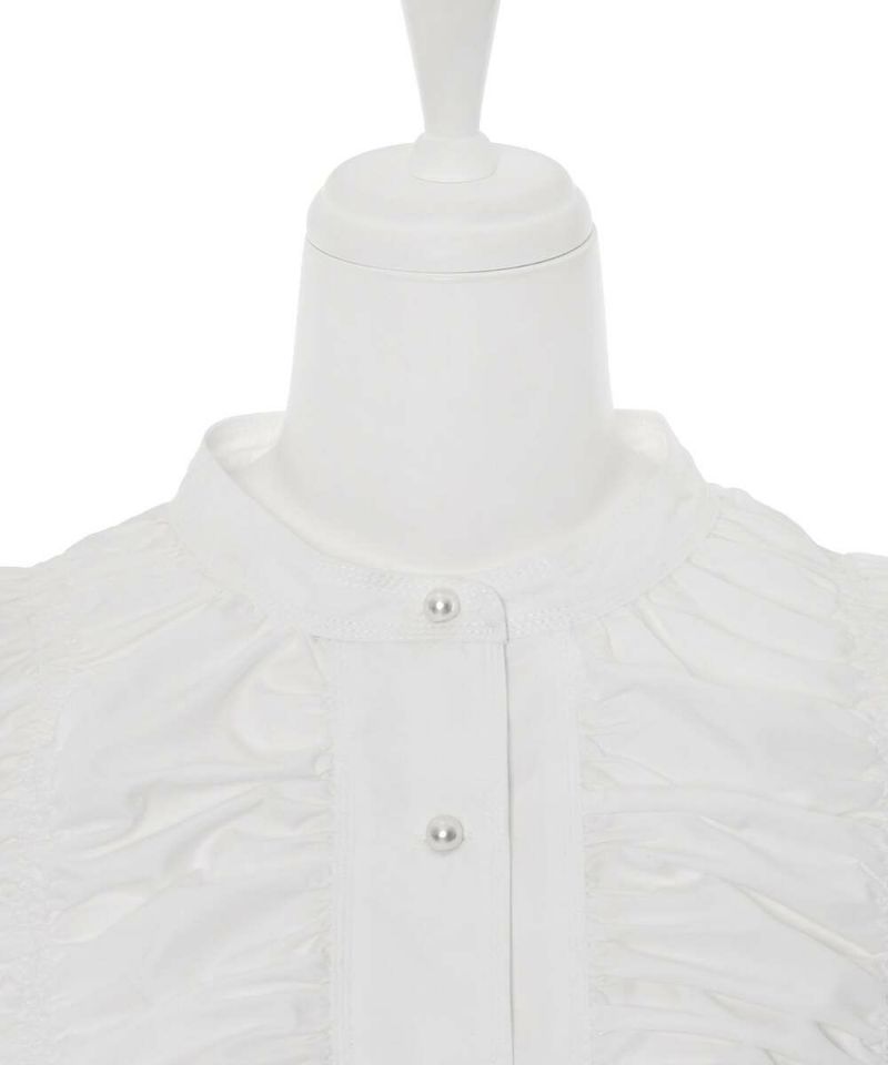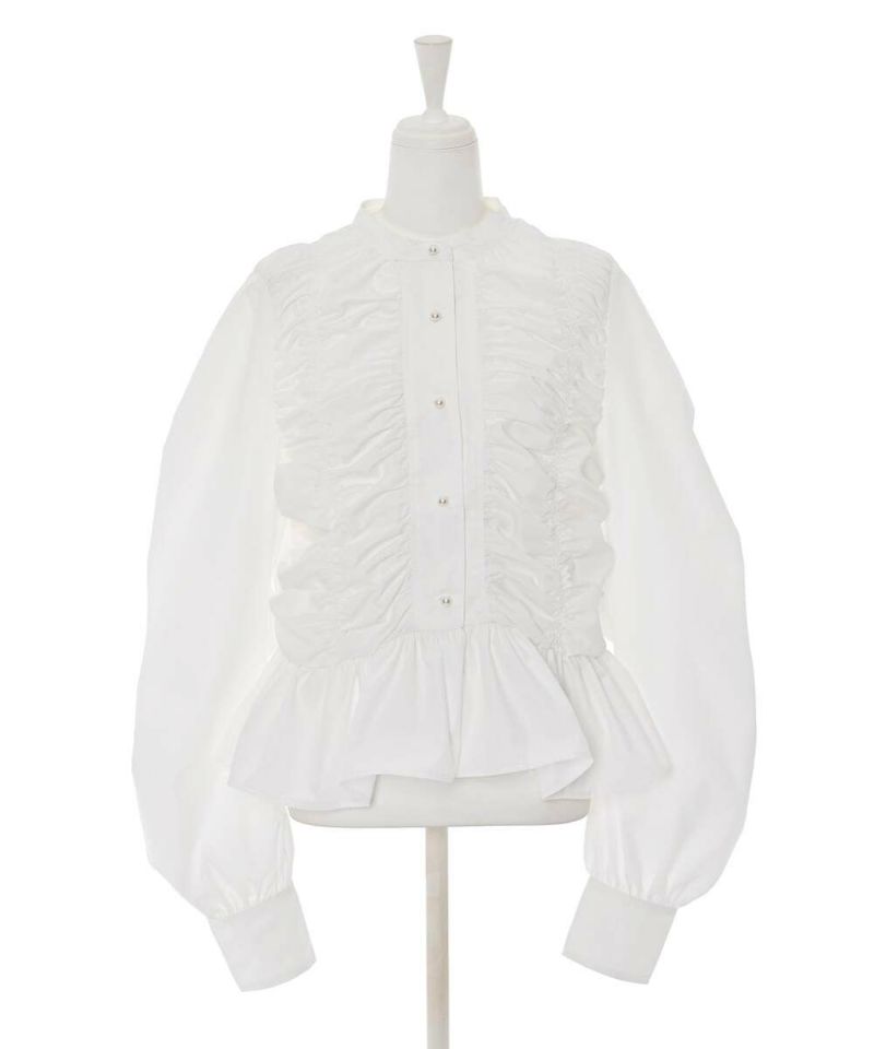 【PICCIN】心にフィットし、人を幸せにする洋服を。心まで作用するような洋服でありたいとPICCINは1990年に誕生以来、妥協せずこだわった洋服作りをしているブランド。 フロントと袖にたっぷりとギャザーが入った女性らしさ溢れるブラウス。裾のフリルとパールボタンがフェミニンな印象をプラス。ボリュームのあるシルエットながらも、ノーカラーで首回りをスッキリ見えさせることで、バランスの良いディティールに。【model】H163 B78 H84