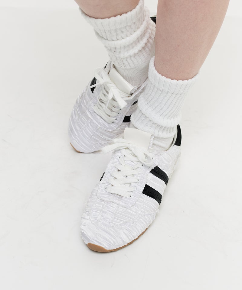 アッパー全体に施された立体感のあるプリーツ加工が印象的なデザイン。 サイドにはテープで表現したWラインをあしらい、スポーティーなムードをプラスしました。 すっきりとしたシルエットなので、スカートやワンピースなどフェミニンなスタイリングにも好相性。 ソールにはさりげない星モチーフを施し、遊び心のあるディテールに仕上げています。