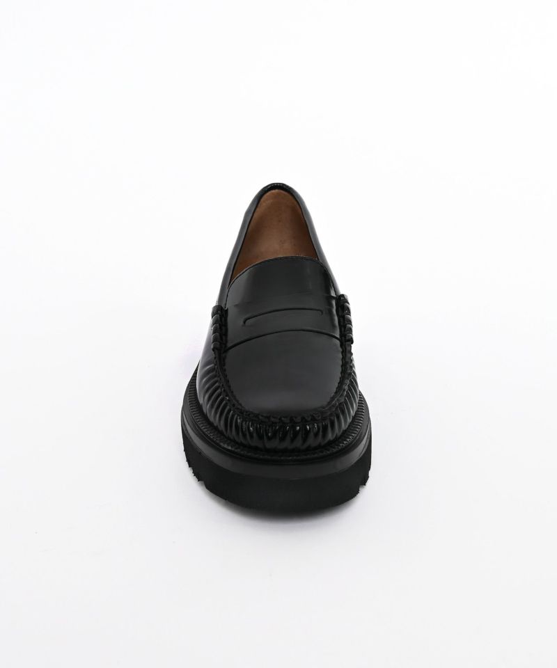 端正なフォルムで仕立てたシンプルなローファー。つま先に寄せを入れる事で、さりげない立体感と柔らかな表情を演出します。すっきりとしたシルエットの中に程よい存在感があり、上品さと抜け感を両立。無駄のないデザインながら、細部のディテールが印象に残る一足です。