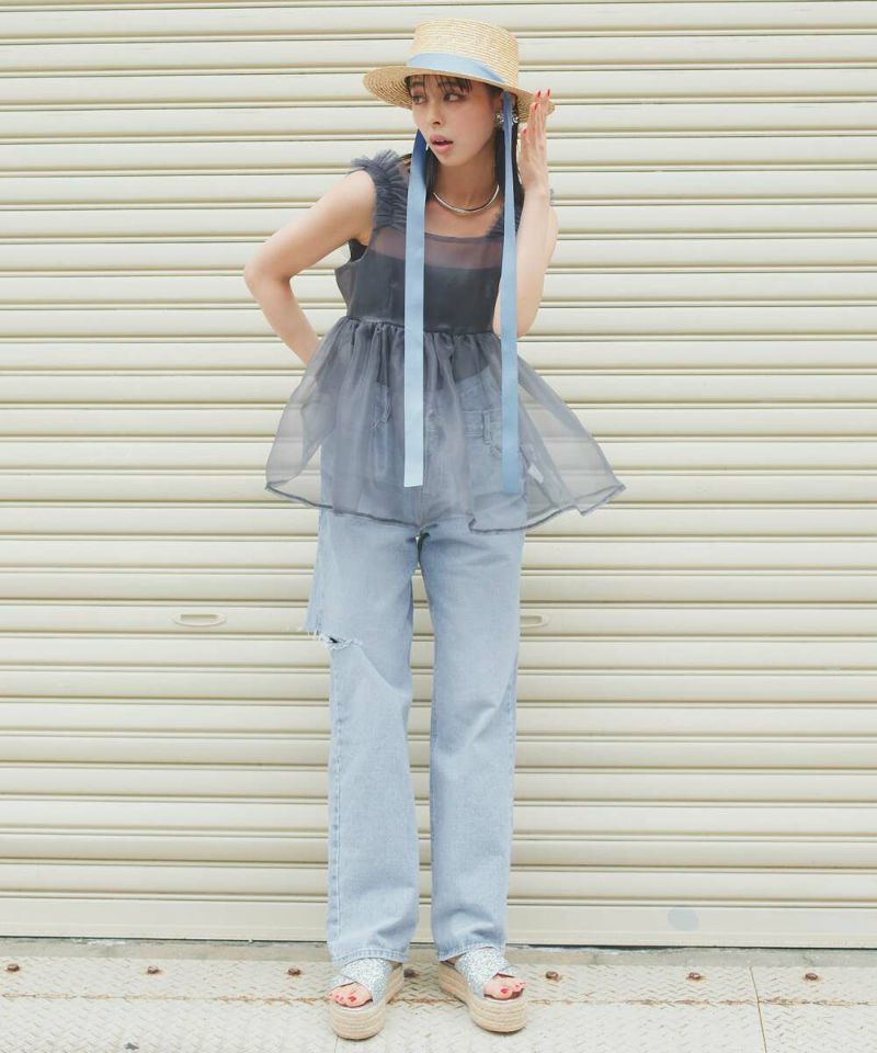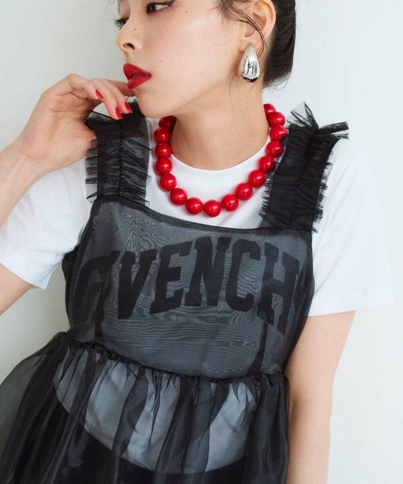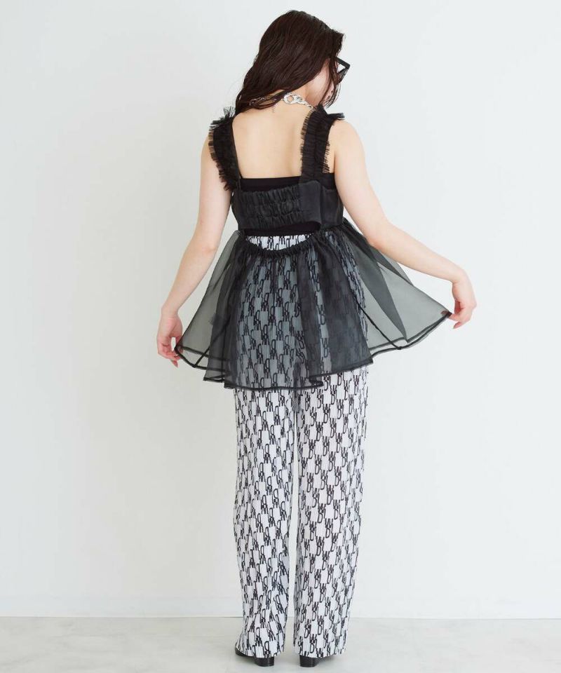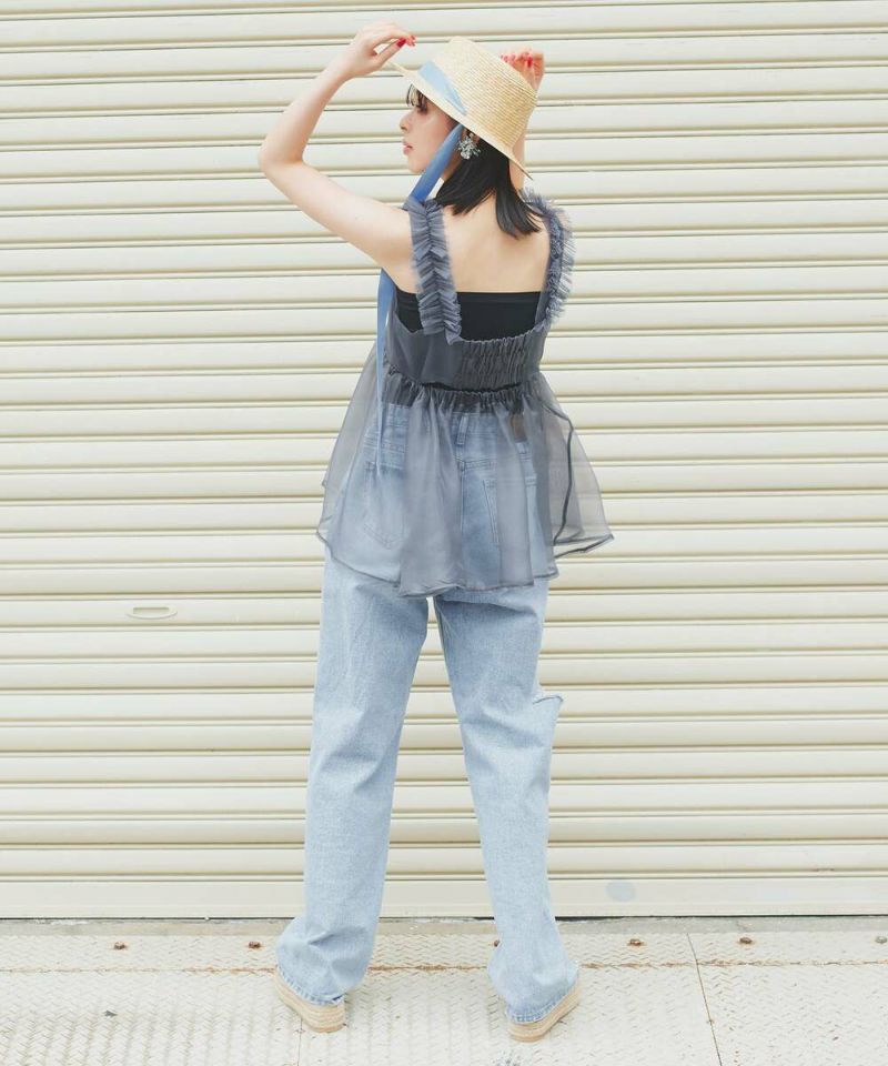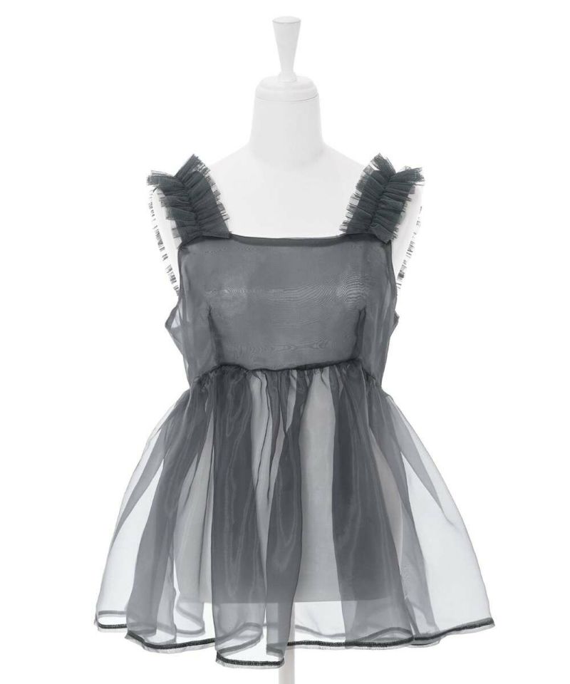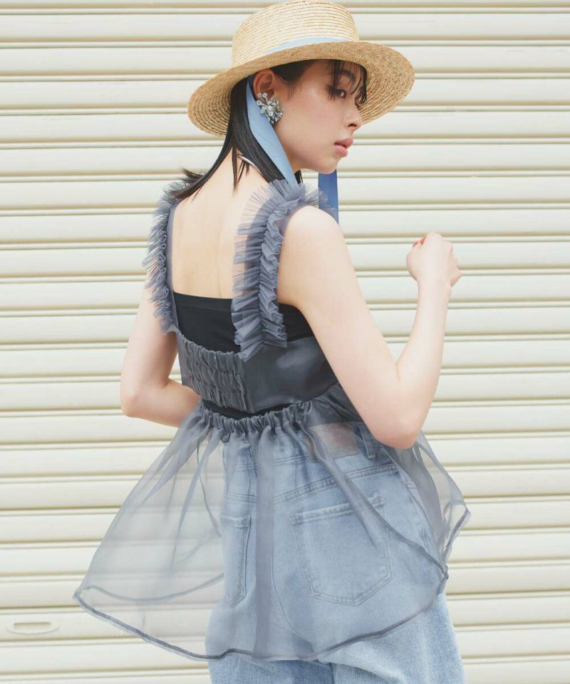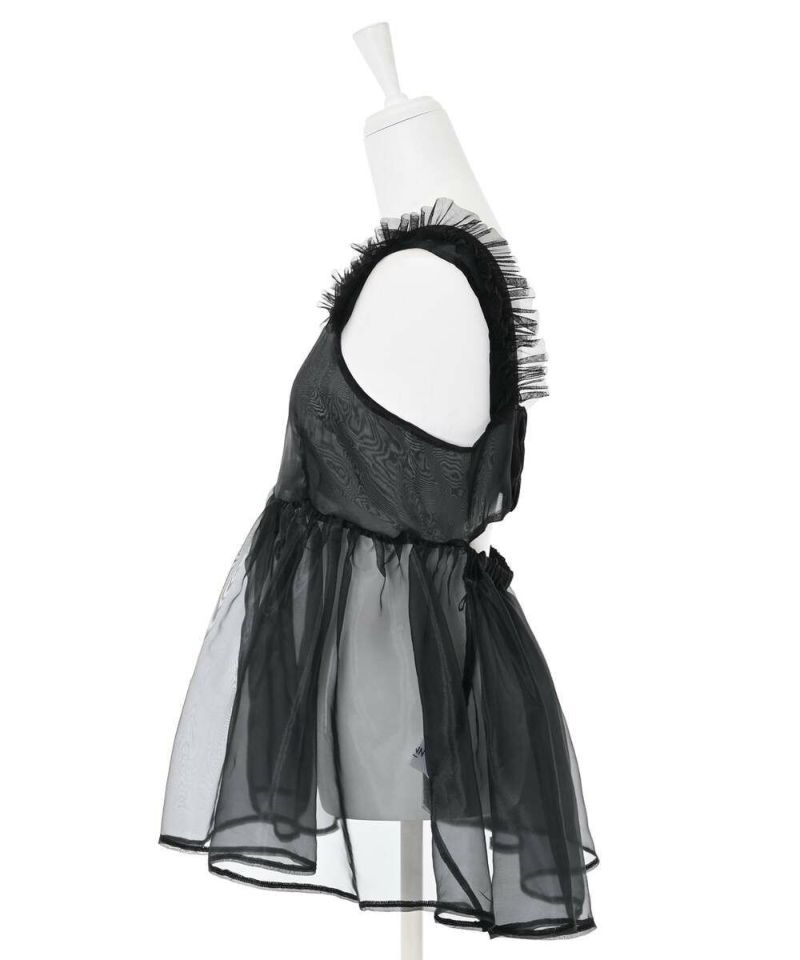 チュールとオーガンジーを採用した、ランジェリーディティールが女性らしいビスチェ。 薄手で軽い着心地に仕上げました。 ショルダー部分の細かいチュールに拘り、全体的に透け感があることでシーズンムードをアップしてくれるアイテム。 バックにシャーリングを使用しておりますが、身幅はタイトなシルエットになっているので レイヤードアイテム薄手の素材をオススメしてます。【model】H165 B78 H83/156cm