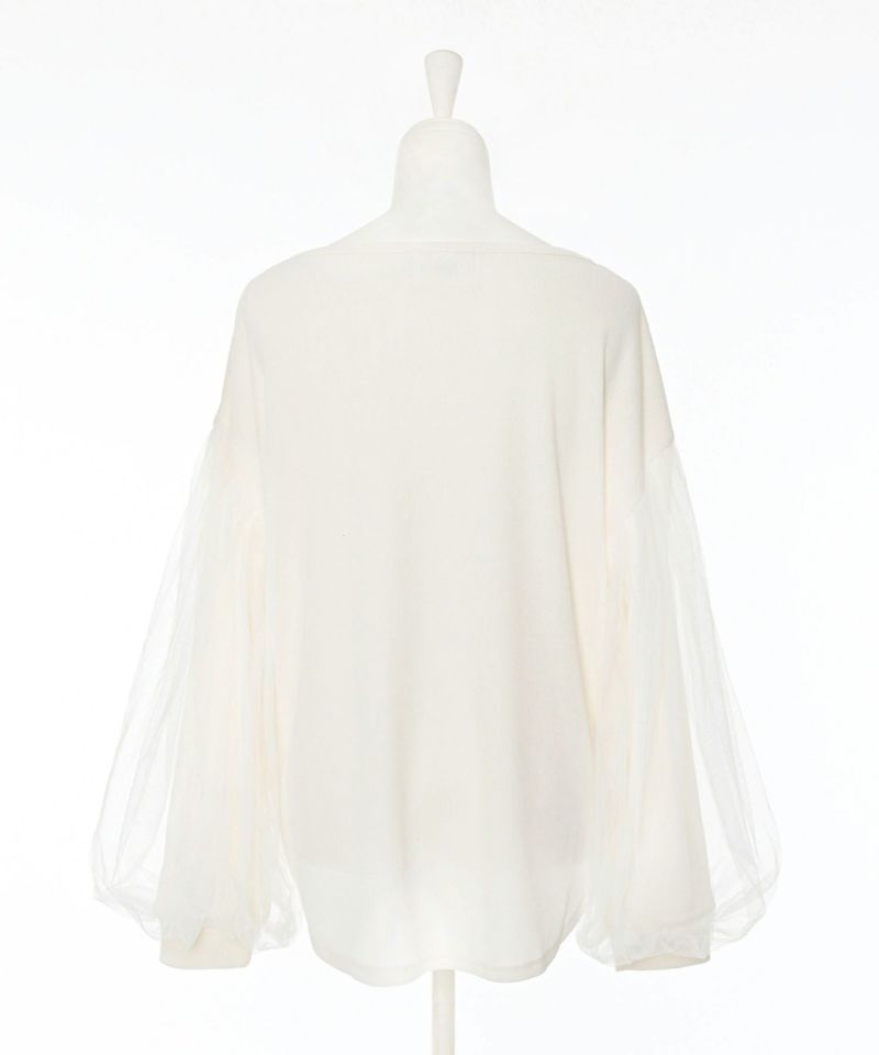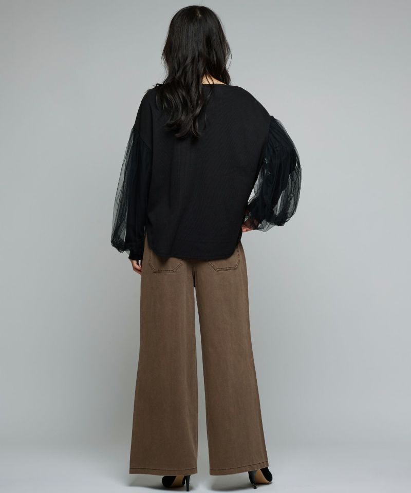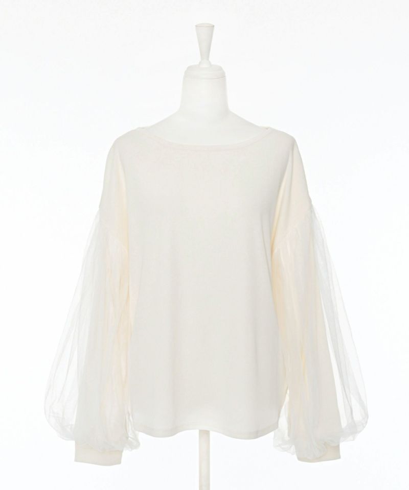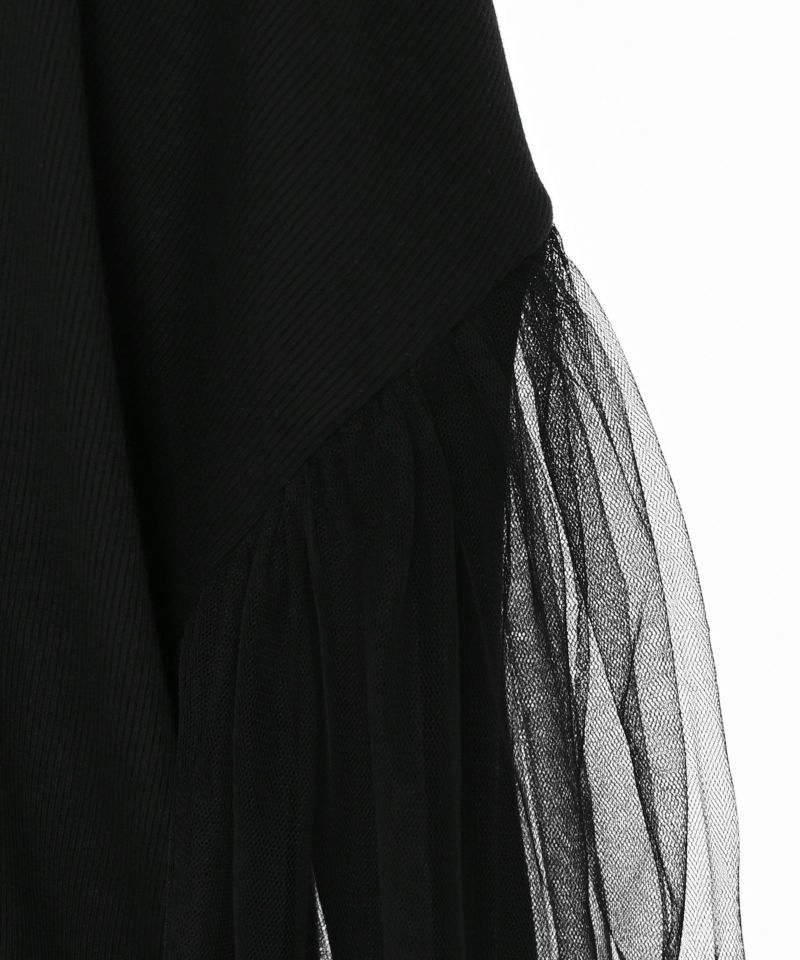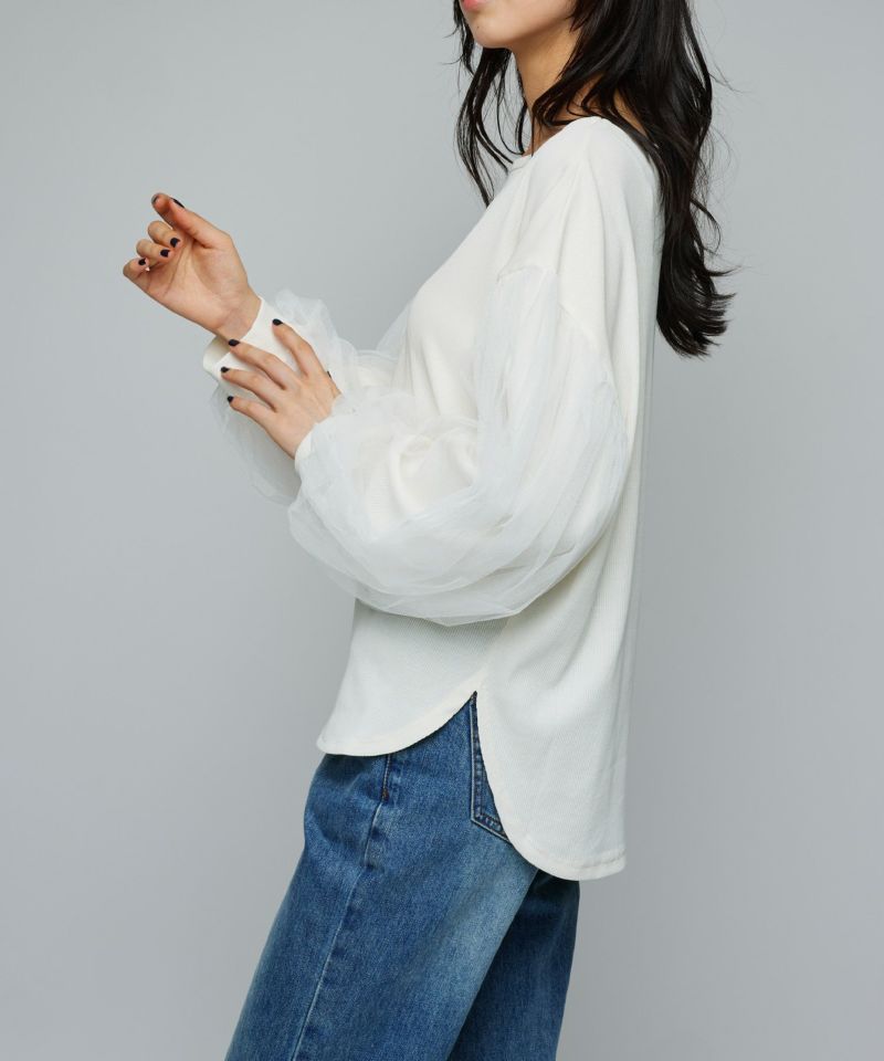 【ポイント】 柔らかなチュールをまとったスリーブが、動くたびに軽やかな表情をプラス。 身頃と同色で統一することで甘さを抑え、大人っぽく着こなせるカットソー。 【デザイン・シルエット】 身体のラインを拾いすぎない程よいゆとりと、柔らかなリブ素材が心地よい着用感を叶える一枚。広めに開いたネックラインは顔まわりをすっきりと見せ、透け感のあるチュールスリーブが軽やかな抜け感を演出します。袖にたまる立体的なシルエットが華奢見えを引き立て、シンプルなカットソーながら女性らしさと華やかさを兼ね備えたデザイン。 【おすすめのスタイリング】 いつものデニムに合わせるだけで、シンプルながらも女性らしい華やかさをプラス。 ワントーンなデザインなので、カラーや柄物のボトムとも相性抜群です。 ワンピースのインナーとしてレイヤードすれば、さりげなくトレンド感も演出。 毎日のワードローブに取り入れやすく、デイリーからちょっとしたお出かけまで、幅広く活躍する万能トップスです 【素材】 優しく肌に馴染む、薄手で柔らかなリブ素材を使用。程よい伸縮性があり、快適な着心地を叶えます。袖にドッキングしたチュールもソフトな質感で、ストレスフリーに着用できるのが嬉しいポイント。【model】H160 B80 H85 / H165 B78 H83
