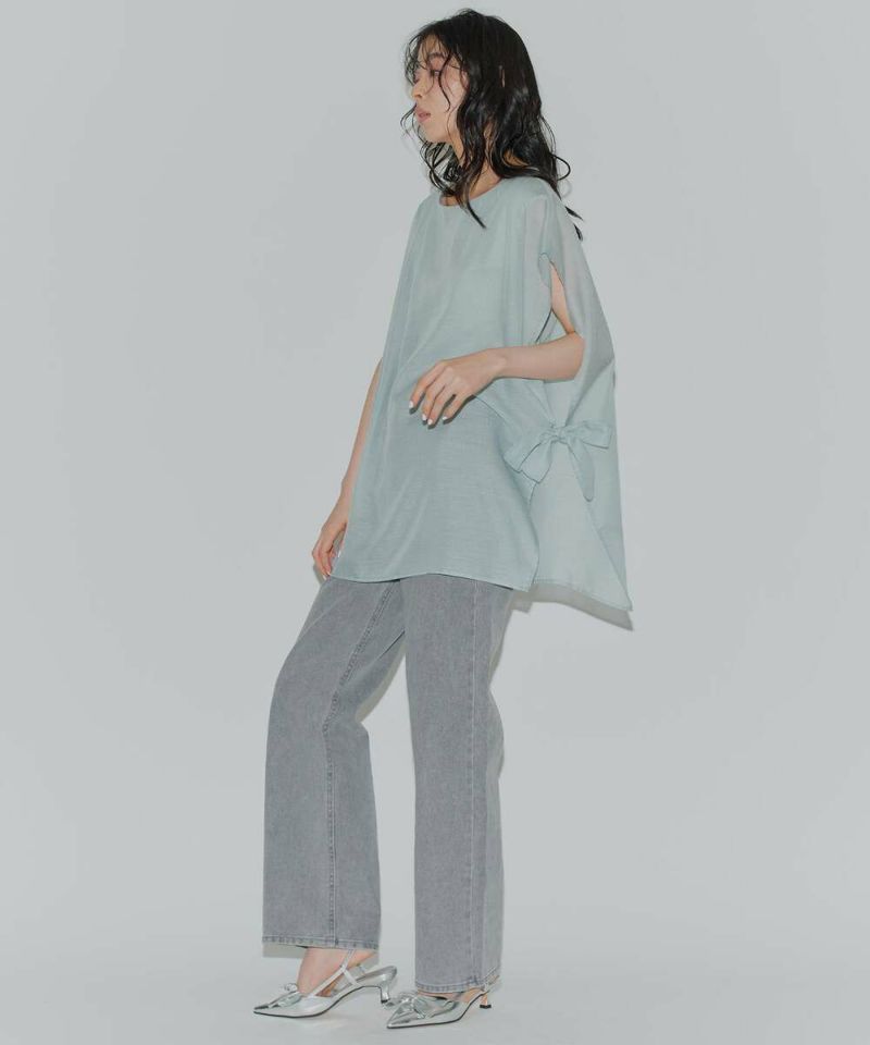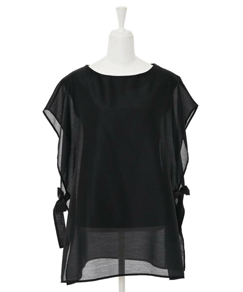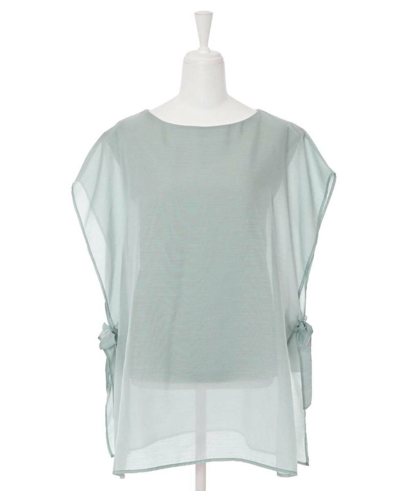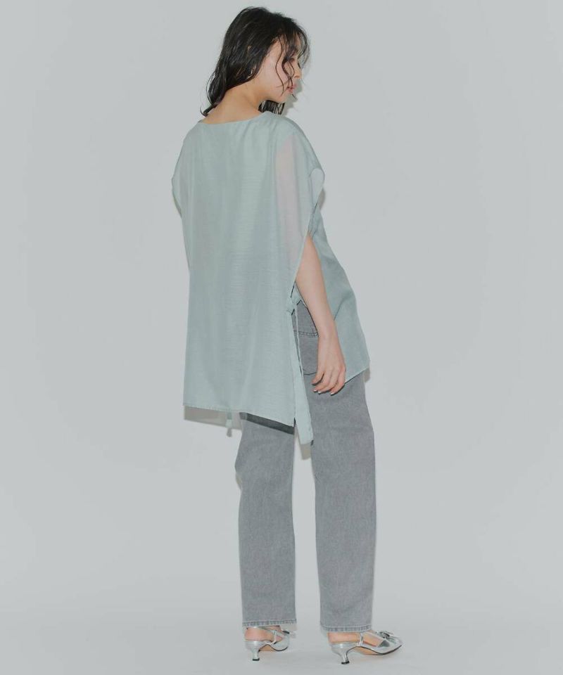 一枚でレイヤードスタイルが叶う、シンプルなカットソーにシアー素材をドッキングしたブラウス。大胆にカットした抜け感のあるサイドスリットにリボンを採用。リボンは結んでも、結ばず下ろした状態でも着用できる2WAY仕様。ドロップショルダーとオーバーシルエットでゆったりとしたサイジングで、ヒップラインもカバーできる丈感がポイント。これから気温が高くなる時期に、コーディネートを楽しめる清涼感のあるアイテム。【model】H165 B78 H83