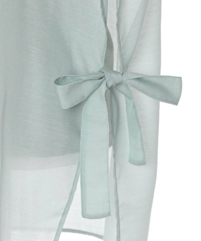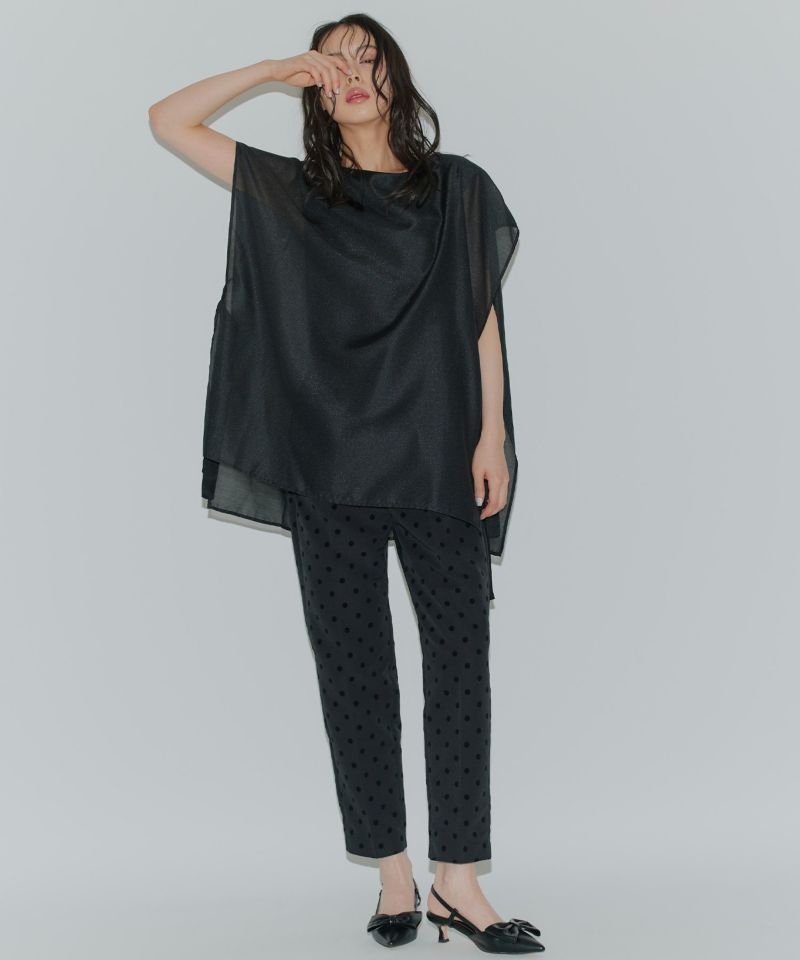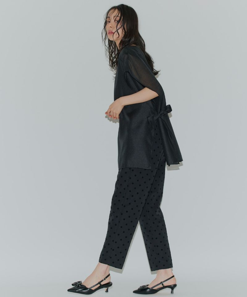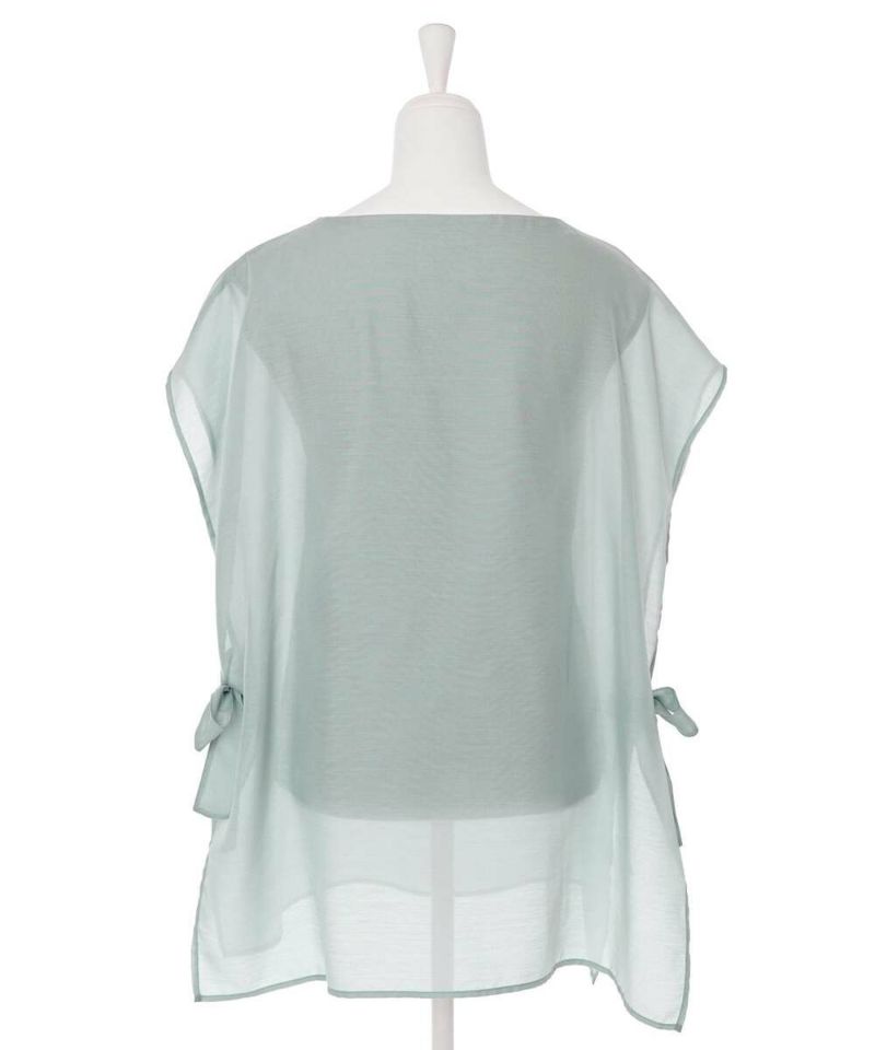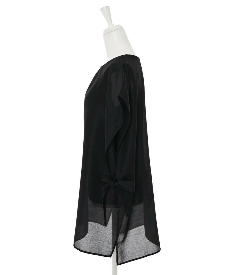 一枚でレイヤードスタイルが叶う、シンプルなカットソーにシアー素材をドッキングしたブラウス。大胆にカットした抜け感のあるサイドスリットにリボンを採用。リボンは結んでも、結ばず下ろした状態でも着用できる2WAY仕様。ドロップショルダーとオーバーシルエットでゆったりとしたサイジングで、ヒップラインもカバーできる丈感がポイント。これから気温が高くなる時期に、コーディネートを楽しめる清涼感のあるアイテム。【model】H165 B78 H83