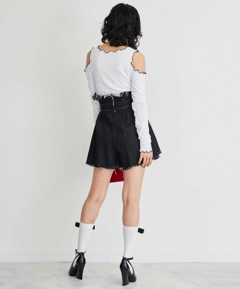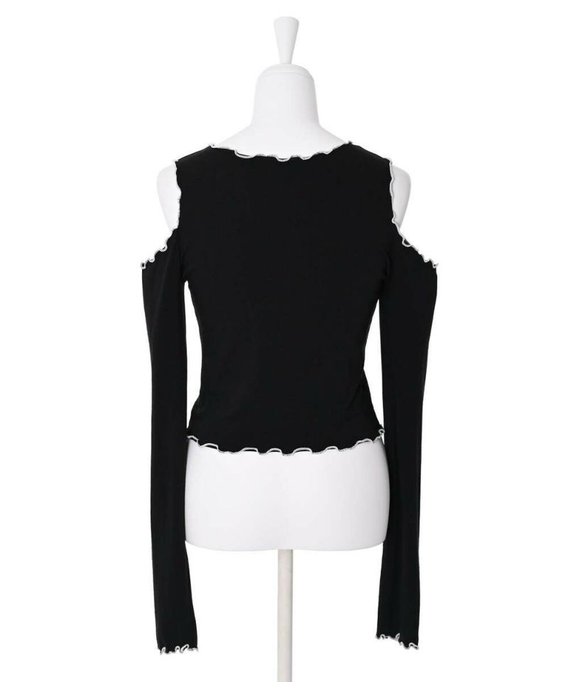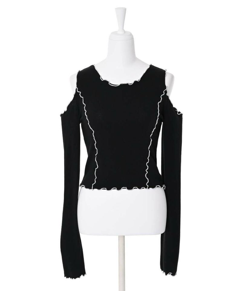アクセントになるメロウの配色が旬のトップス。程よい肩の肌みせでヘルシーさをプラス。モダール混の肌当たりの良い素材感で着心地も◎【model】H163 B78 H84