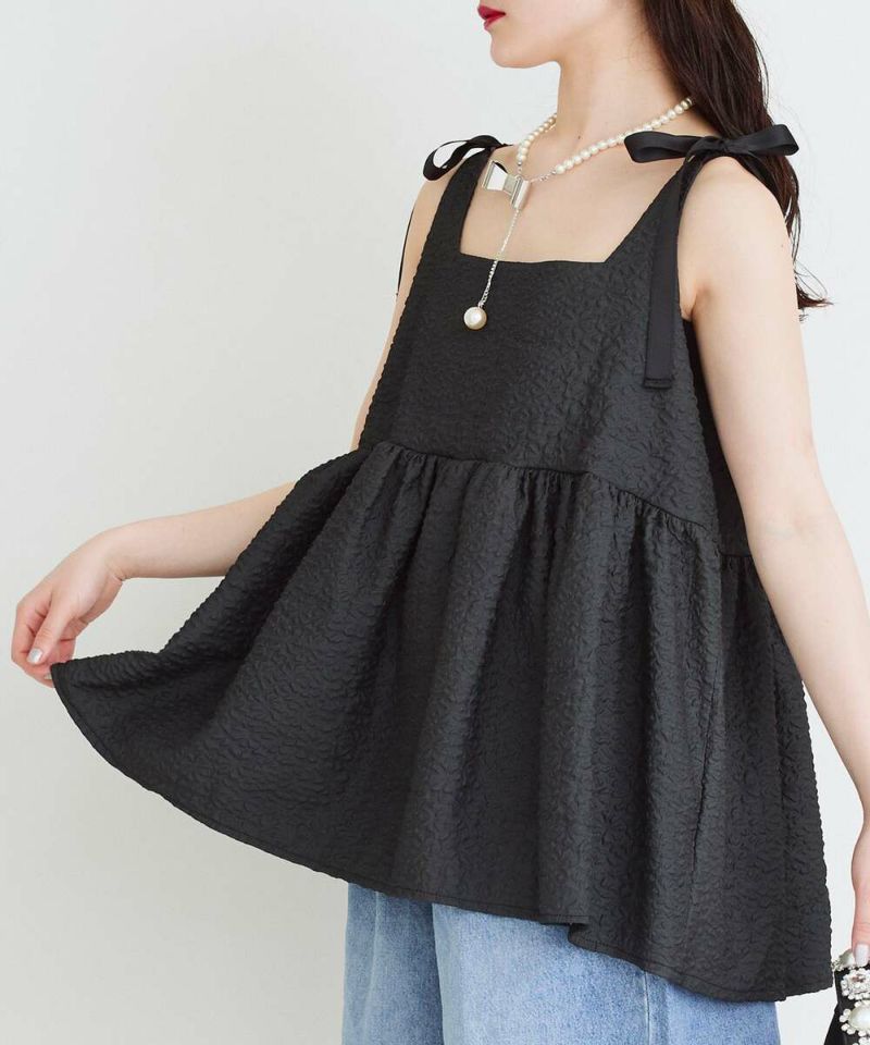 ジャガード素材を使用した、1枚でこなれコーデを叶える大人フェミニンなペプラムビスチェ。ショルダー部分のリボンが可愛らしさをプラスし、長さ調節可能。ウエストから裾にかけて広がるペプラムデザインがメリハリのある綺麗なシルエットに。【model】H165 B78 H83/156cm