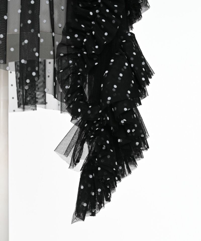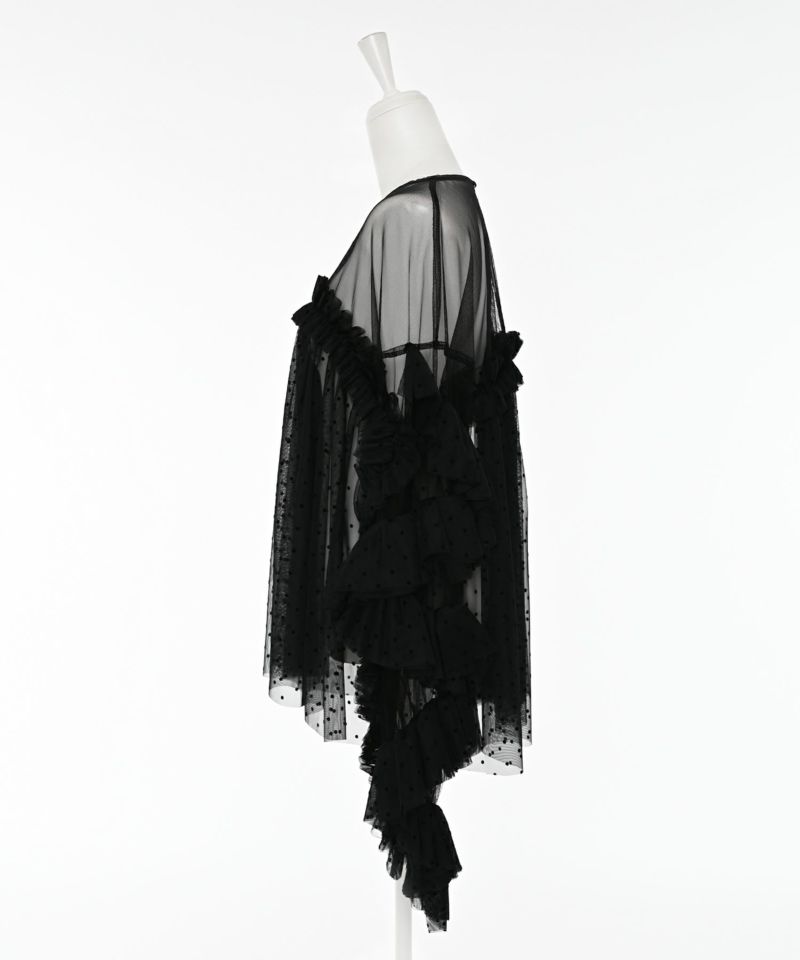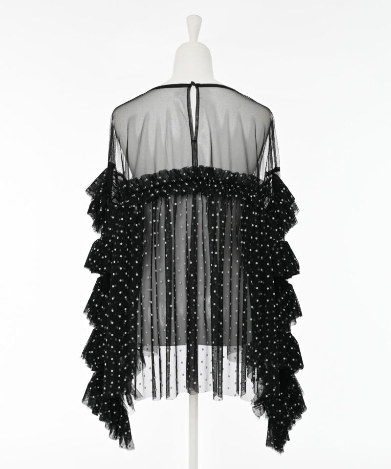 ドット柄の可愛らしい雰囲気、落ち着いた色合いと透け感があることで大人っぽい女性らしさを引き出してくれるアイテム。ボリュームのあるフリル袖が個性をプラスし、コーディネートの主役として活躍します。