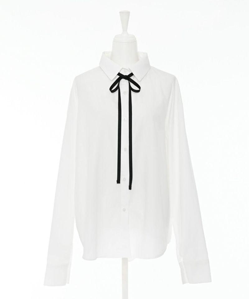 【ポイント】 存在感のあるビッグシルエットに、リボンタイが映えるモードなブラウス。一枚でコーデを引き締め、洗練された印象を与えてくれます。 【デザイン・シルエット】 全体的に大き目の作りとなっており、カジュアルになりがちなシャツもリボンタイがつくことで一気にレディライクな仕上がりに。袖丈が長めの設定になっているので袖元をくしゅっとしていただくのもおすすめです。 【おすすめのスタイリング】 ミニボトムスと合わせてガーリーに、デニム等と合わせてカジュアルコーデと幅広くお使いいただけます。スラックス等きれいめのパンツと合わせてオフィスカジュアルにお使いいただくのも◎ 【素材】 さらっとしたハリのある素材。快適な着心地と美しいシルエットをキープしてくれます。【model】H160 B80 H85 / H165 B78 H83