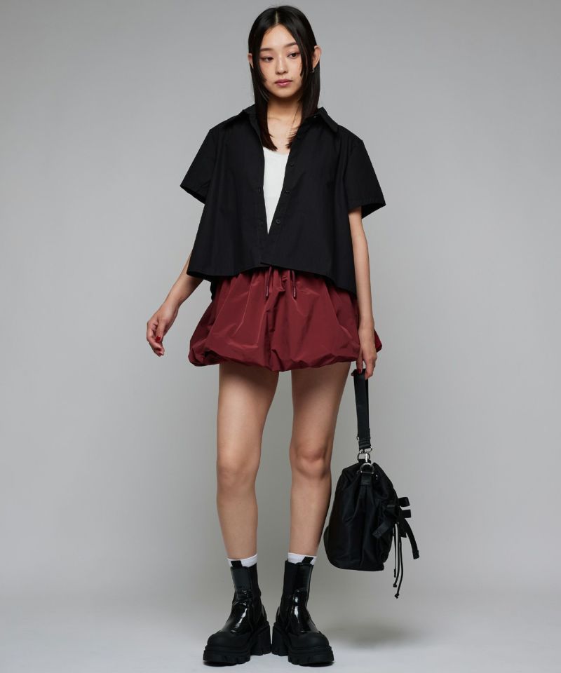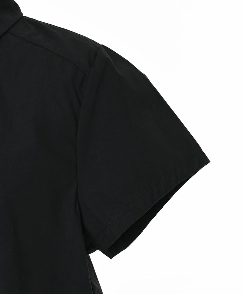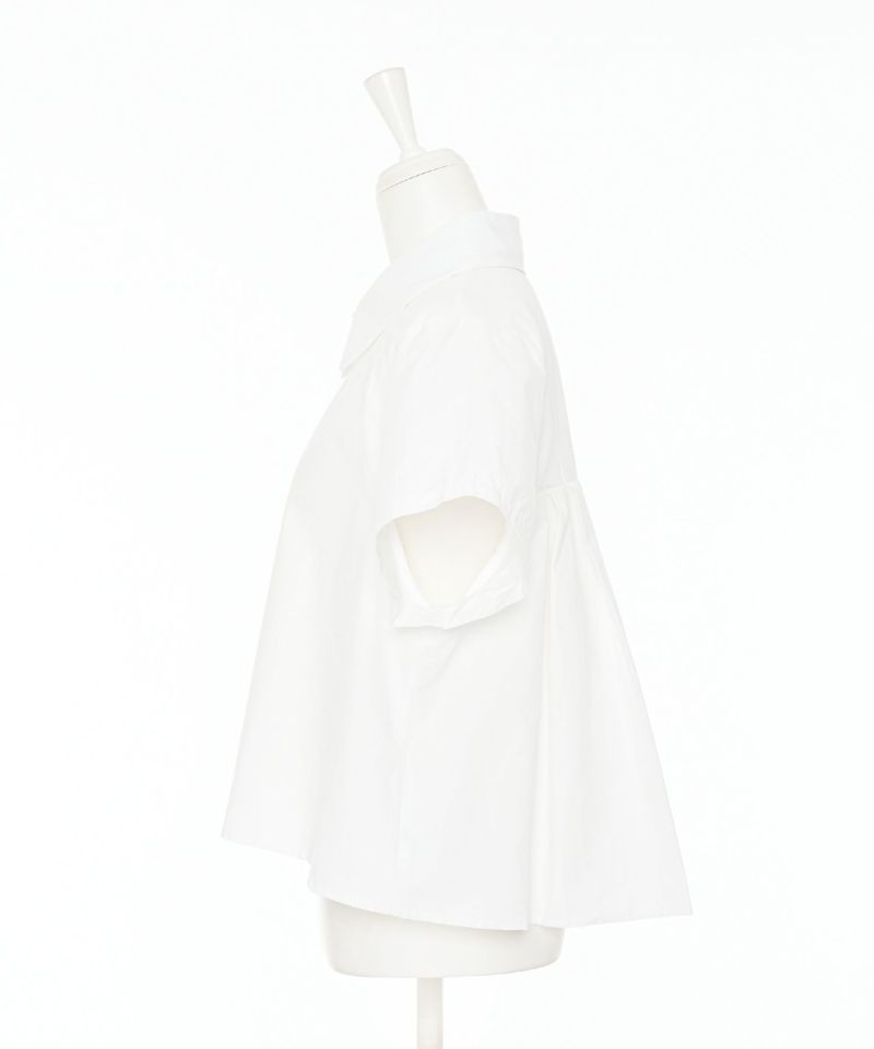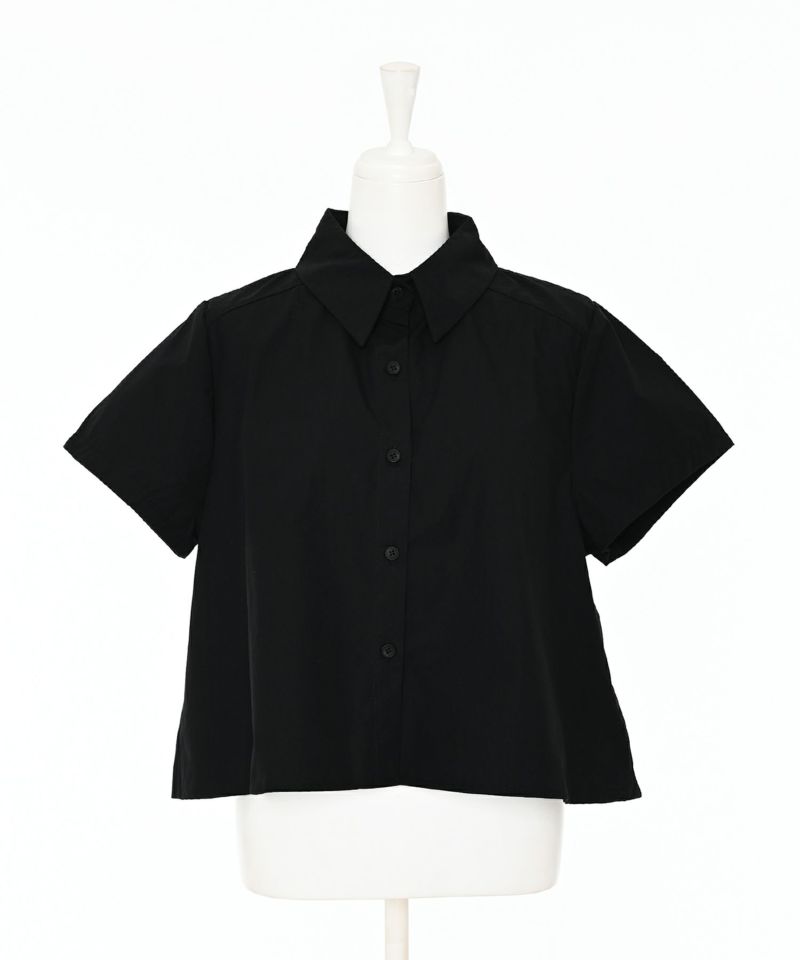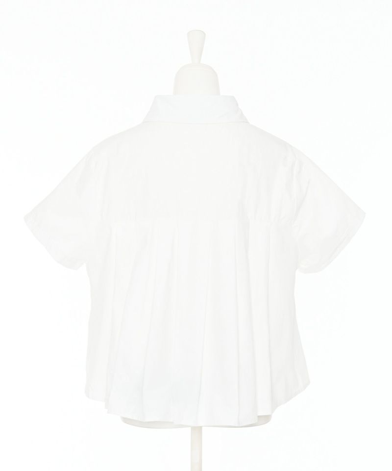前後アシンメトリーシャツ。バックにプリーツデザインが施されていて、フロントよりも少し着丈が長めに設定されているデザイン。クロップド丈&裾に向かって広がるフレアシルエットなので、タイトめなボトムスを合わせるとバランスよく着用できます。【model】H163 B78 H84