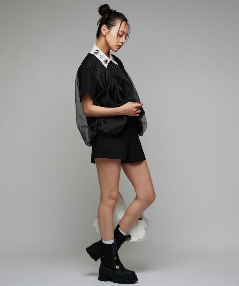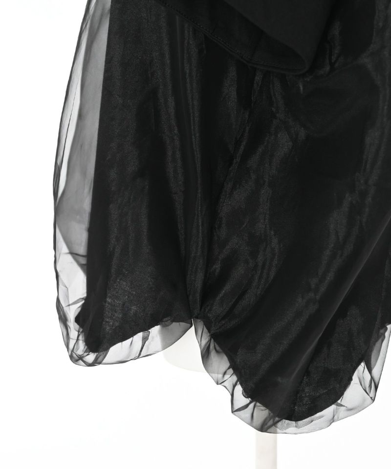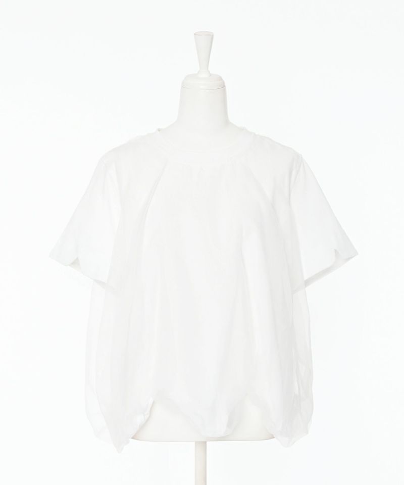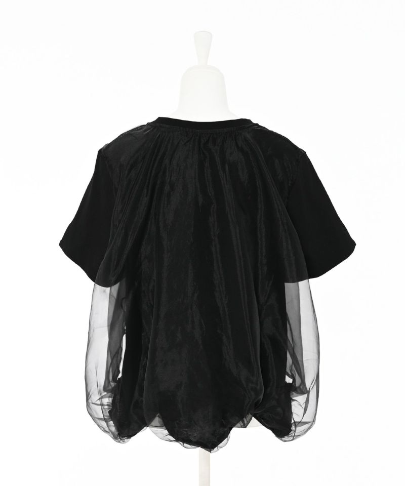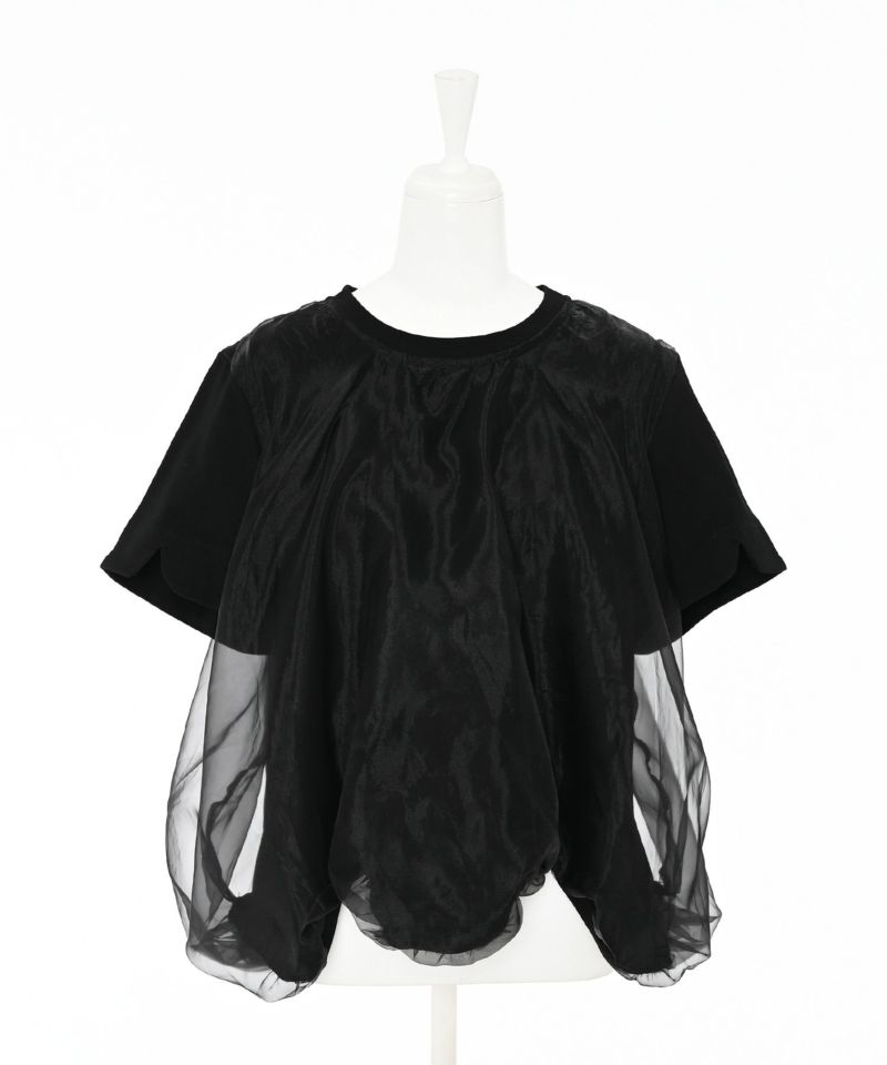 Tシャツの身頃にオーガンジー素材をドッキングさせ、丸みのあるバルーンシルエットに仕上げたトップス。裾が他にはない独特なディティールで、袖口にさりげないスリットデザインを施しています。ボリュームのあるデザインになっているので、タイトめなボトムスと相性◎【model】H163 B78 H84