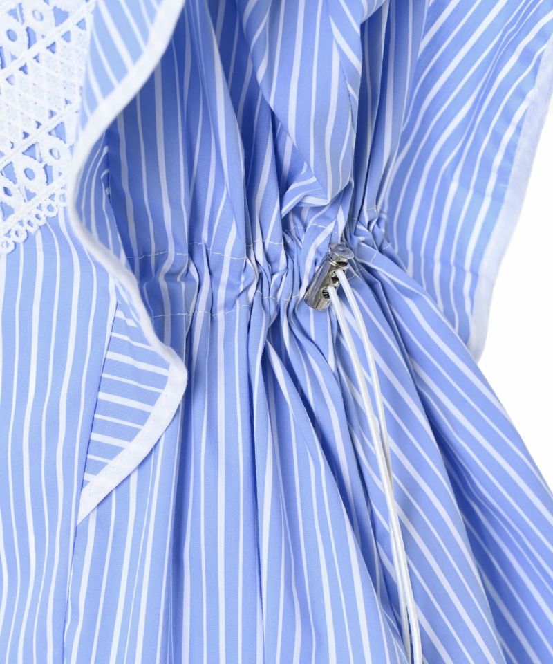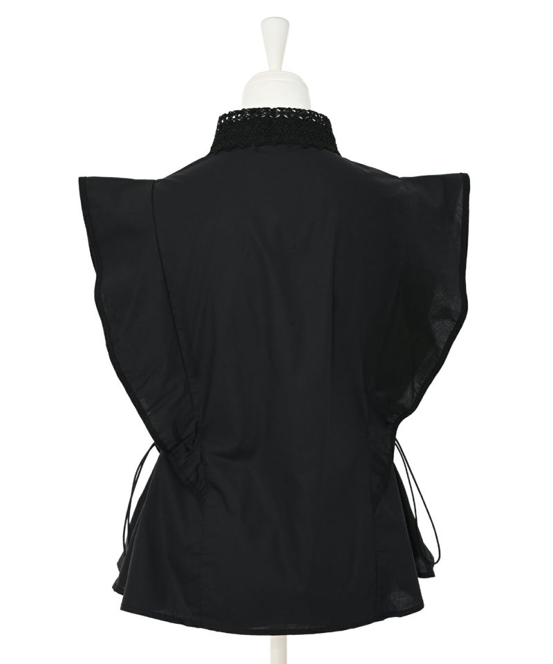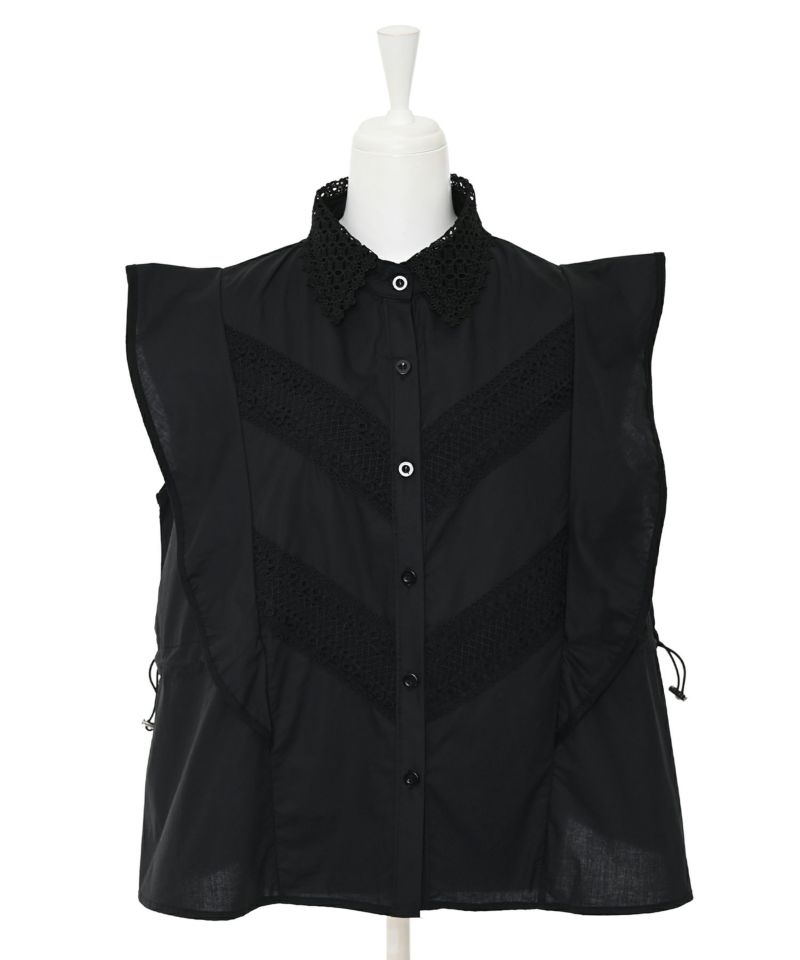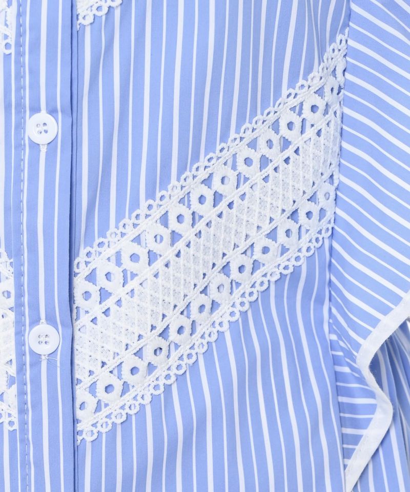 スタイリッシュなシャツブラウスに襟と身頃にレースを施したトップス。サイドのドローコードを絞るとペプラムシルエットになり、スタイルアップが叶うスタイルに。パイピングされたフリルデザインが華奢見えなのも嬉しいポイント。