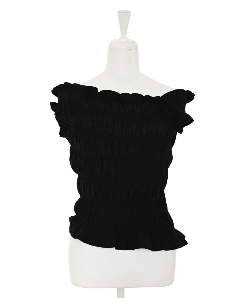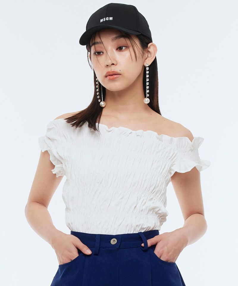 シャーリングデザインを全体に使用したオフショルトップス。左右のスリーブデザインがさりげなくアシンメトリーになっているのもポイント。ジャストなサイズ感ながらも、ボディラインをカバーしてくれるエンボス加工を使用。さらっとした生地で、風通しも良くストレスフリーで着用していただけます◎