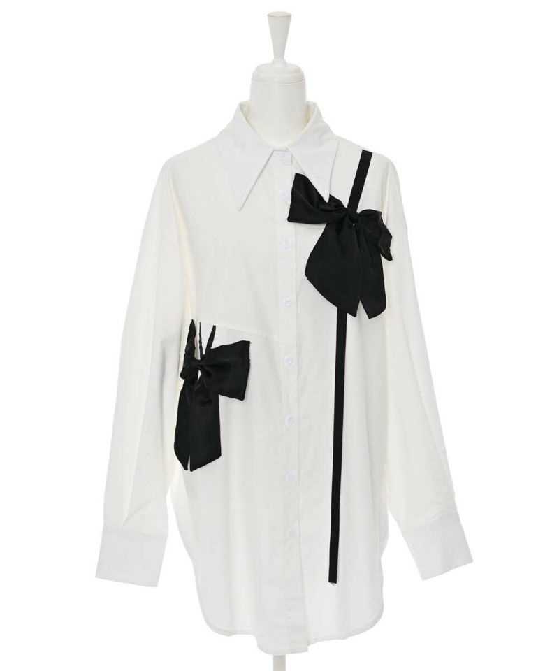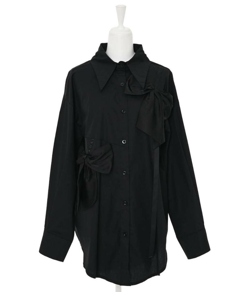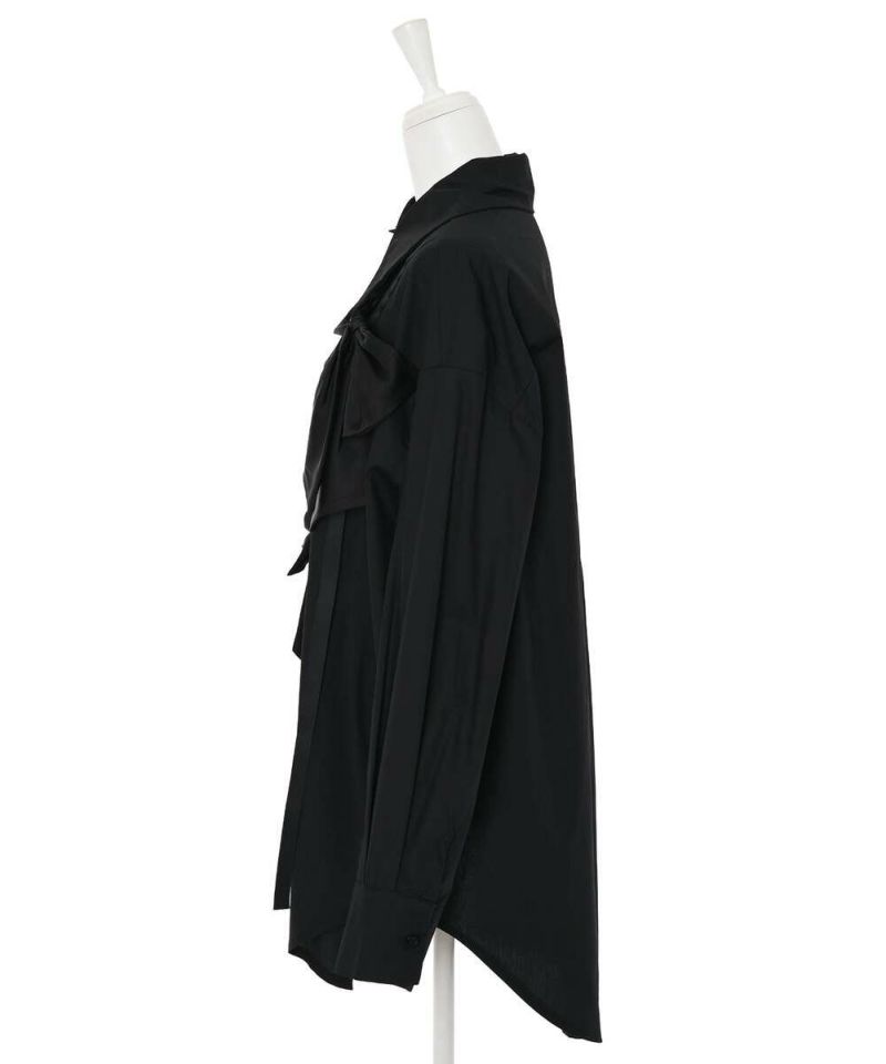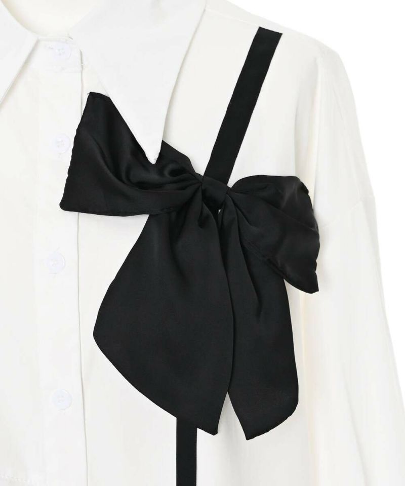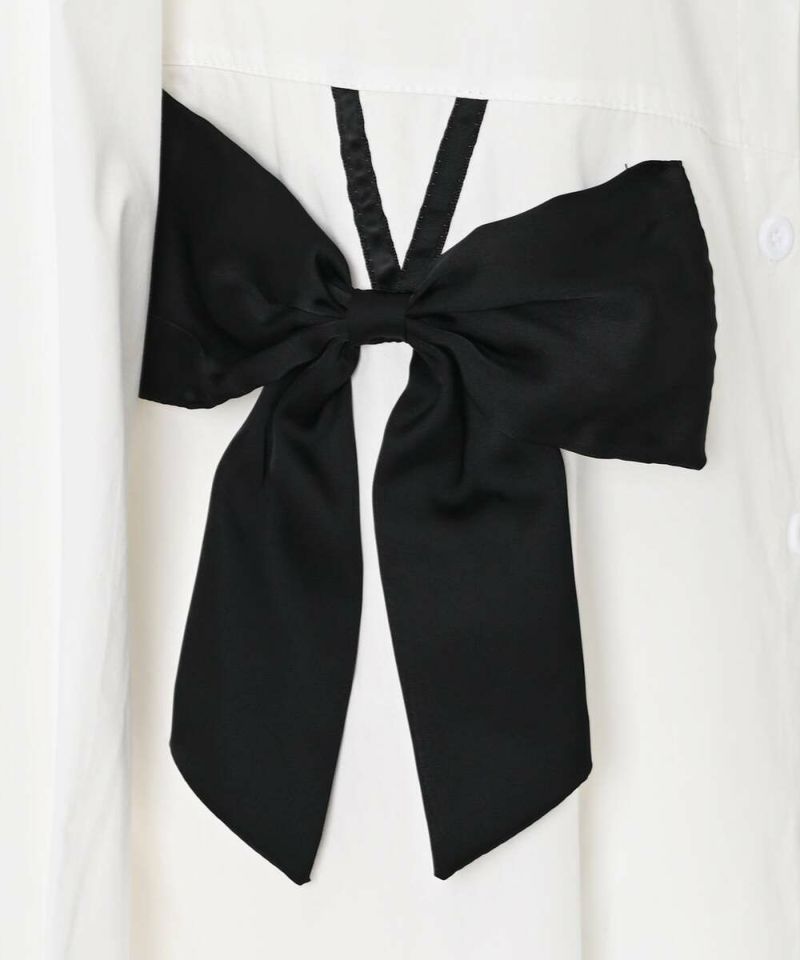 フロントの大きなサテンリボンが存在感抜群のオーバーシャツ。サイドのラインデザインがモードさをプラス。ゆったりしたオーバーサイズでミニワンピースとしても着用可能。