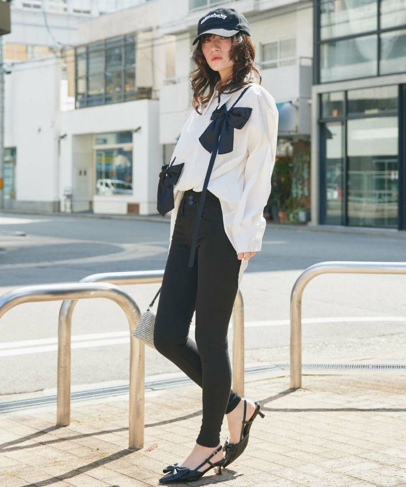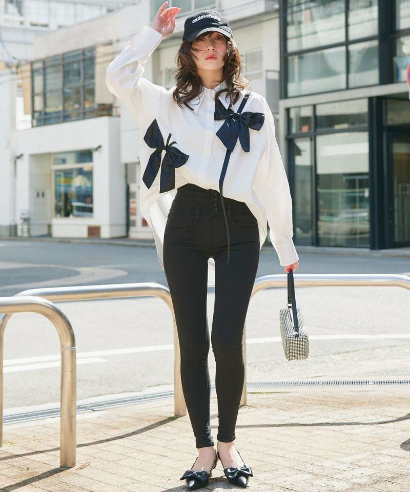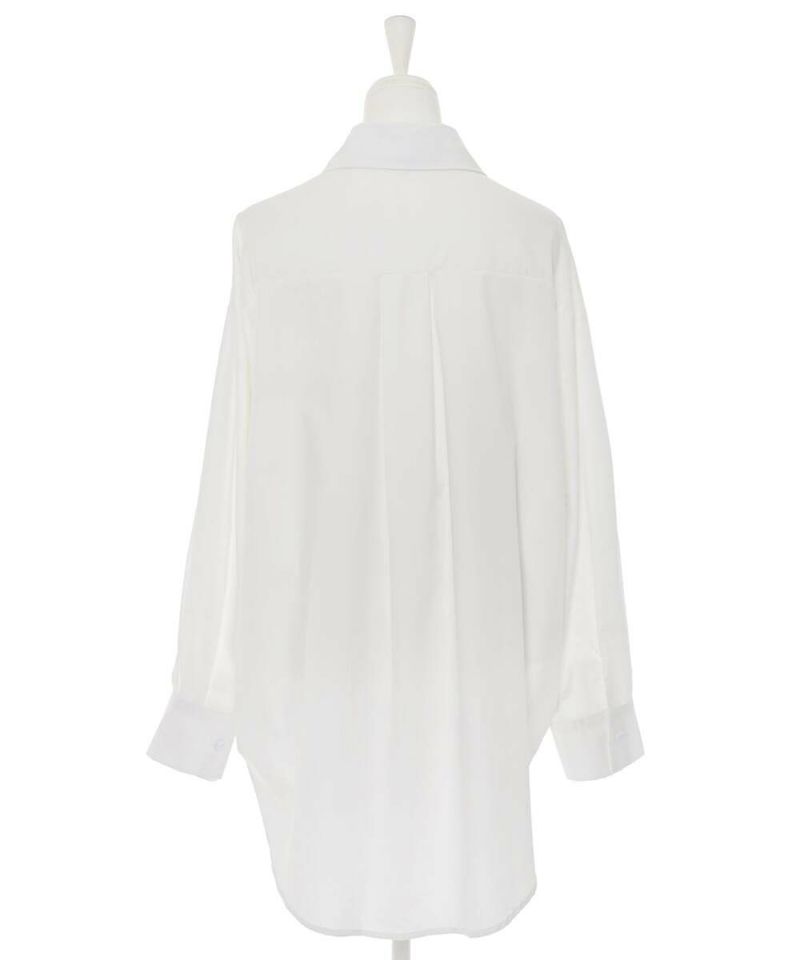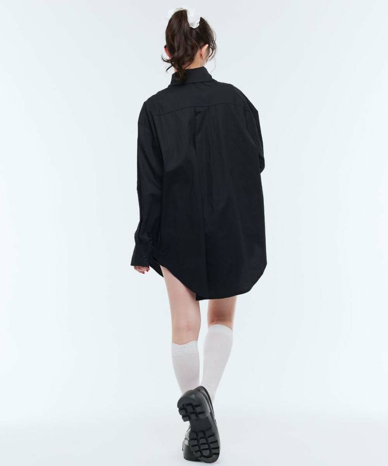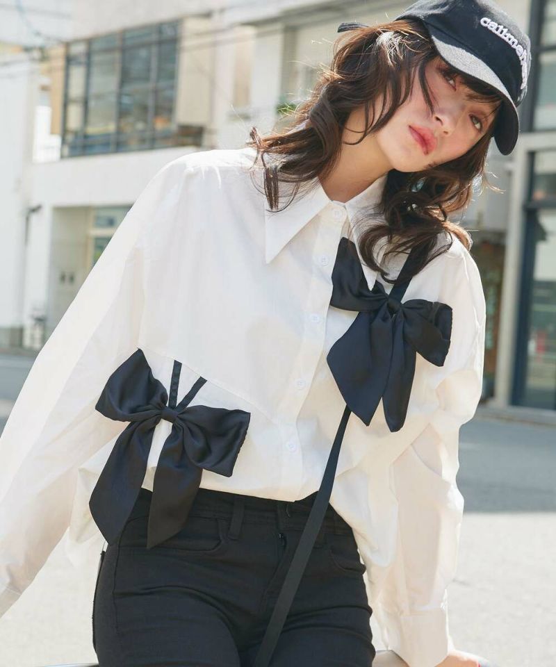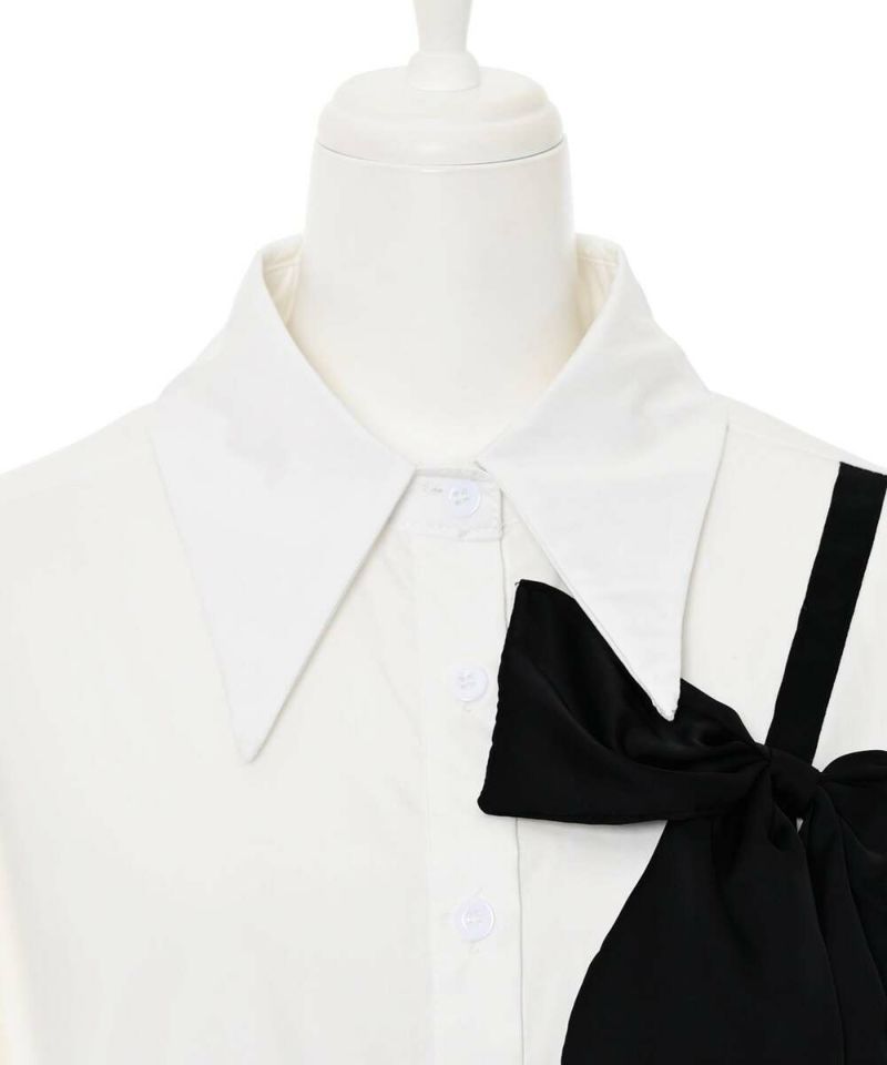 フロントの大きなサテンリボンが存在感抜群のオーバーシャツ。サイドのラインデザインがモードさをプラス。ゆったりしたオーバーサイズでミニワンピースとしても着用可能。