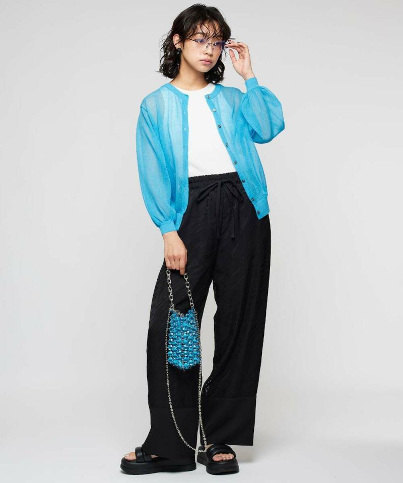 前後2WAYで着用できるシアーカーディガン。ボタンを前に持ってくるとカーディガンに、後ろに持ってくるとトップスに。シアー素材で風通しが良く、程よい肌見せが涼しげな印象に。ボタンの開閉も可能なので、羽織りとしても活躍するアイテム。【model】H156H163 B78 H84