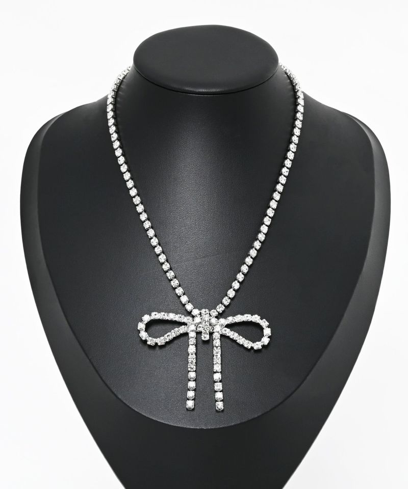 ビジューで作られたリボンモチーフが特徴的なネックレス。ご自身の好みに合わせて、チェーンの長さが調整できるのも嬉しいポイント。パーティーシーンや普段のコーデまで幅広くお使いいただけます。