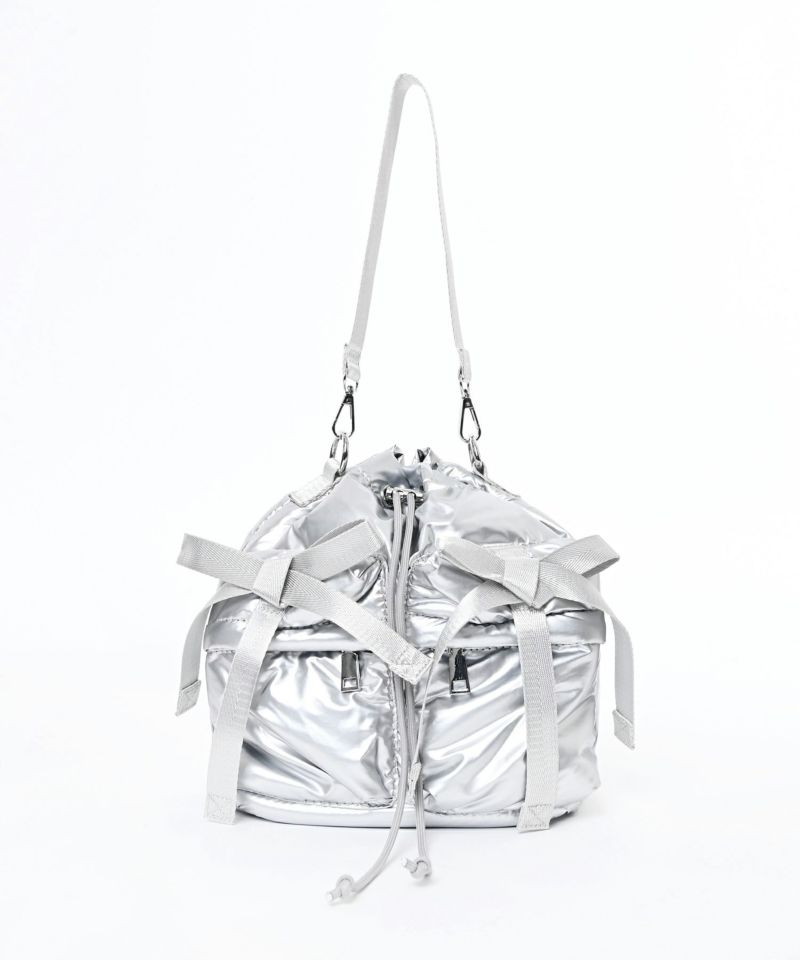 コロンとしたフォルムとフロント部分のリボンが可愛らしい2WAYバッグ。持ち手が二種類付属されている為、ショルダーバッグ・ハンドバッグとして使用可能。フロントに落ちる心配のないジップ付きのポケット2つ・内ポケット3つと収納場所も多く使い勝手◎マチがかなり広めなので、コンパクトな見た目ながら収納力抜群です。荷物が重くなっても肩に負担がかからないよう、ショルダー部分を太めに設定されています。