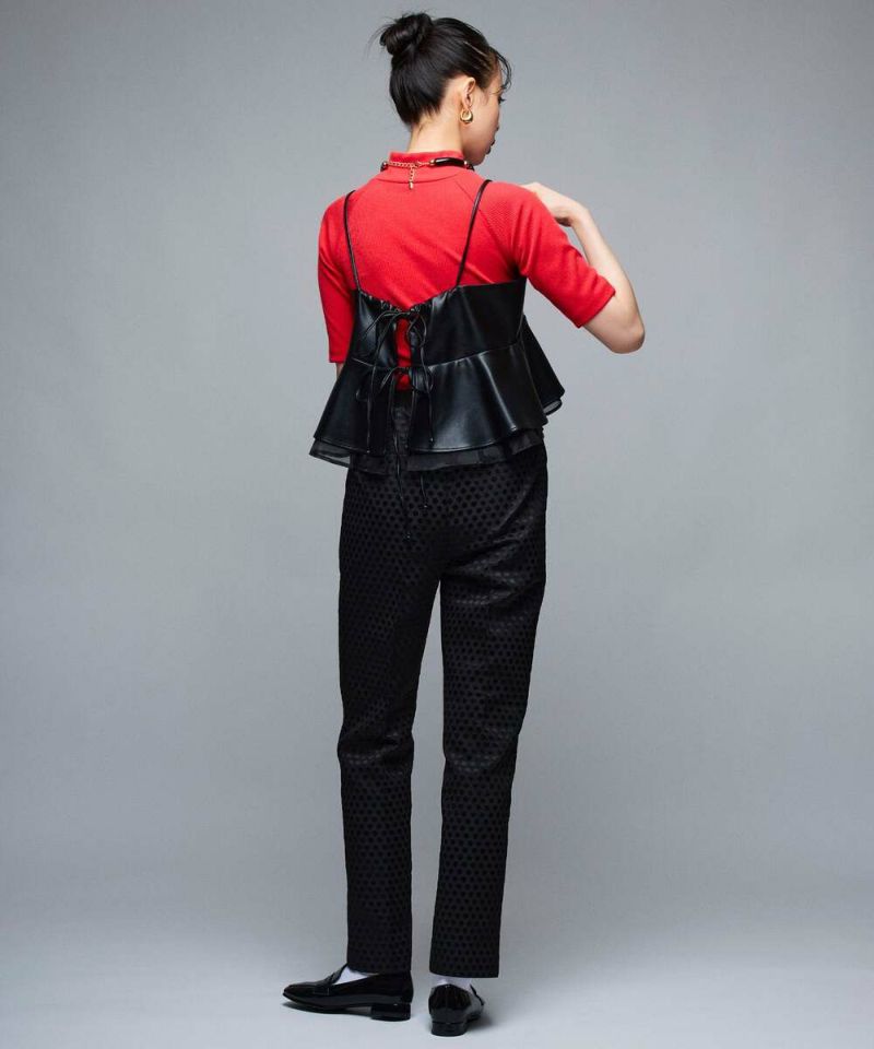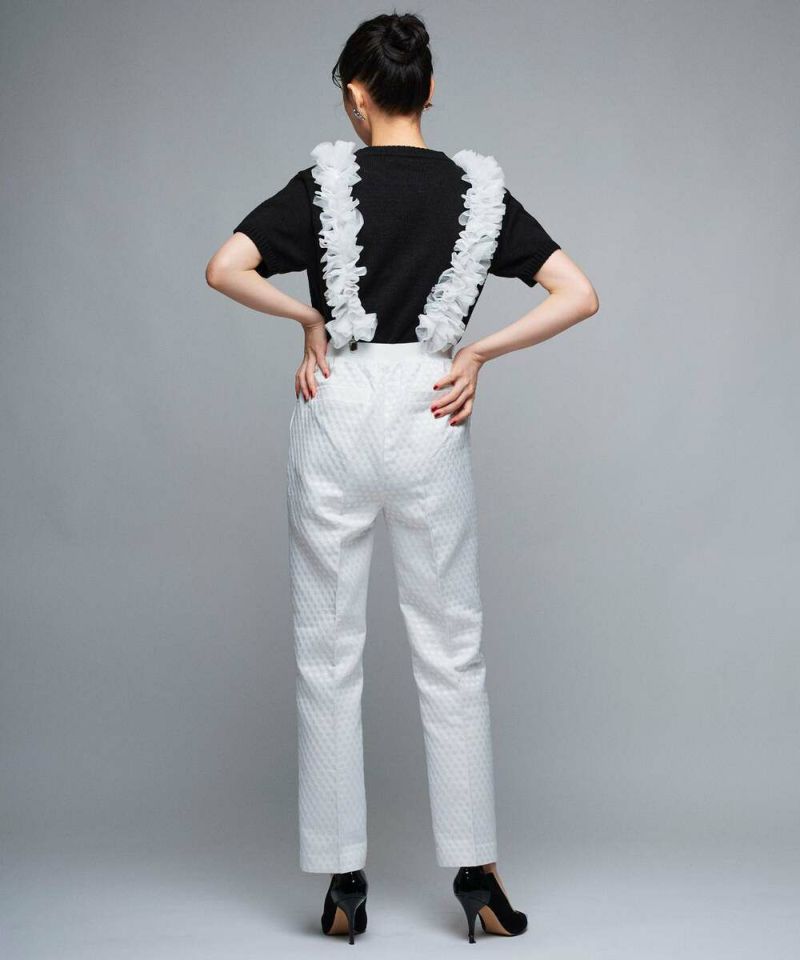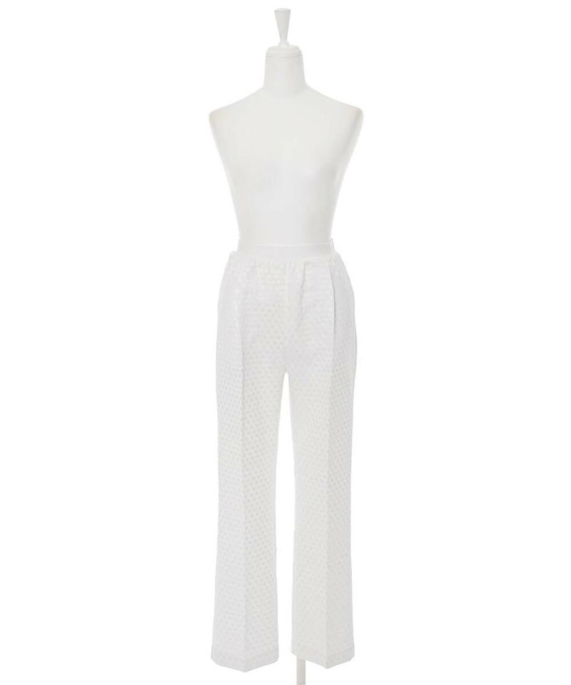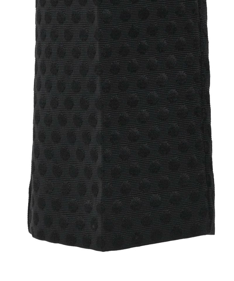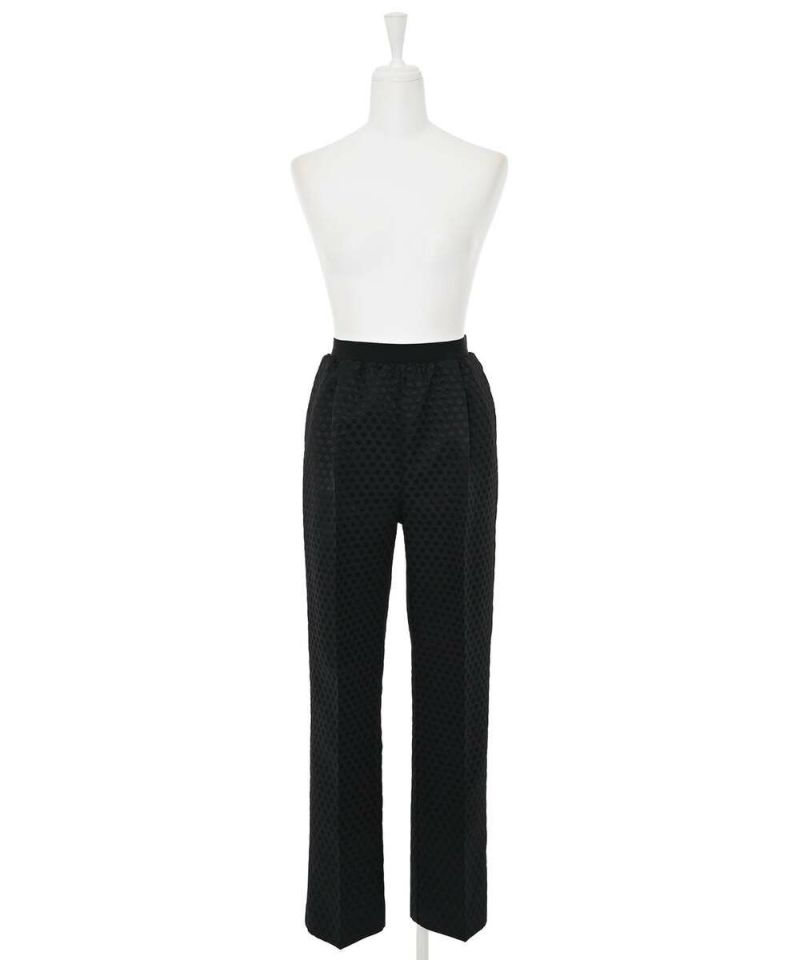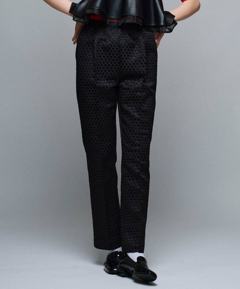 存在感のあるドットジャガード生地を使用したテーパードパンツ。ドット柄を同色でまとめていることで、コーディネートに馴染みやすくマニッシュな印象に。センタープレスが足長効果を期待。オケージョンスタイルにもピッタリなアイテム。 【model】H165 B78 H83