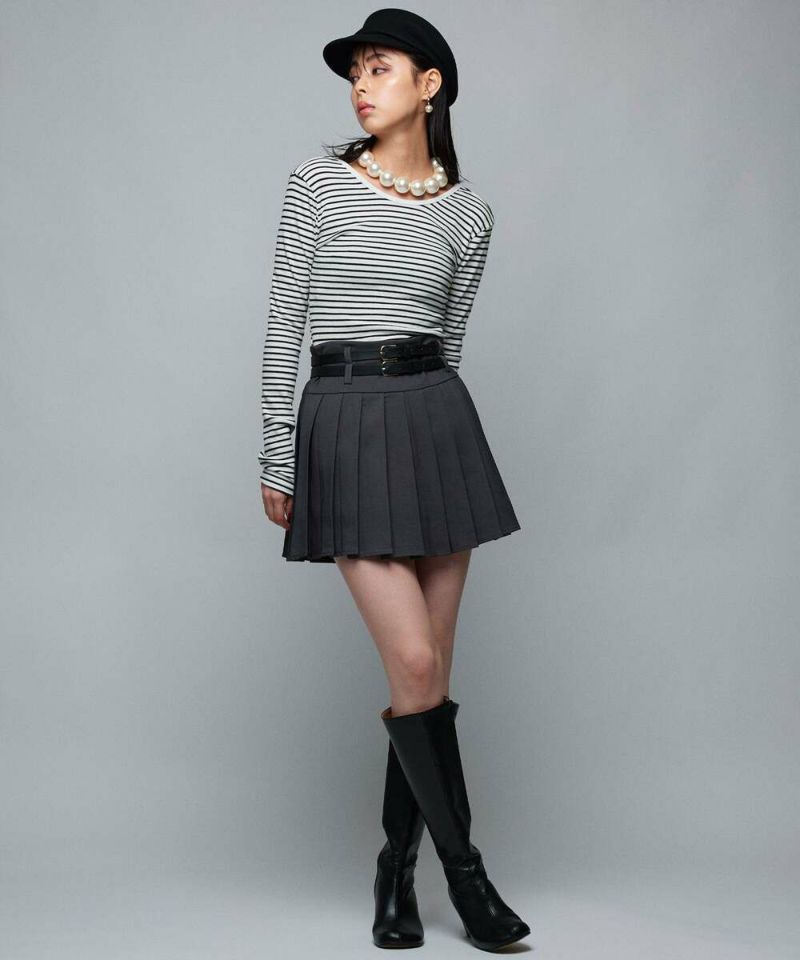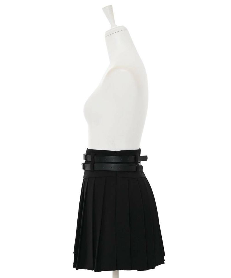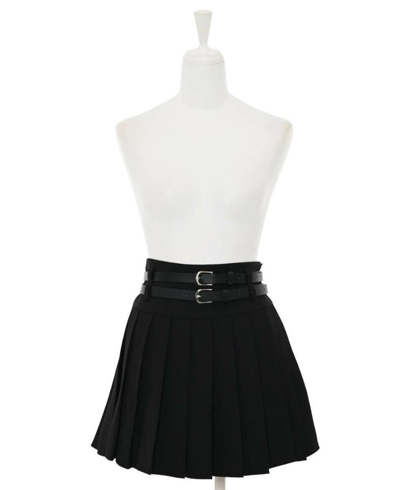 ダブルベルトがコーディネートのアクセントになるミニスカート。綺麗なプリーツデザインで、スタイルアップ効果に。トップスは、インスタイルやクロップド丈がオススメ。ベルトは取り外し可能。【model】:H165 B78 H83 / H163 B78 H84
