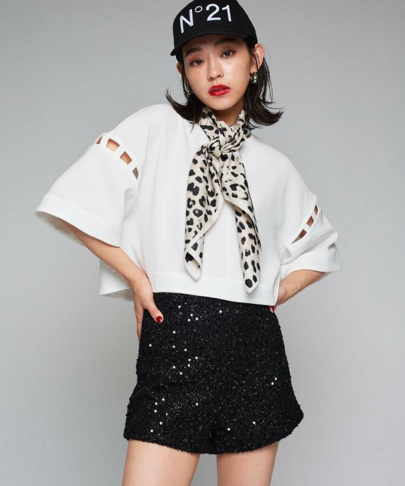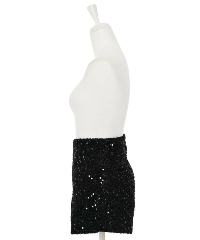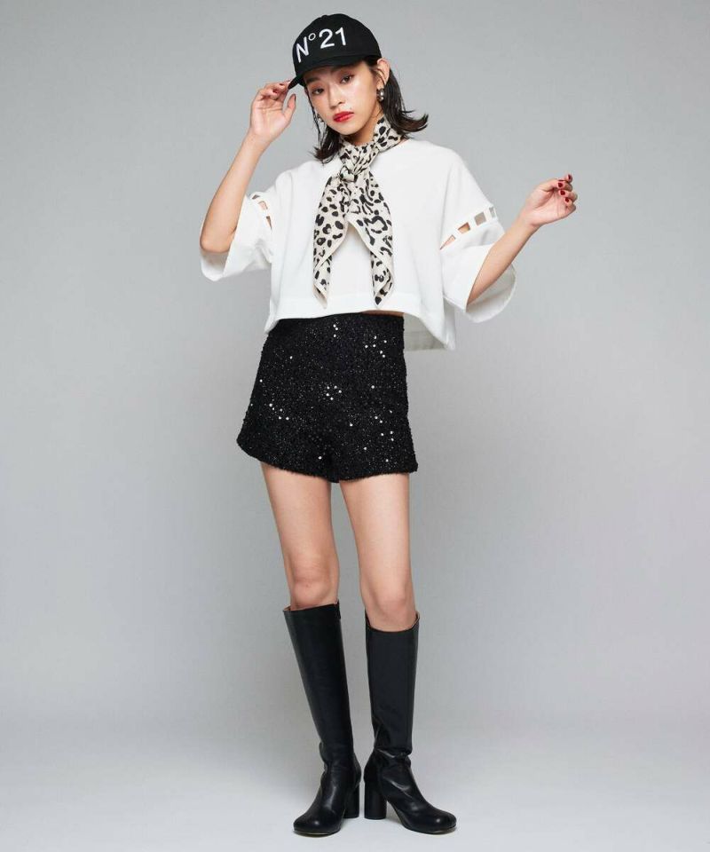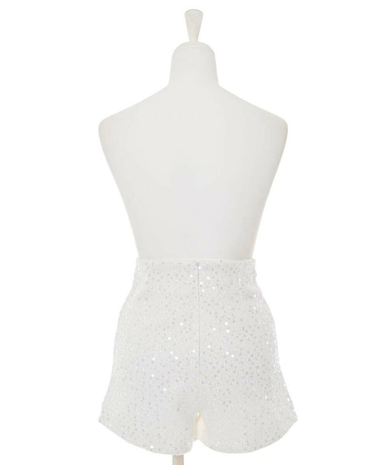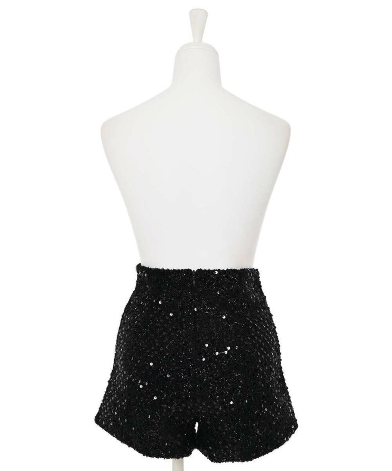 ツイード生地にスパンコールが散りばめられたシーズンムードを高めるショートパンツ。アウトスタイルで着用し、トップスからチラ見せさせるのもオススメ。カジュアルにも、綺麗めにもなる万能アイテム。【model】H163 B78 H84