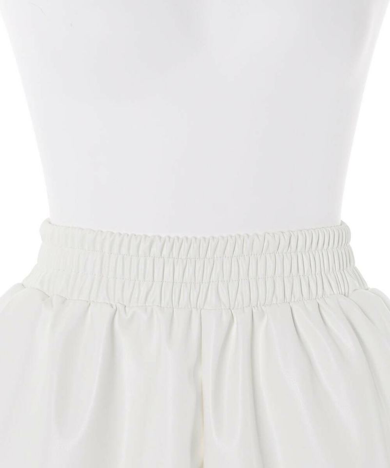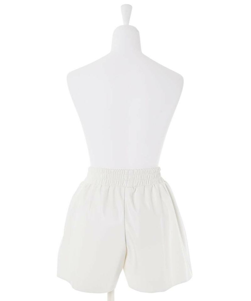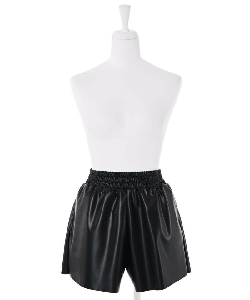 光沢のあるフェイクレザーを使用したショートパンツ。 ウエストの幅広いゴムシャーリングがストレスフリーに着用でき、ポケット付きで機能性も◎ 薄手でコンパクトなサイズ感なので、インナーパンツとしても着用可能。 秋冬にはタイツ合わせ等でシーズンライクに着用でき、春先までロングシーズン活躍するアイテム。【model】H156H163 B78 H84