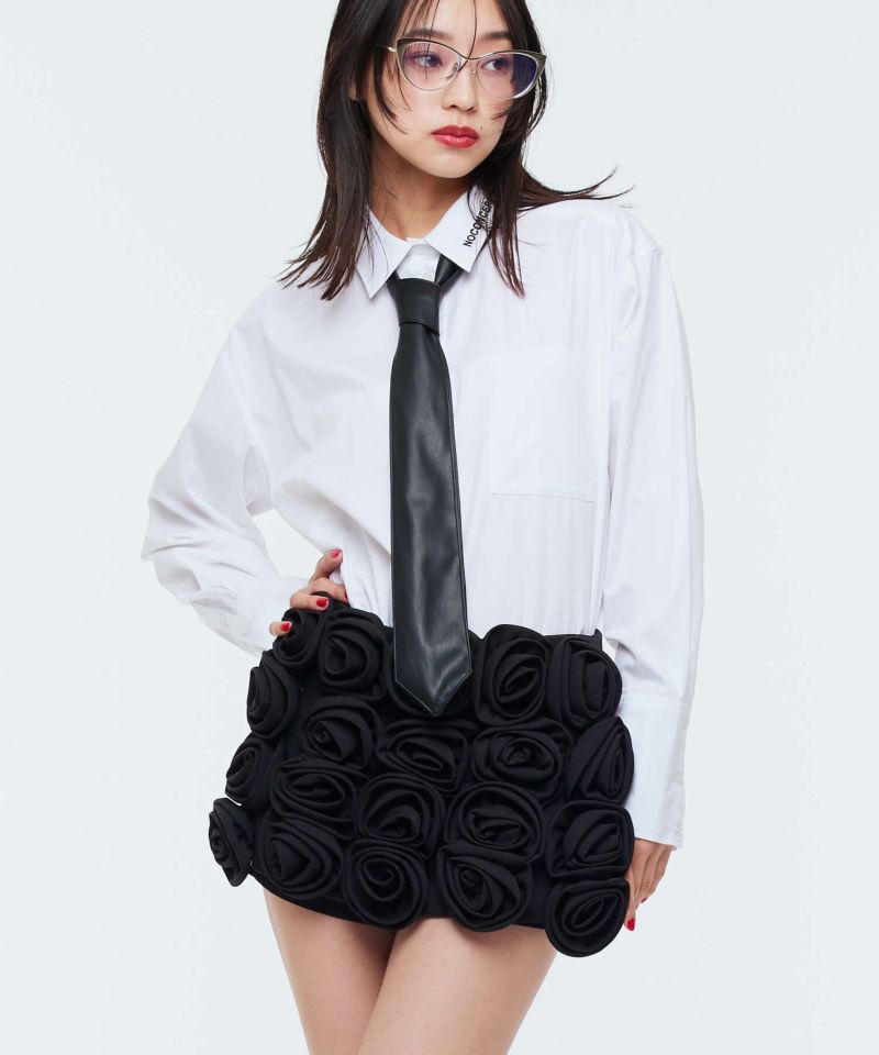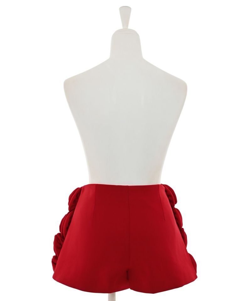 ローズモチーフが前面にあしらわれた存在感抜群なショートパンツ。前面ではミニスカートに見える前後アシンメトリーデザインが個性的で他にはないアイテム。コーディネートの主役級アイテム。【model】H165 B78 H83 / H163 B78 H84