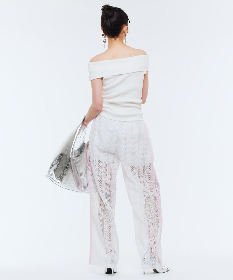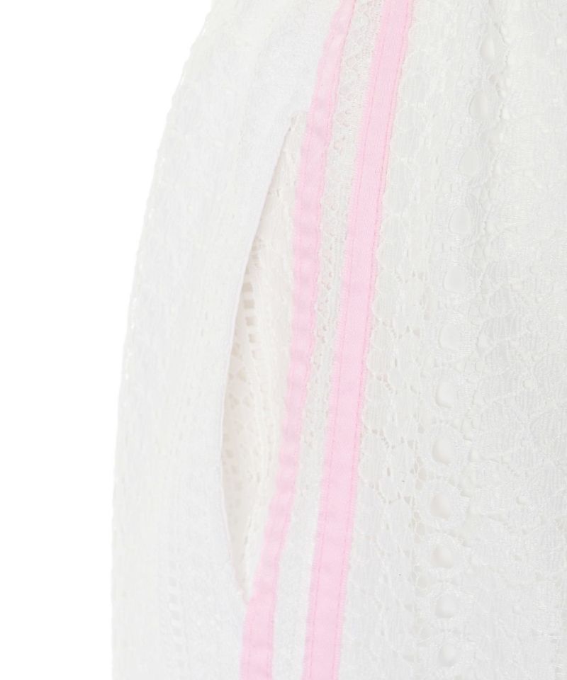 透け感のあるレース素材が女性らしさを引き立てる、ワイドパンツにラインデザインを落とし込んだアイテム。シーズンライクな可愛らしい配色もポイント。【model】H165 B78 H83 / H163 B78 H84