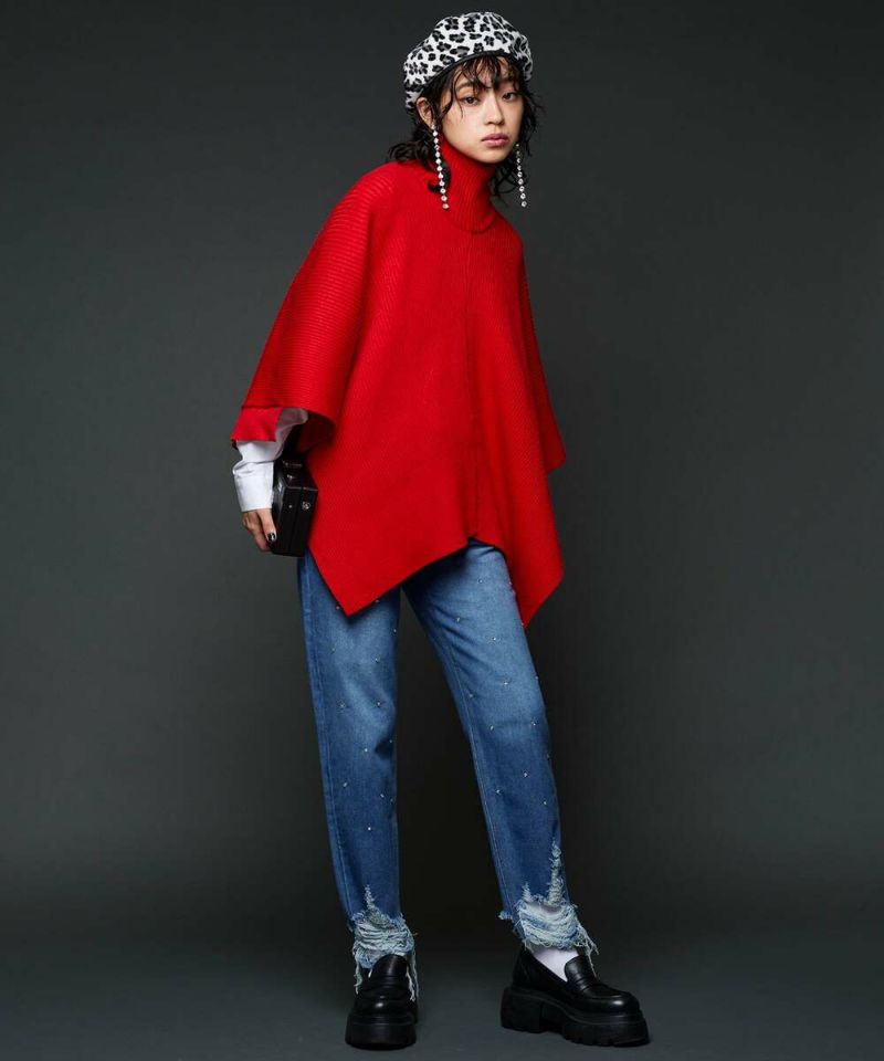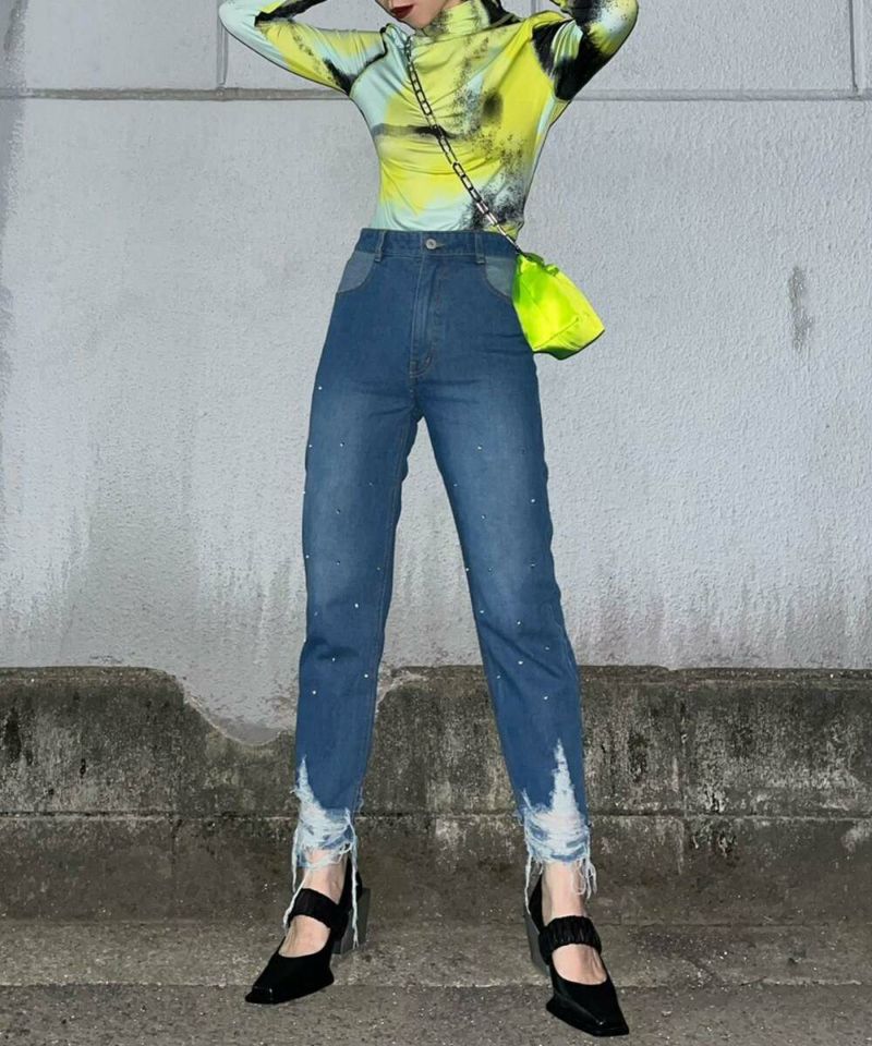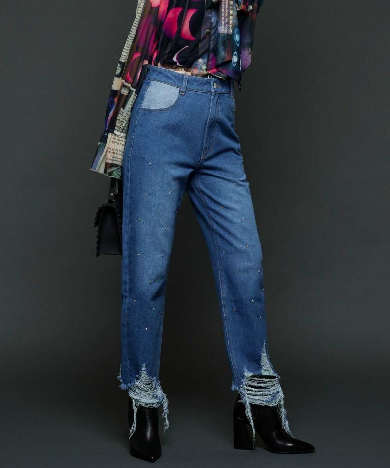 ストーンが全体的に散りばめられ、大胆なダメージ加工が目を惹く、デザイン性抜群なデニムパンツ。ハイウエスト仕様で、裾に向かって細身になるテーパードシルエットがスタイルアップ効果を◎ 【model】H163 B78 H84/156cm