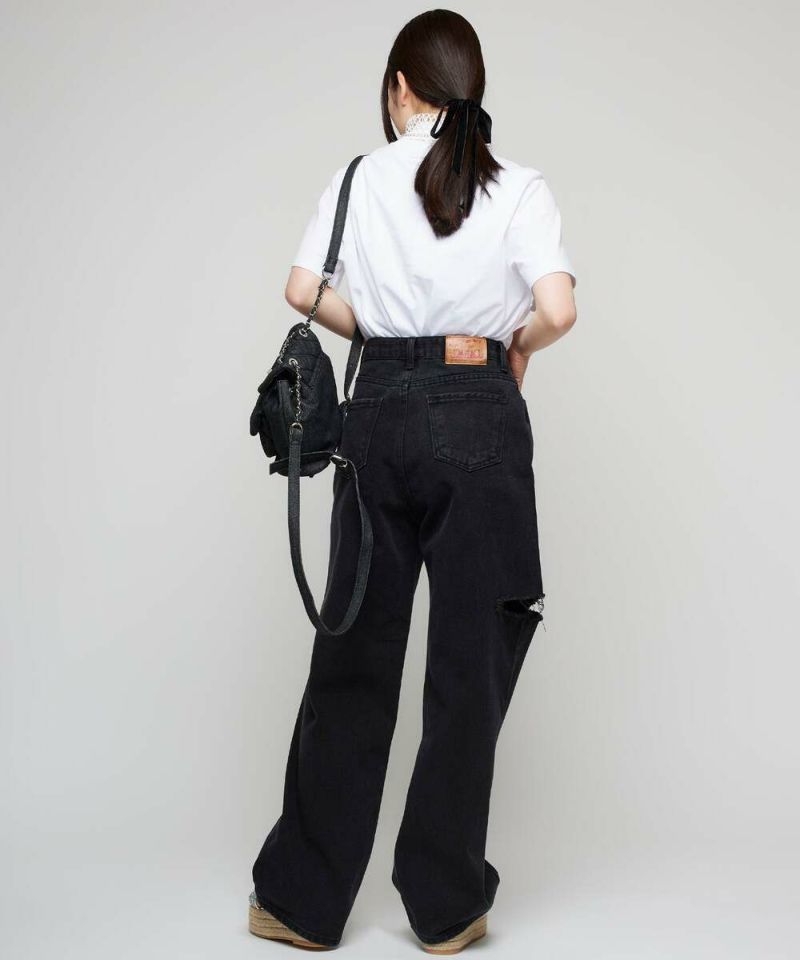 ウエスト部分がアシンメトリーでクロスデザインになったハイウエストデニム。浅めのカットデザインが、さりげない肌見せとなり安心して着用可能。裾にかけて程よくゆとりのあるサイズ感が魅力。※デニムのお色味は、ワンウォッシュデニムとなるため、バックタグにヴィンテージ感がございます。ご了承ください。【model】H156H165 B78 H83