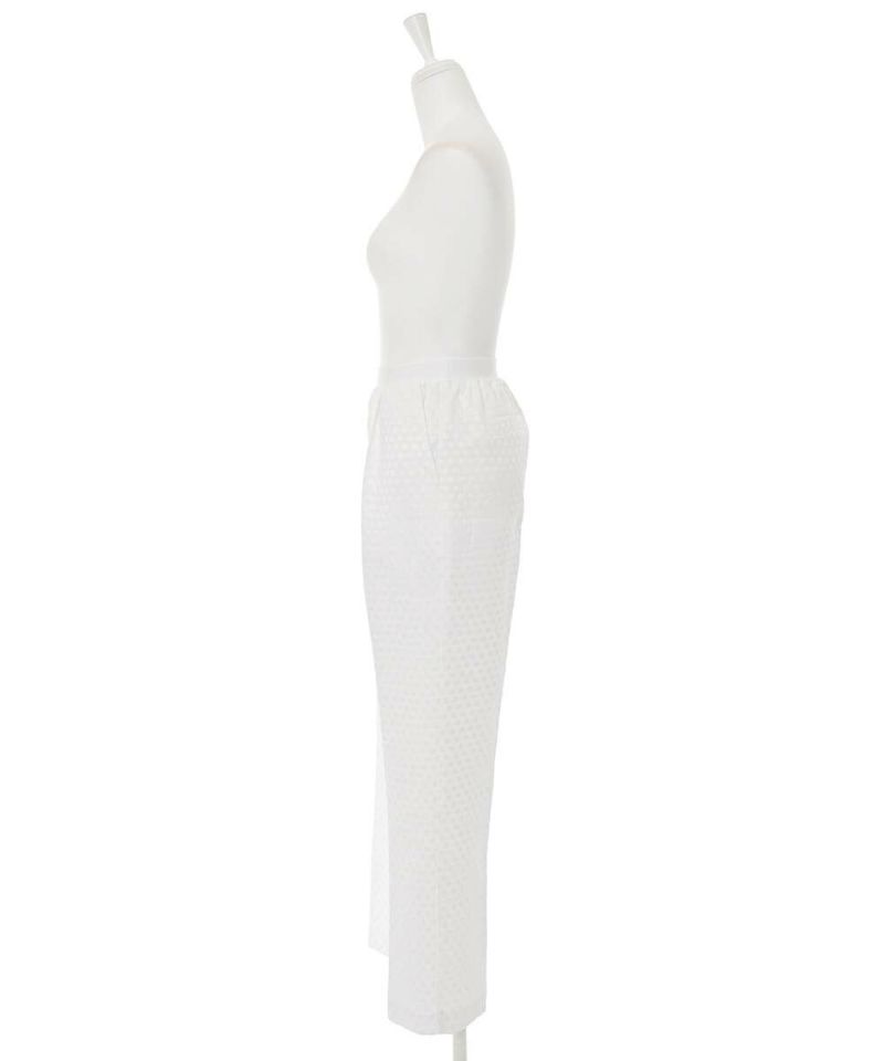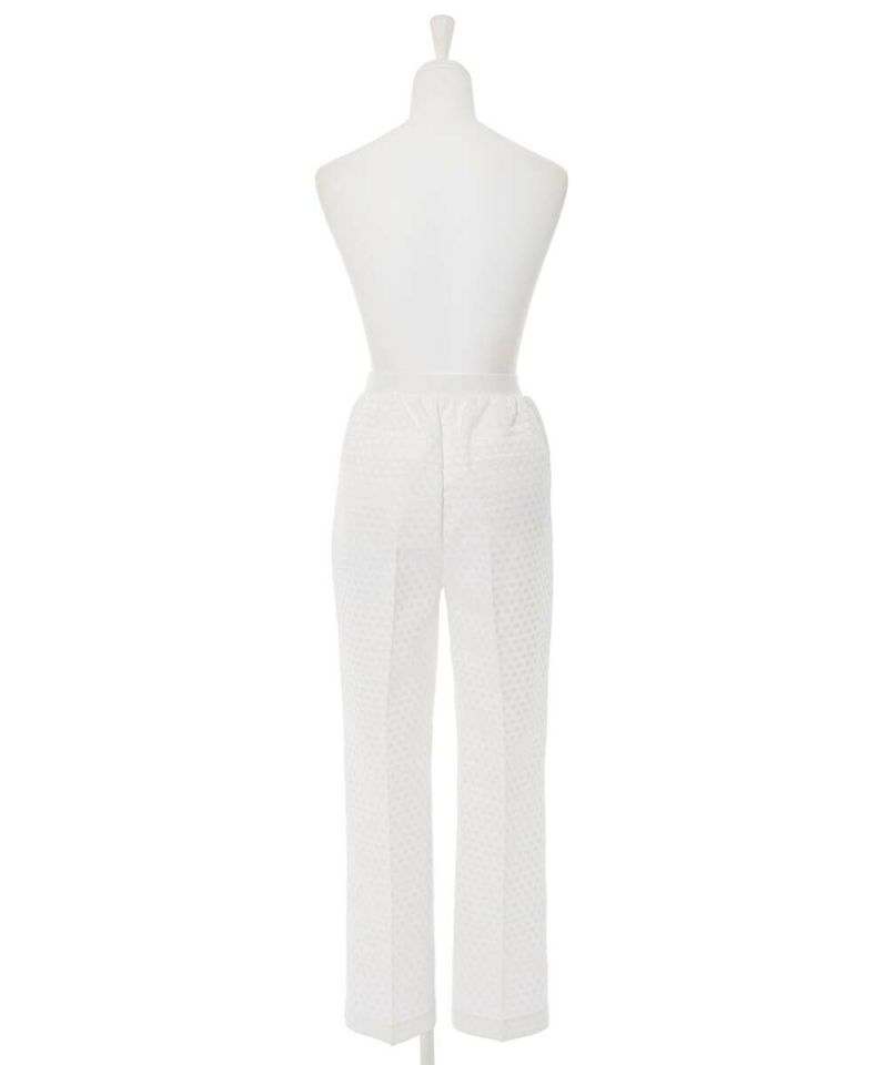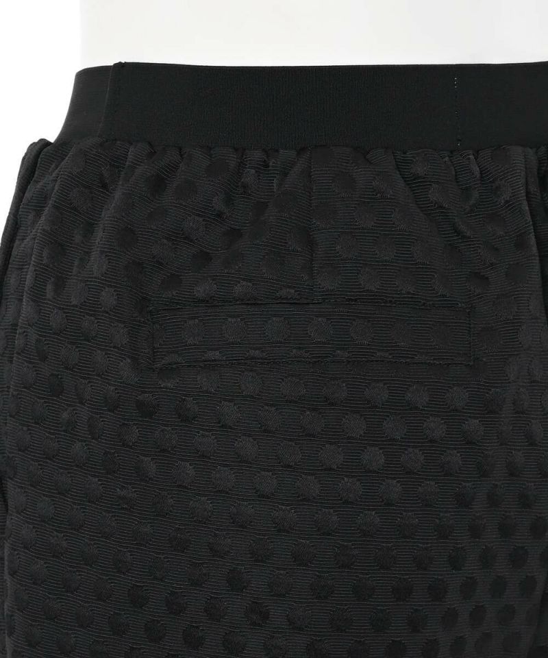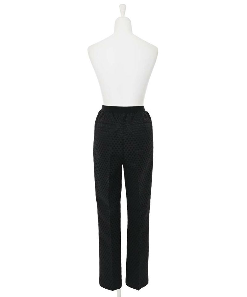 存在感のあるドットジャガード生地を使用したテーパードパンツ。ドット柄を同色でまとめていることで、コーディネートに馴染みやすくマニッシュな印象に。センタープレスが足長効果を期待。オケージョンスタイルにもピッタリなアイテム。 【model】H165 B78 H83