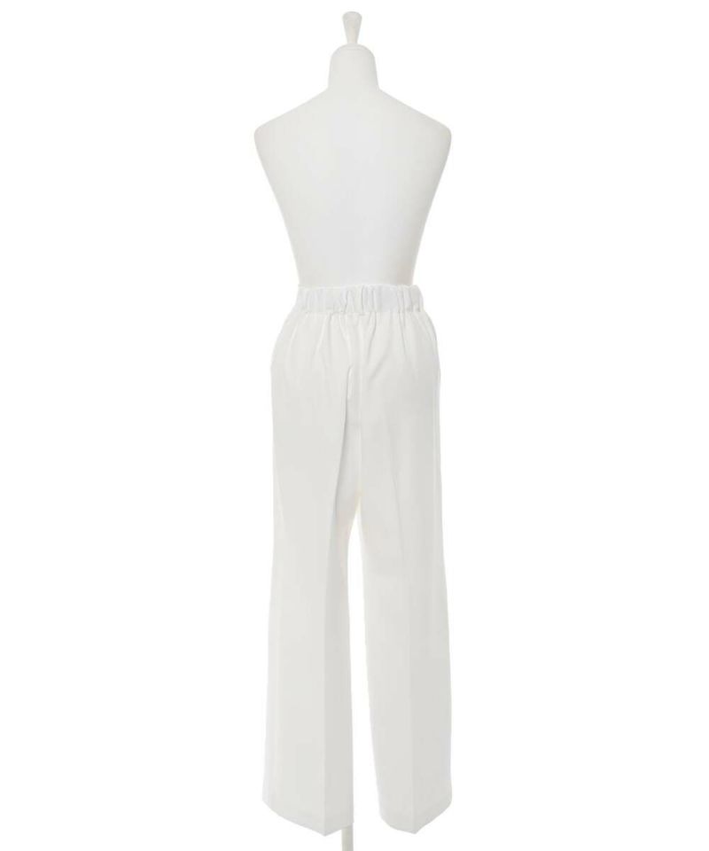 裾にかけて少しルーズなワイドパンツ。センタープレスが高級感をプラスし、スタイルアップ効果を。ウエストゴムを採用し、ストレスフリーに綺麗見せさせてくれるアイテム。オケージョンスタイルにもオススメ。
