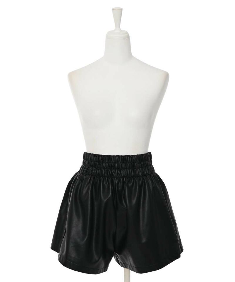 ベーシックなフェイクレザーショートパンツ。ウエストの幅広いゴムシャーリングがストレスフリーに着用。ゆとりのある広めの裾がスタイルアップ効果を。【model】:H165 B78 H83 / H163 B78 H84