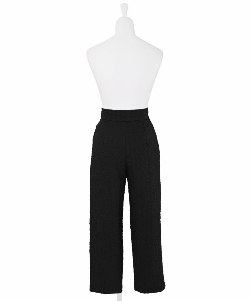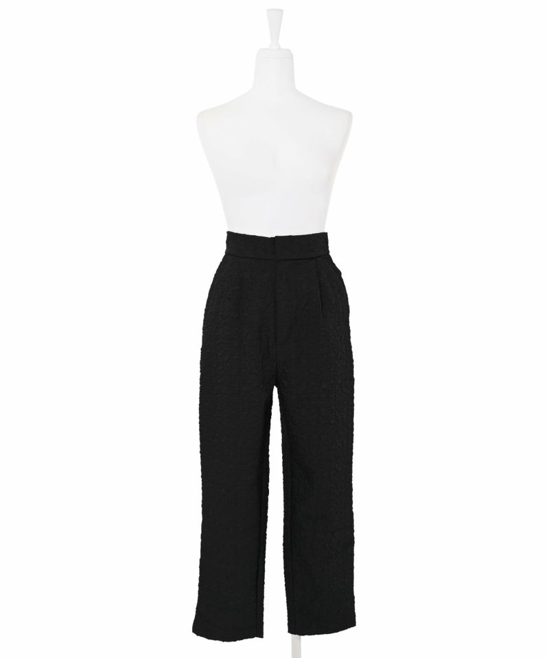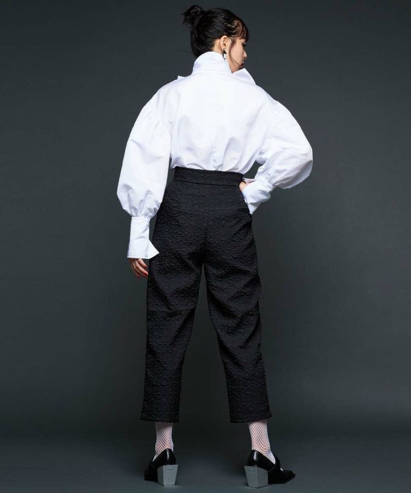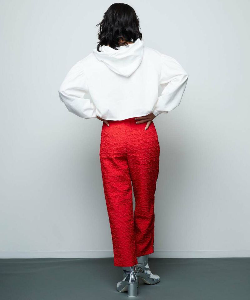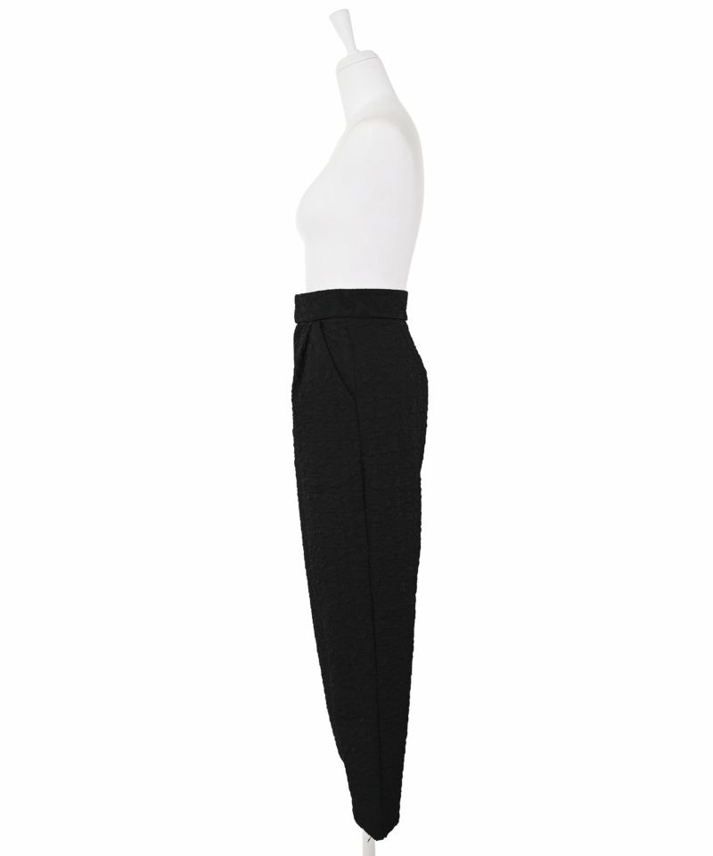 トレンドのフクレジャガード生地を使用したパンツ。ウエストタックとハリ感のあるシルエットが綺麗めスタイルにピッタリ。カジュアルスタイルでも着回し可能なテーパードパンツはマストアイテム。GO-YA MA-1とのセットアップがオススメ。【model】:H163 B78 H84 / H165 B78 H83